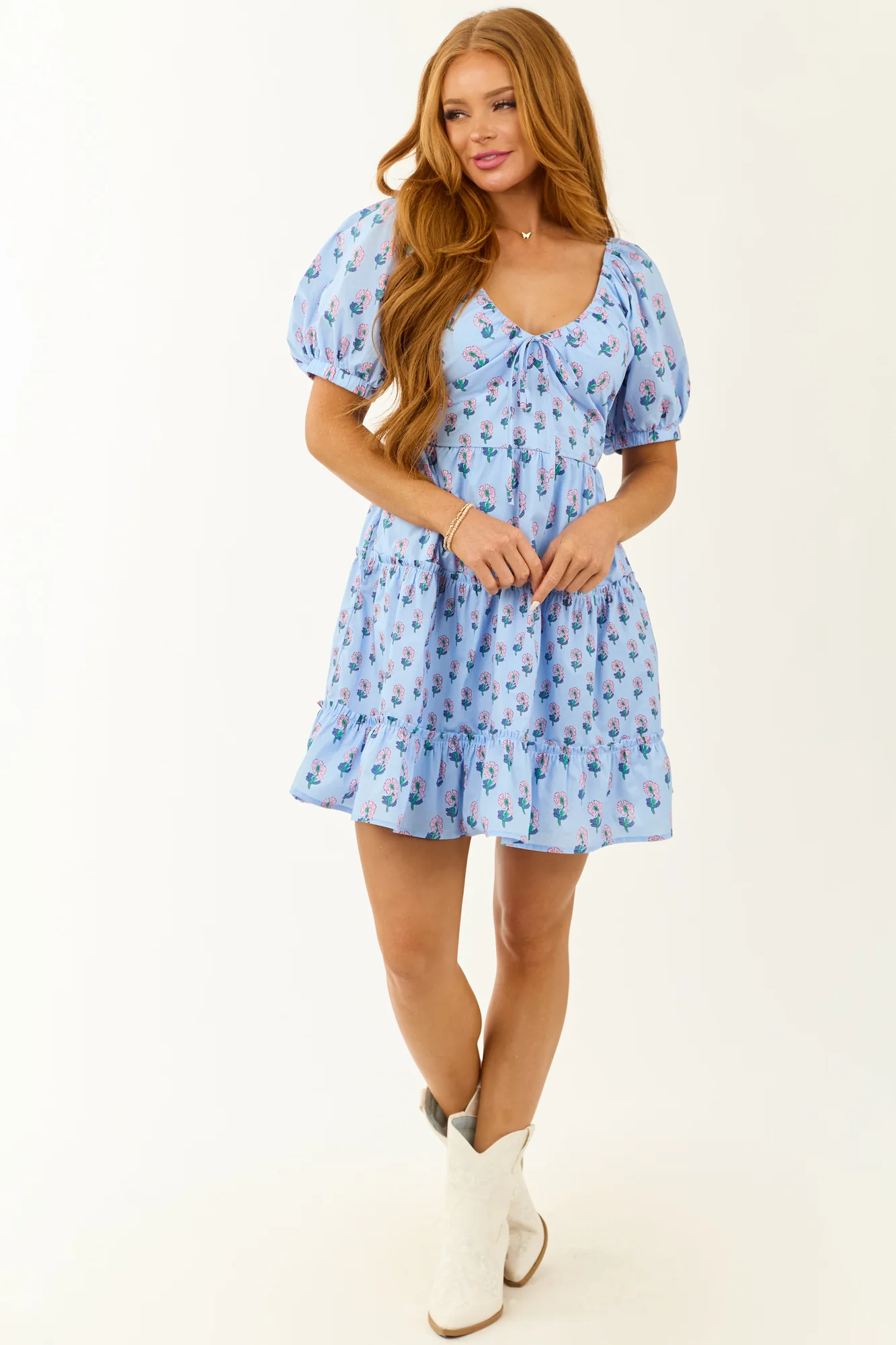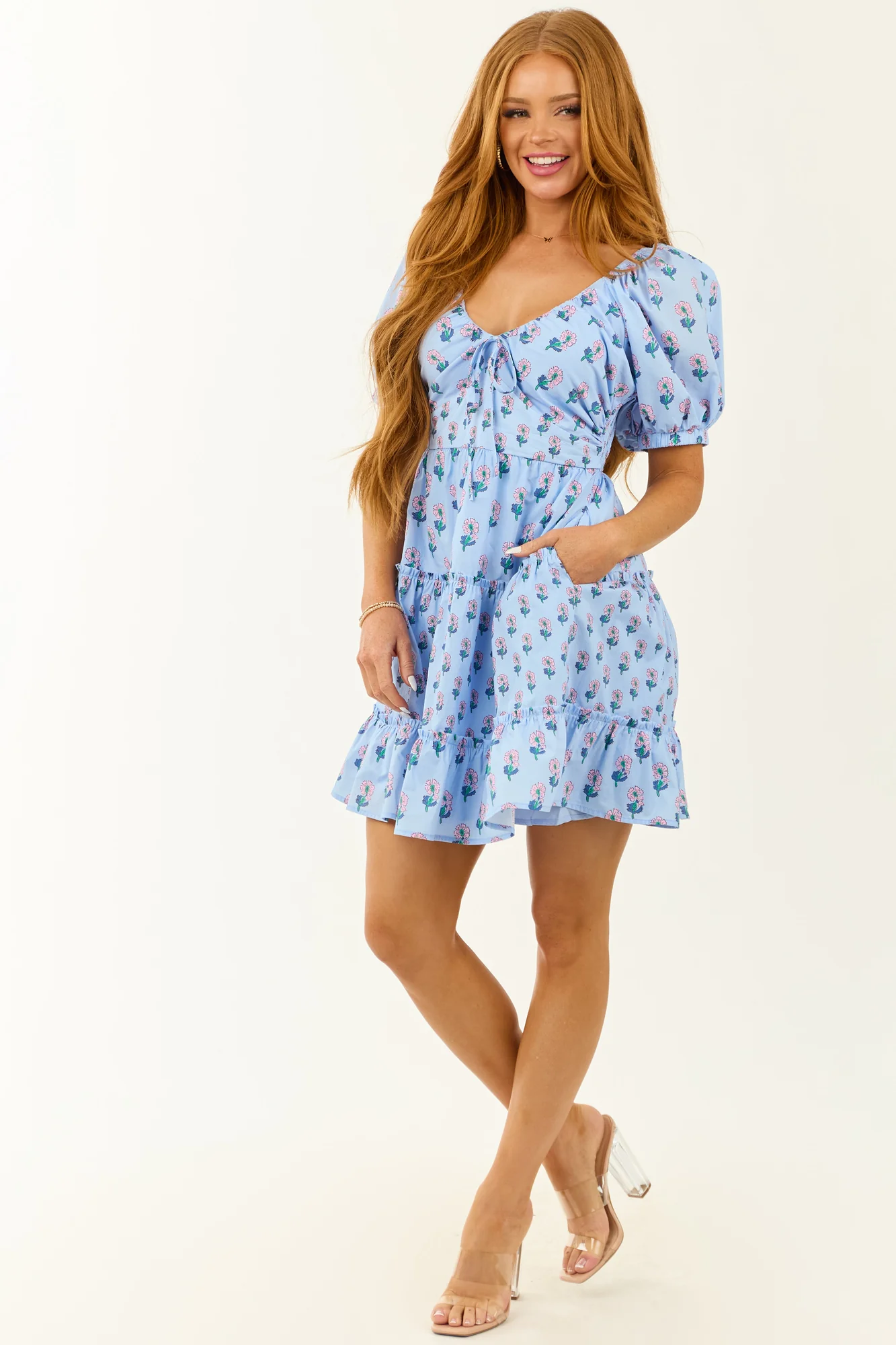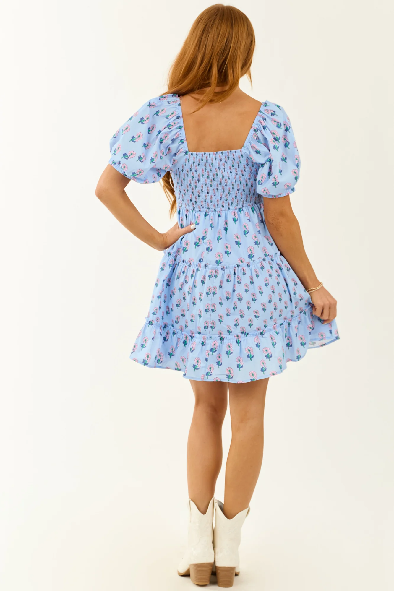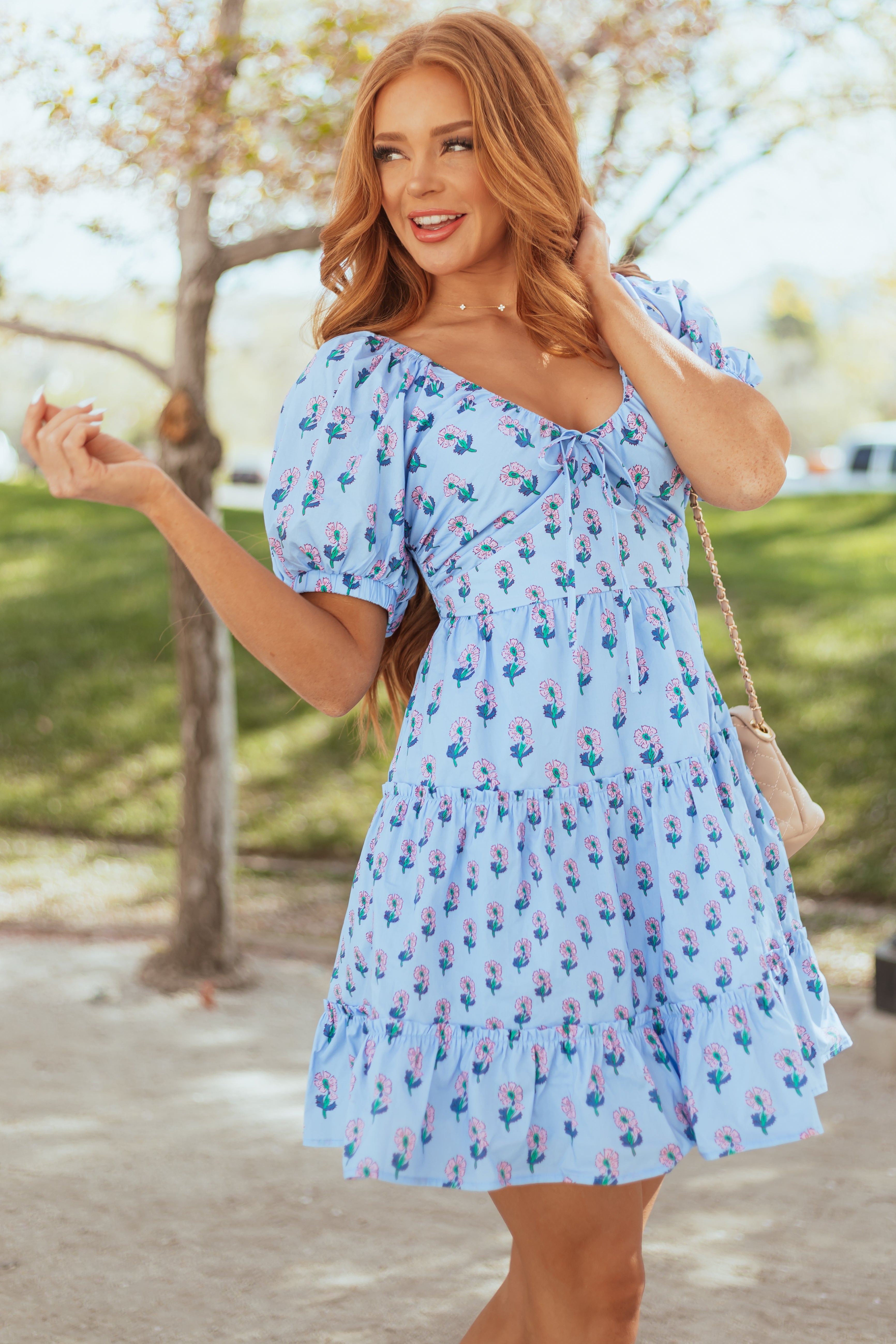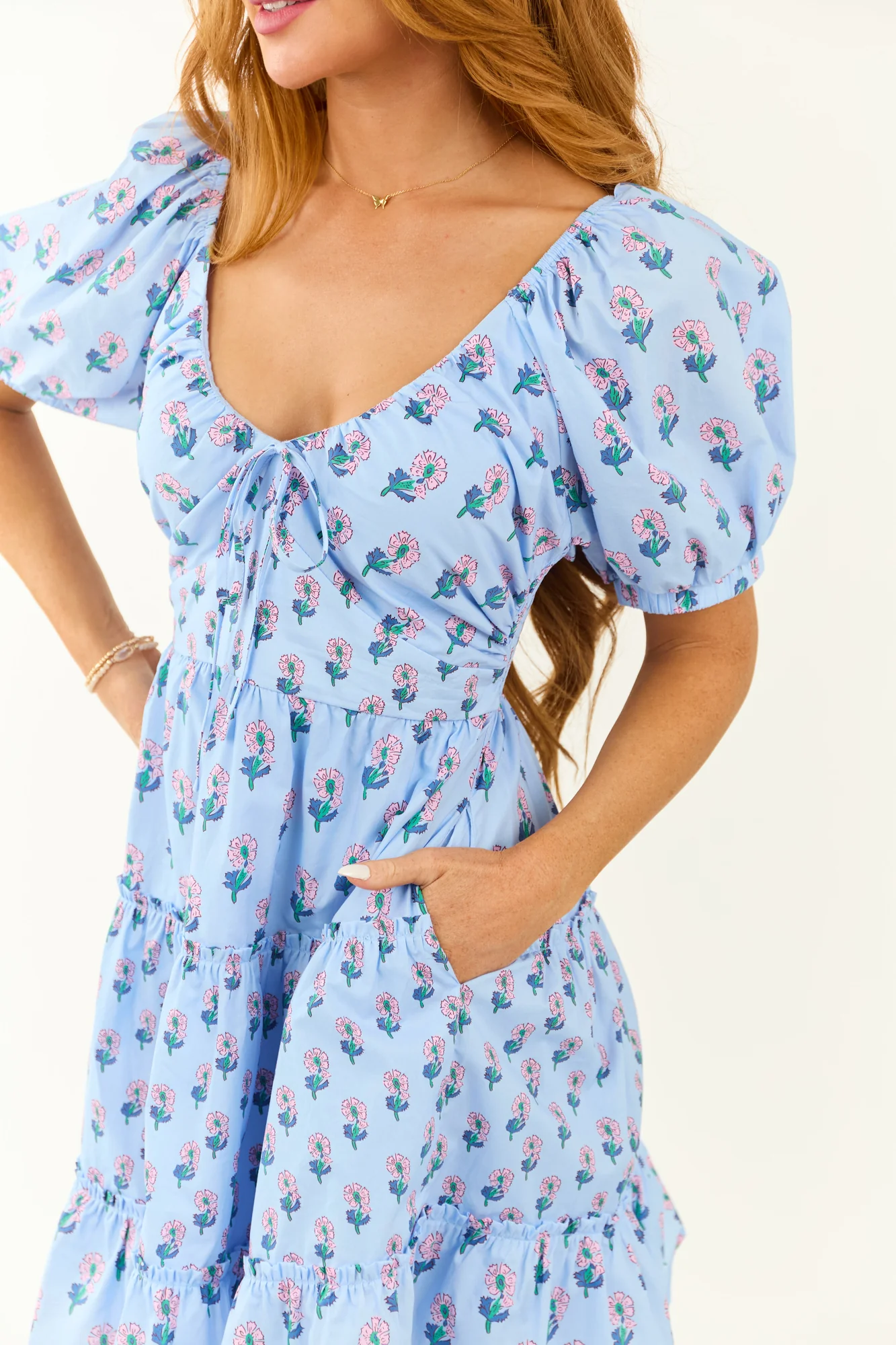 This enchanting cottagecore dress features puff sleeves, a tiered design, and a flattering fit. Ideal for warm weather events, it comes in Cornflower, Carnation, Jungle Green, and Cobalt floral prints. Made of 100% Cotton with a smocked back, elastic V neckline, non-adjustable bust tie, and ruffled hemline. Complete with convenient side pockets and lining. Available sizes to L. Care instructions: Hand wash cold, do not bleach, line dry. Model wears size Small; Height 55, Bust 33, Waist 24.