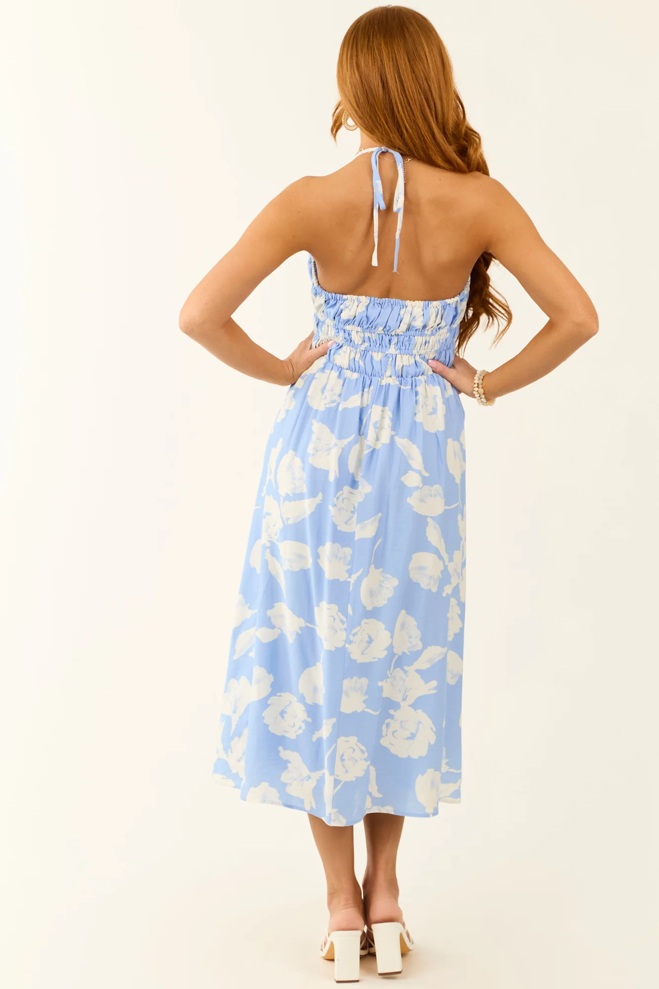 Indulge in the charming elegance of the Cornflower Sweetheart Halter Ruched Midi Dress. Radiating beauty in shades of Cornflower and Ivory, this dress boasts a non-stretchy woven fabric with a sleeveless design and a smocked bust for a flattering fit. Enhancing its allure are the cut-out neckline detail, decorative tie, and tied straps. Lined for comfort, this dress is made of 83% Polyester and 17% Nylon with a 95% Polyester and 5% Spandex lining. Perfect for spring and summer, this dress is available in Small, Medium, and Large sizes. Care instructions: Hand wash cold, line dry, iron on low heat. Please note that each piece may vary slightly due to the unique fabric print and sewing process. Model is wearing a size Small.