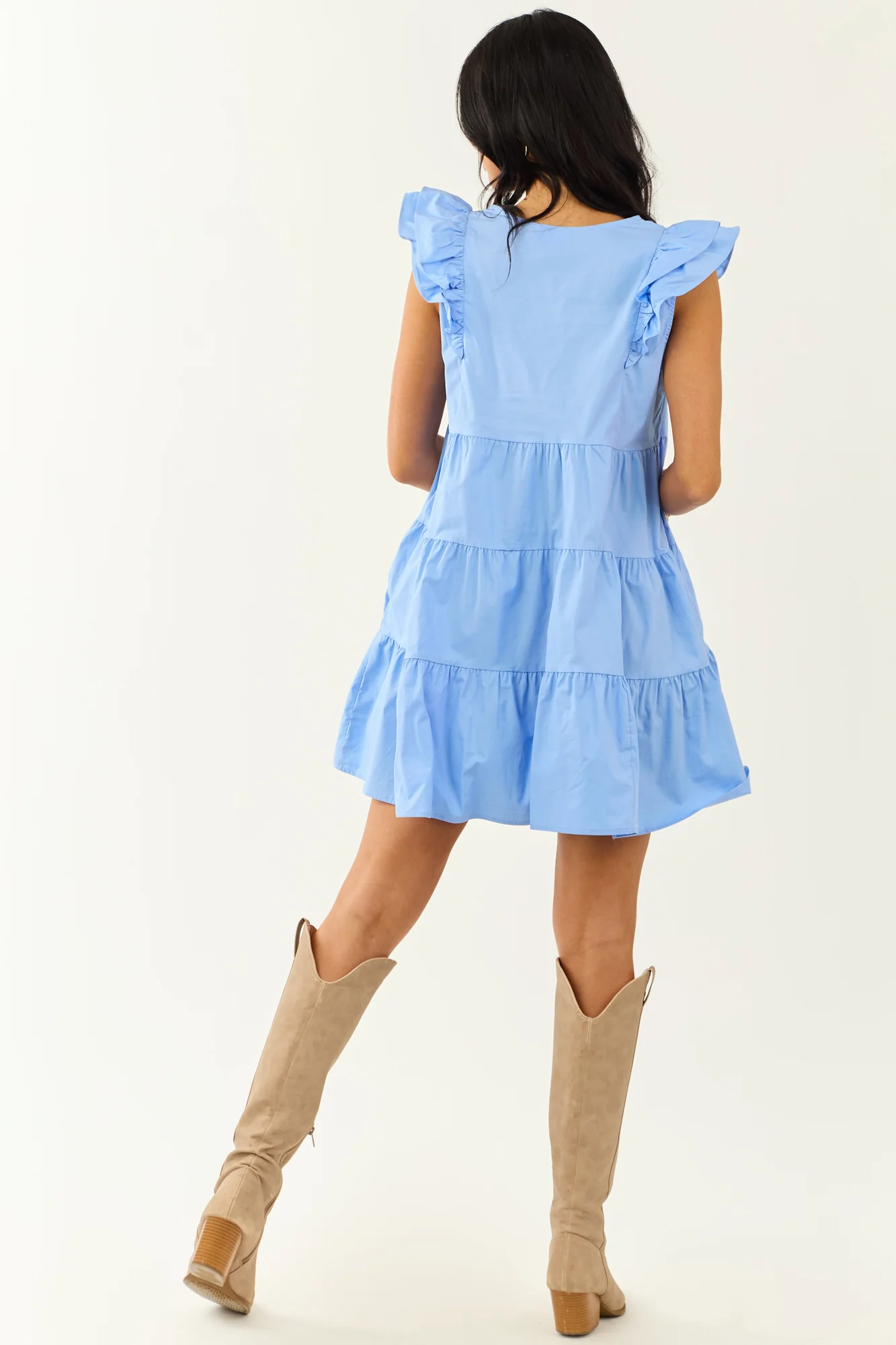 Elevate your wardrobe with our Lovelo Cornflower Tiered V Neck Mini Dress. Featuring a large tent fit, layered ruffle cap sleeves, and side pockets, this dress offers style and comfort in one. Made of non-stretchy lightweight cotton, its perfect for any occasion. Let loose in this flowy, versatile piece!