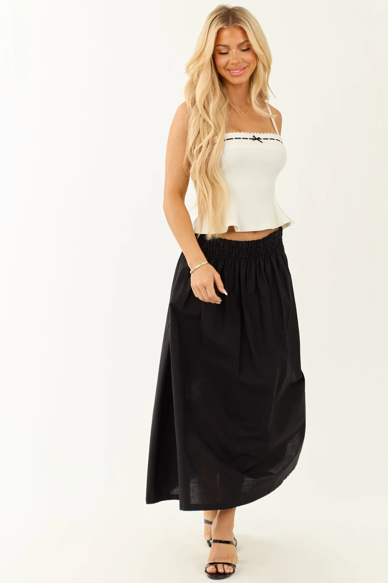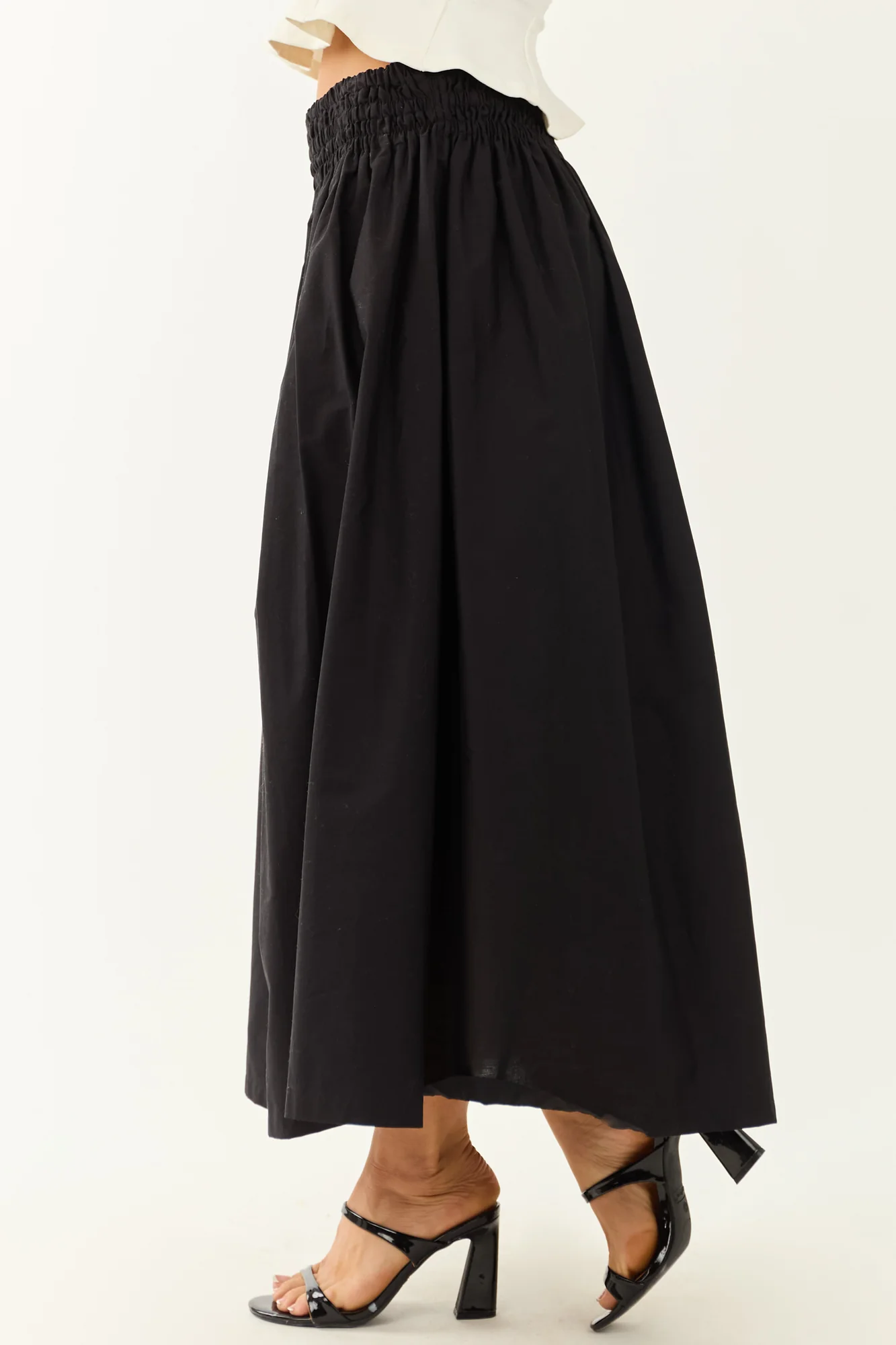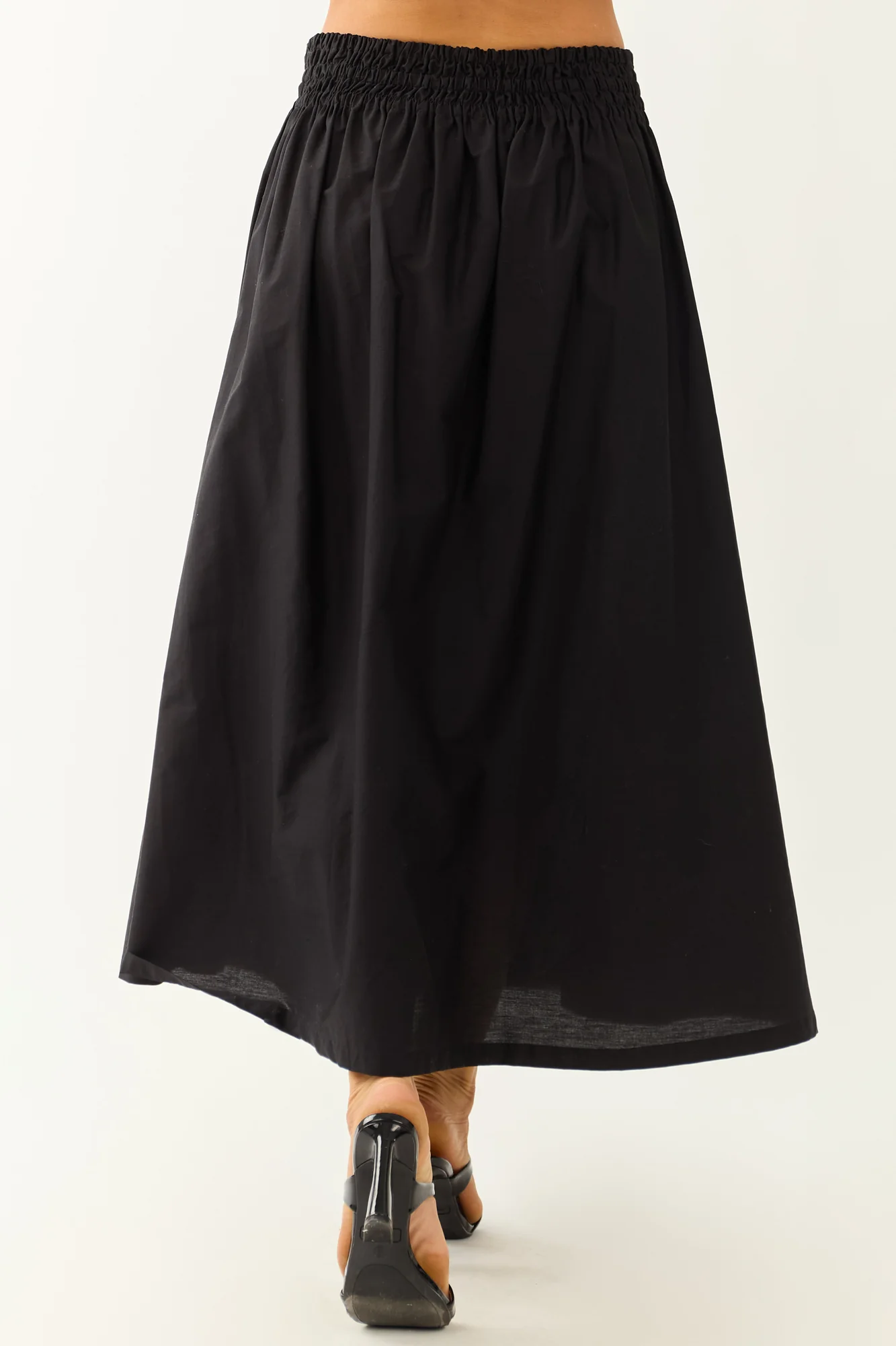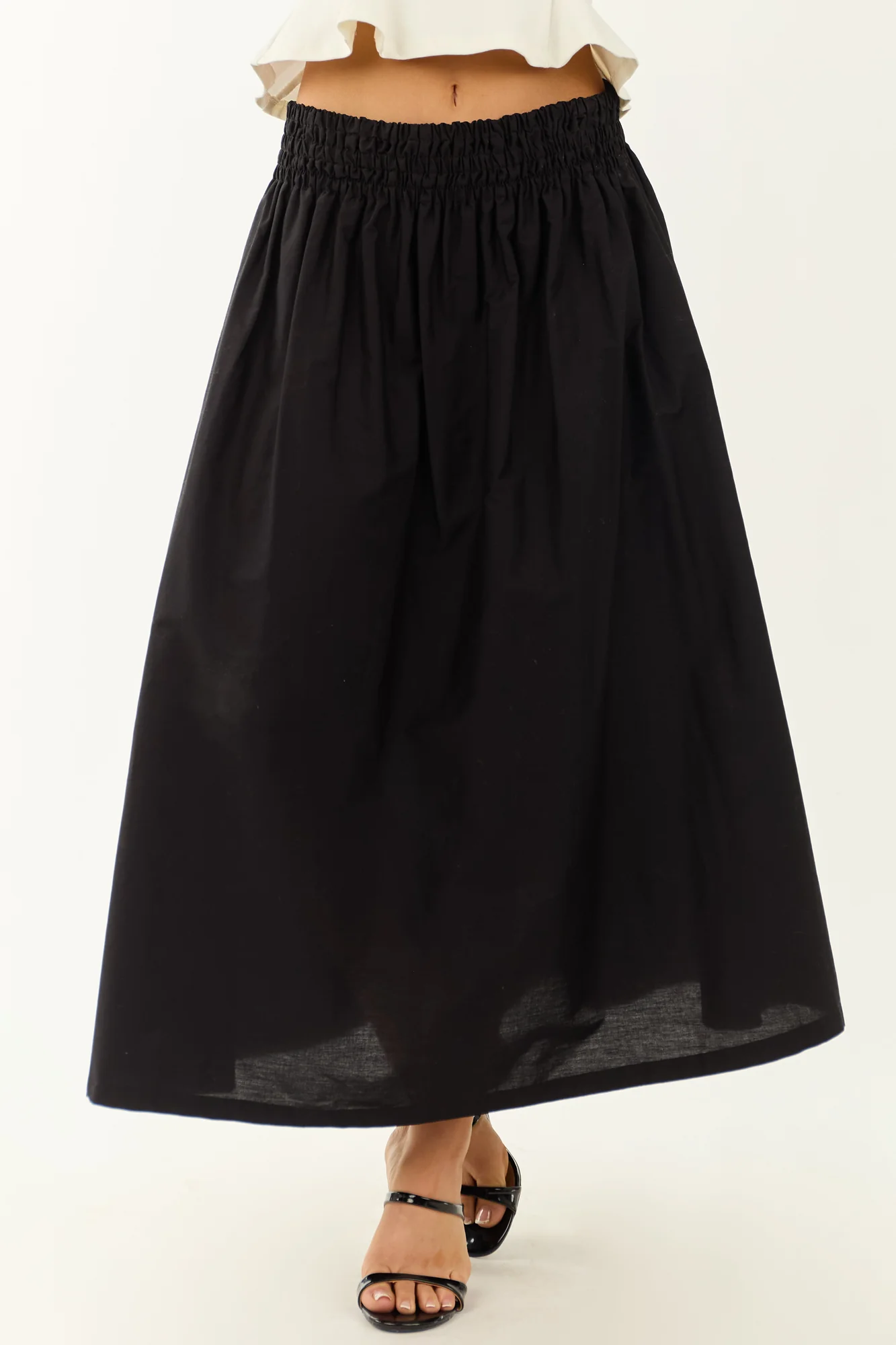 Step up your style game with this cotton black elastic waist midi skirt in sizes S, M, and L. The smocked waistband offers a comfortable fit, ideal for both work and casual outings. This unlined skirt is made of 100% cotton, providing a professional look with a personal touch. Care instructions: Hand wash in cold water, iron low, and dry flat. Model is wearing a size Small. Size down for the perfect fit. Measurements: S – Waist: 30-42″, Length: 35″ | M – Waist: 31-46″, Length: 35″ | L – Waist: 32-48″, Length: 35″.
