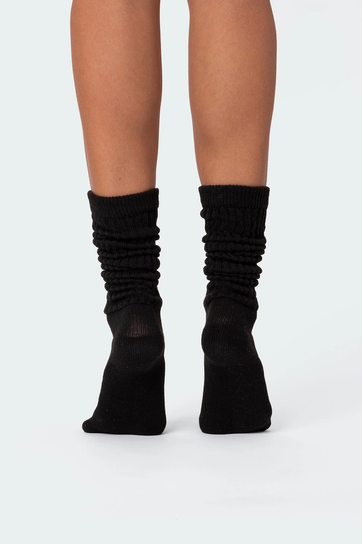 Indulge in the cozy comfort of our Cotton Slouchy Scrunch Socks in Black. Made from a blend of Cotton and Spandex, these socks feature a unique scrunch design for added style. With a length of 20.1 inches, they provide a snug fit that stays put. Care instructions: Machine wash with similar colors for lasting quality and color retention.