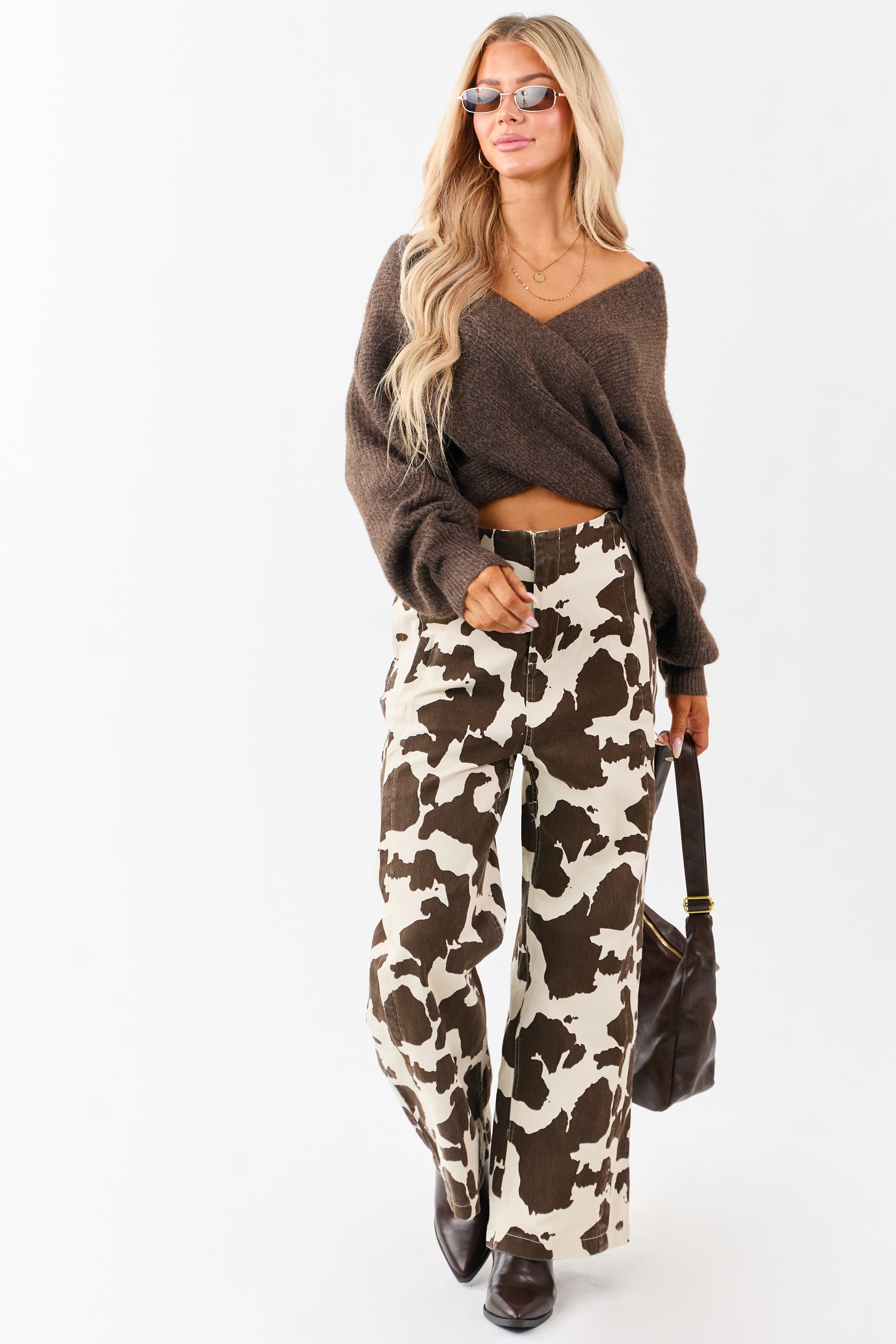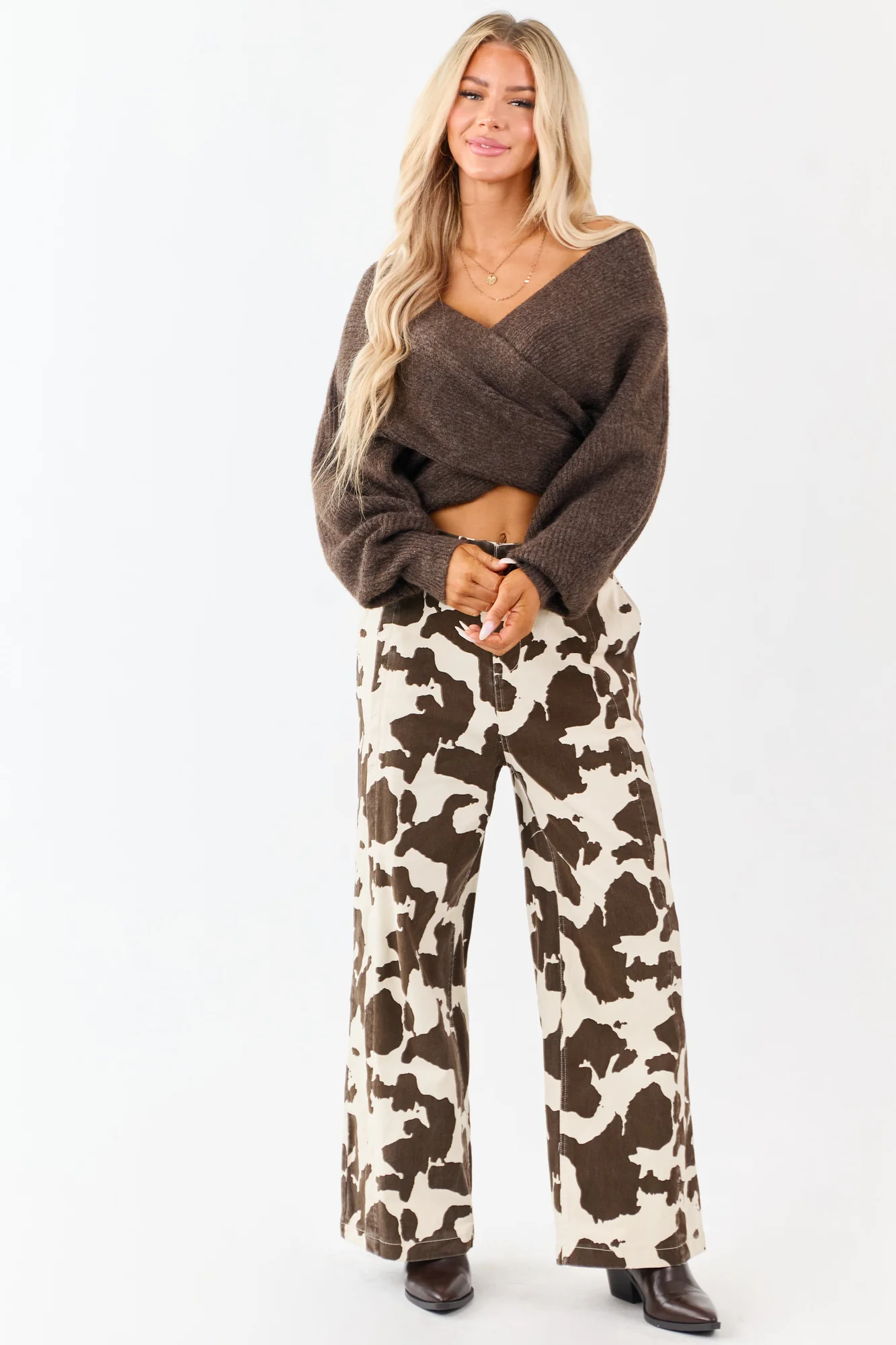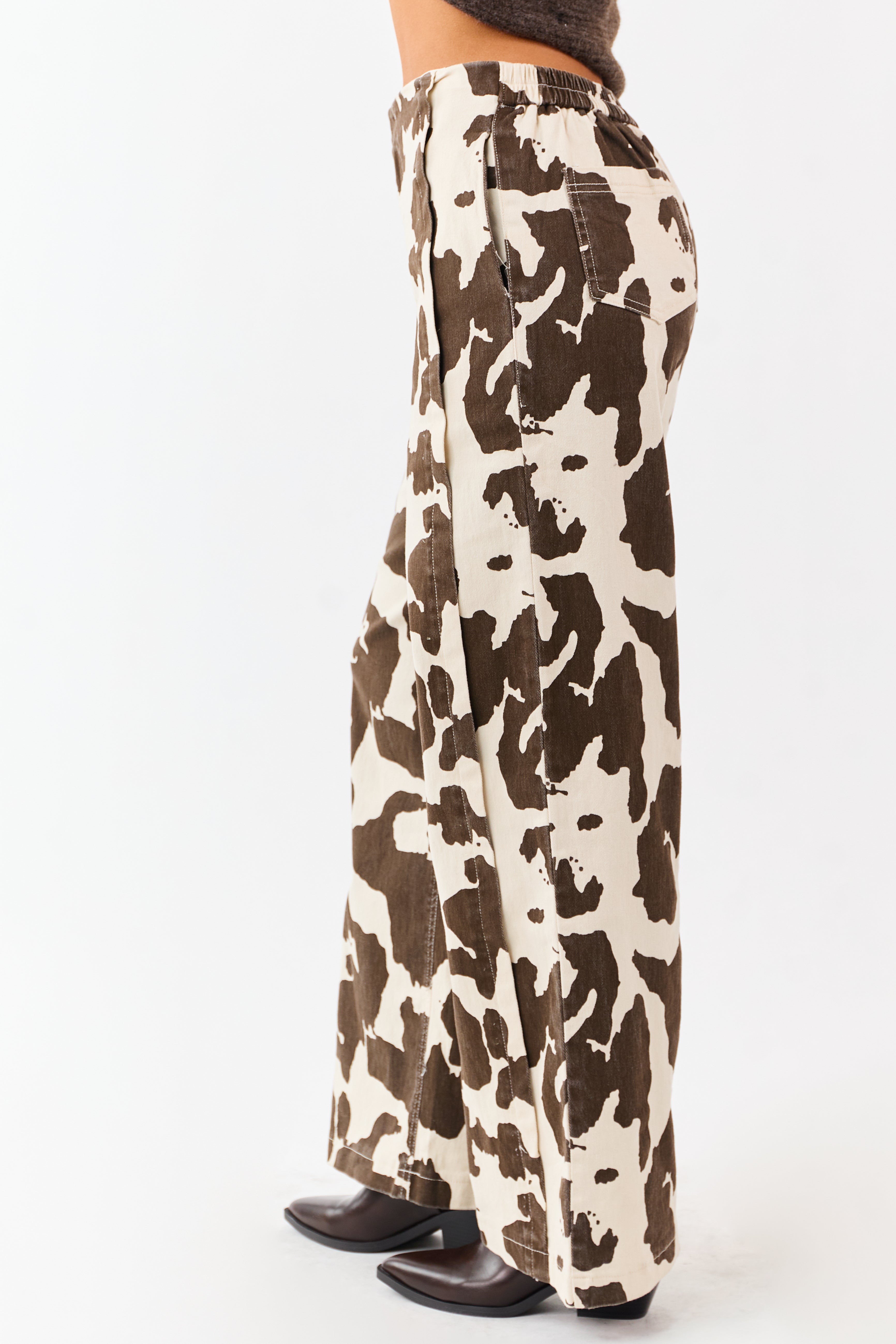 Redefine western charm with a modern twist wearing our cow print wide leg denim pants. These pants offer pintuck side line details, high waist fit, and a comfortable stretch fabric. Feel confident in a stylish Coco print design.