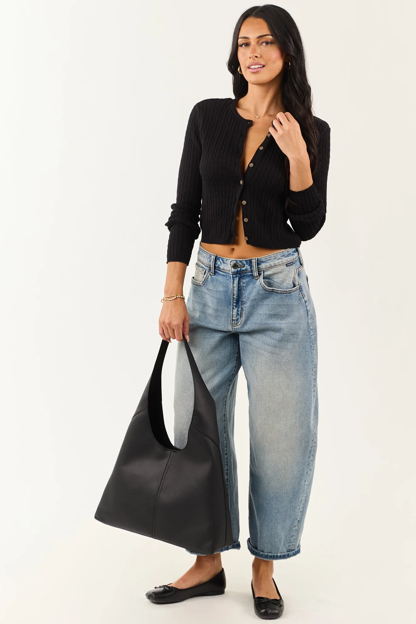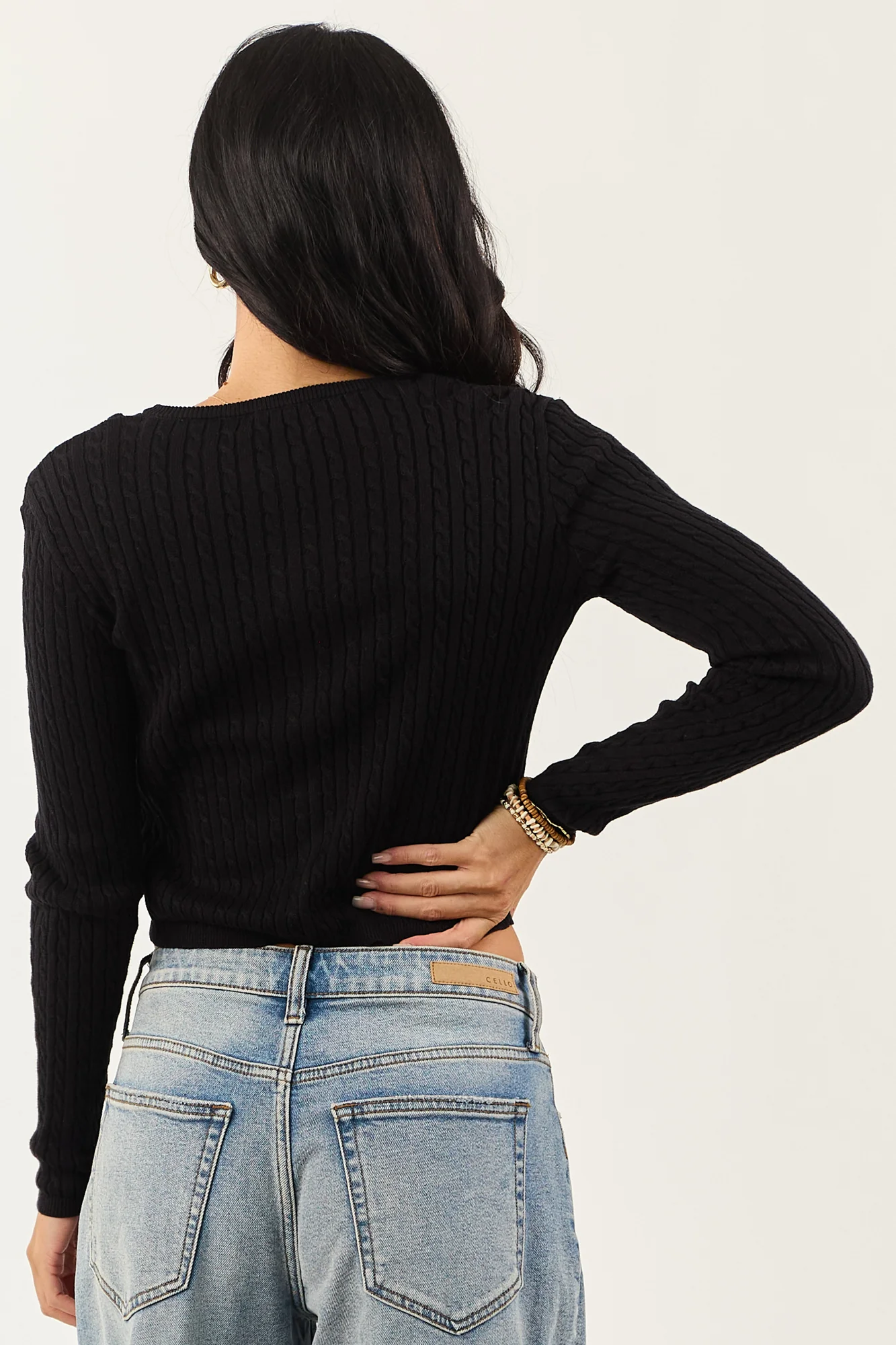 Indulge in warmth and style with our black cable knit cardigan for women. Crafted from a soft blend of 55% cotton and 45% acrylic, this classic button-down sweater offers a cozy texture perfect for layering. The stretchy ribbed trim ensures a comfortable fit. Available in sizes S, M, and L, with bust sizes ranging from 36″ to 42″ and sleeve lengths from 24″ to 26″. Elevate your fall fashion with this versatile piece. Imported.