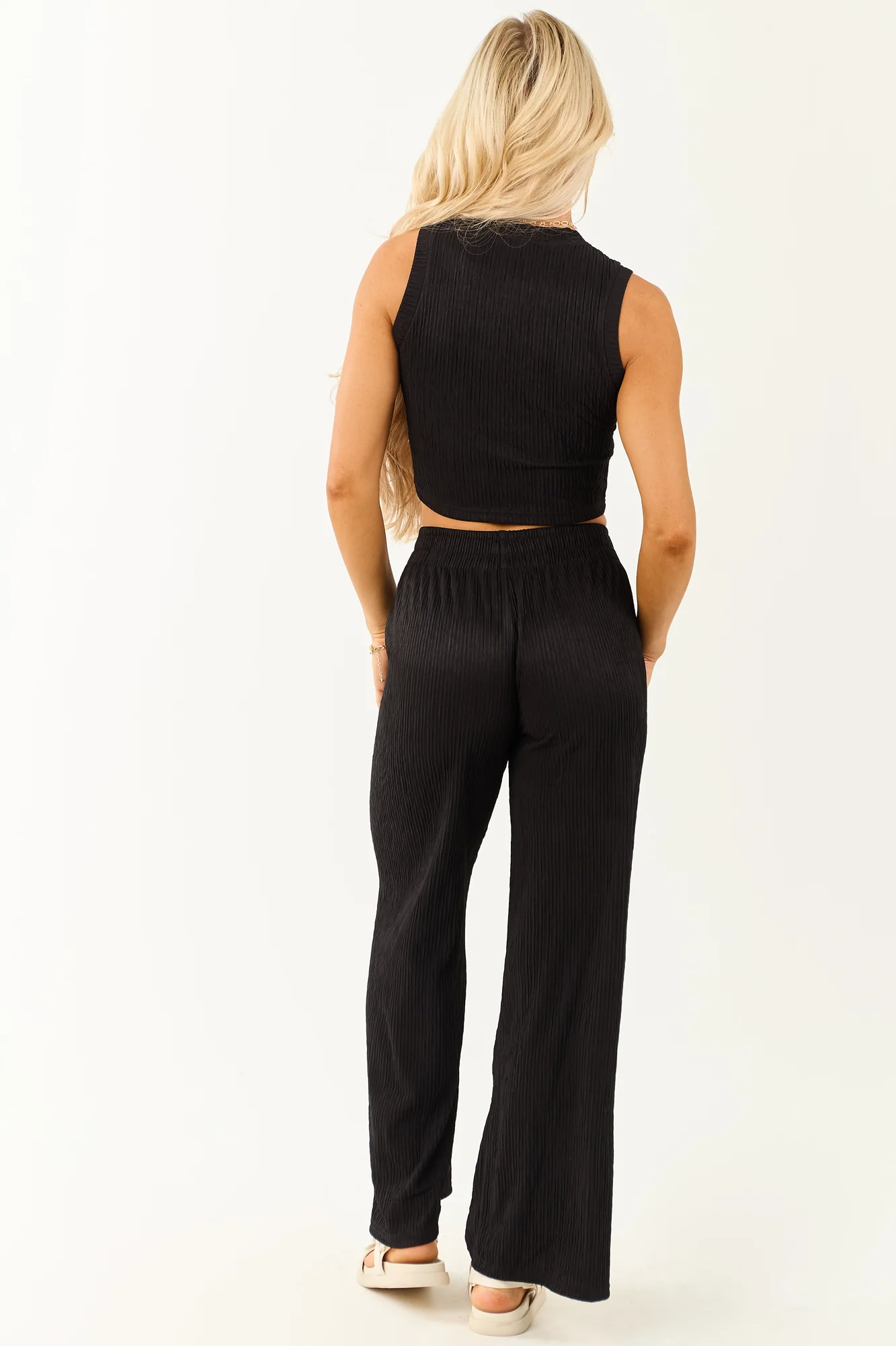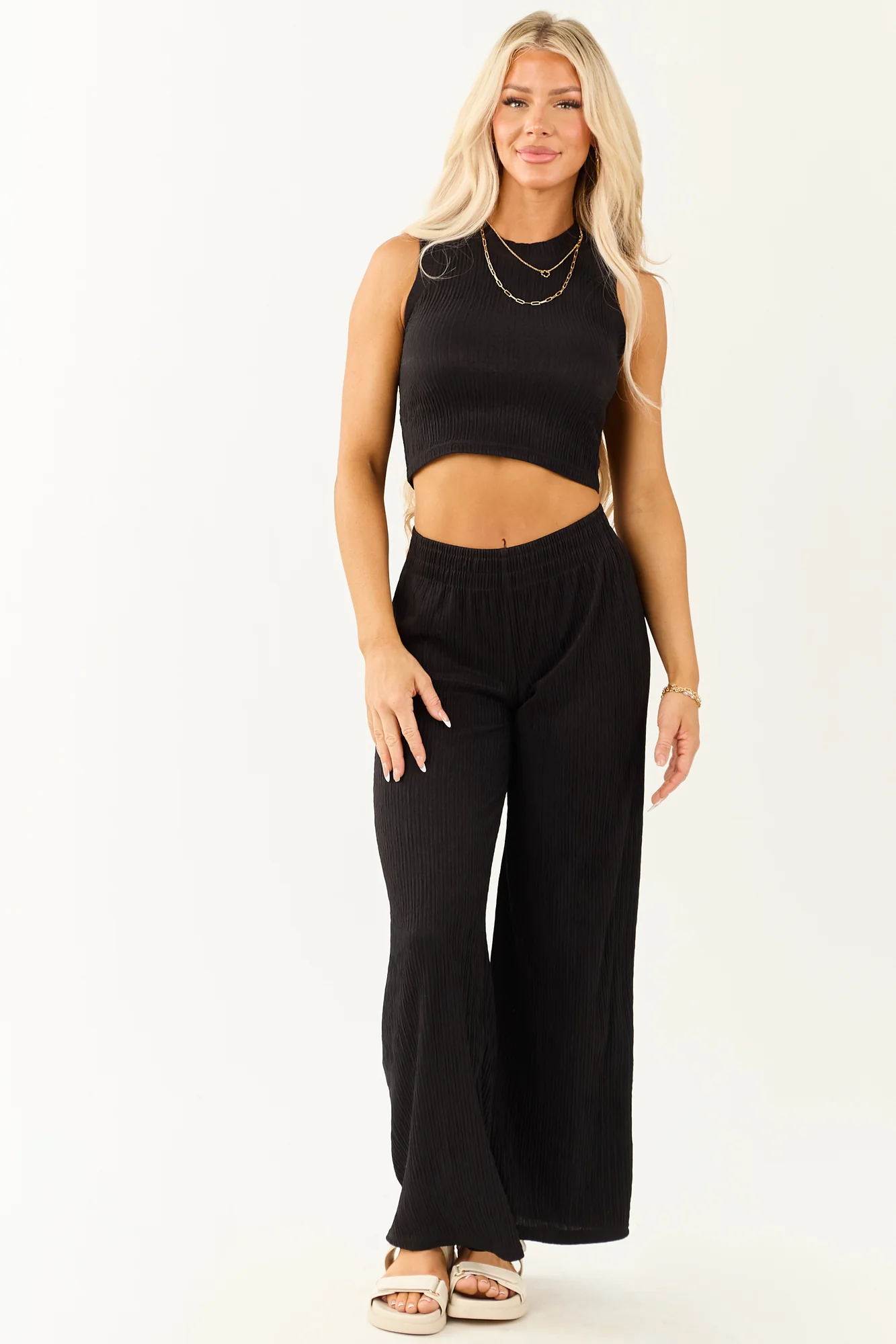 Embrace comfort and style with this black knit crop top and wide-leg pants set. Perfect for lounging or running errands, this set features a stretchy crinkle-textured knit, a fitted bust, and an elastic waistband. The cropped top and wide-leg pants offer a trendy and relaxed look. Available in sizes S, M, and L, this outfit is made of 92% Polyester and 8% Spandex, ensuring a comfortable fit. Model is 57″ tall, wearing a size Small. Add this versatile set to your wardrobe for effortless chic.