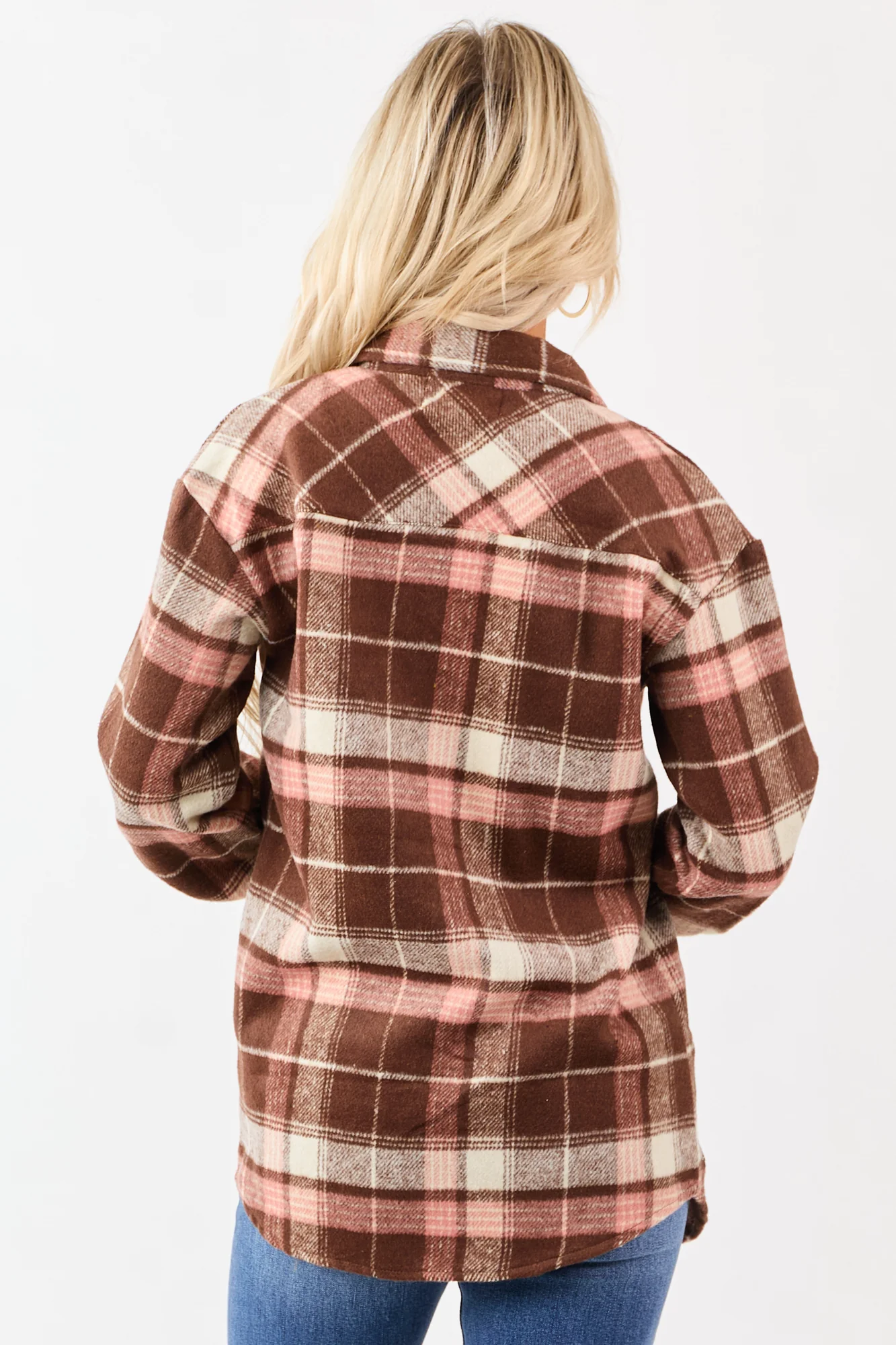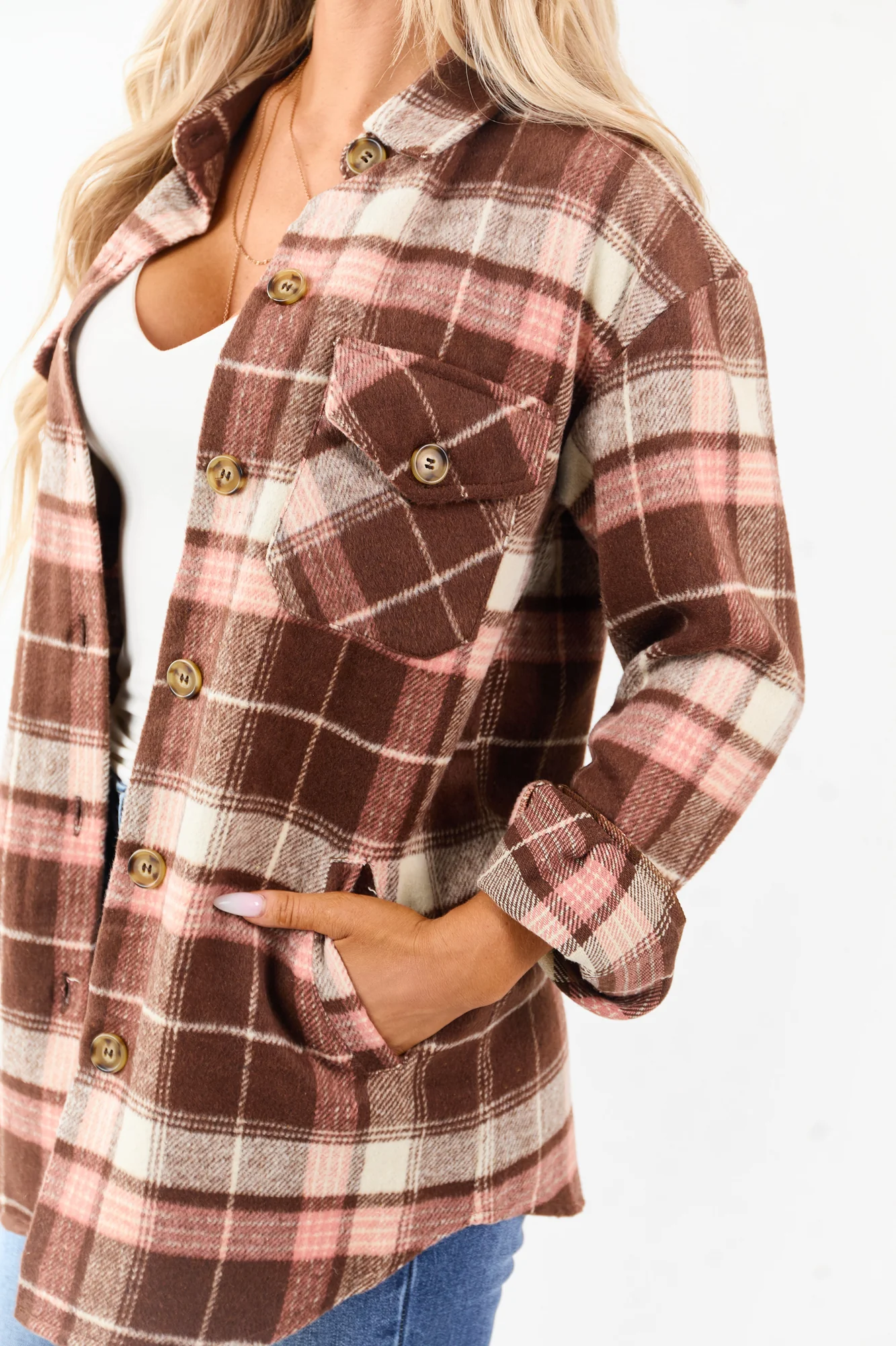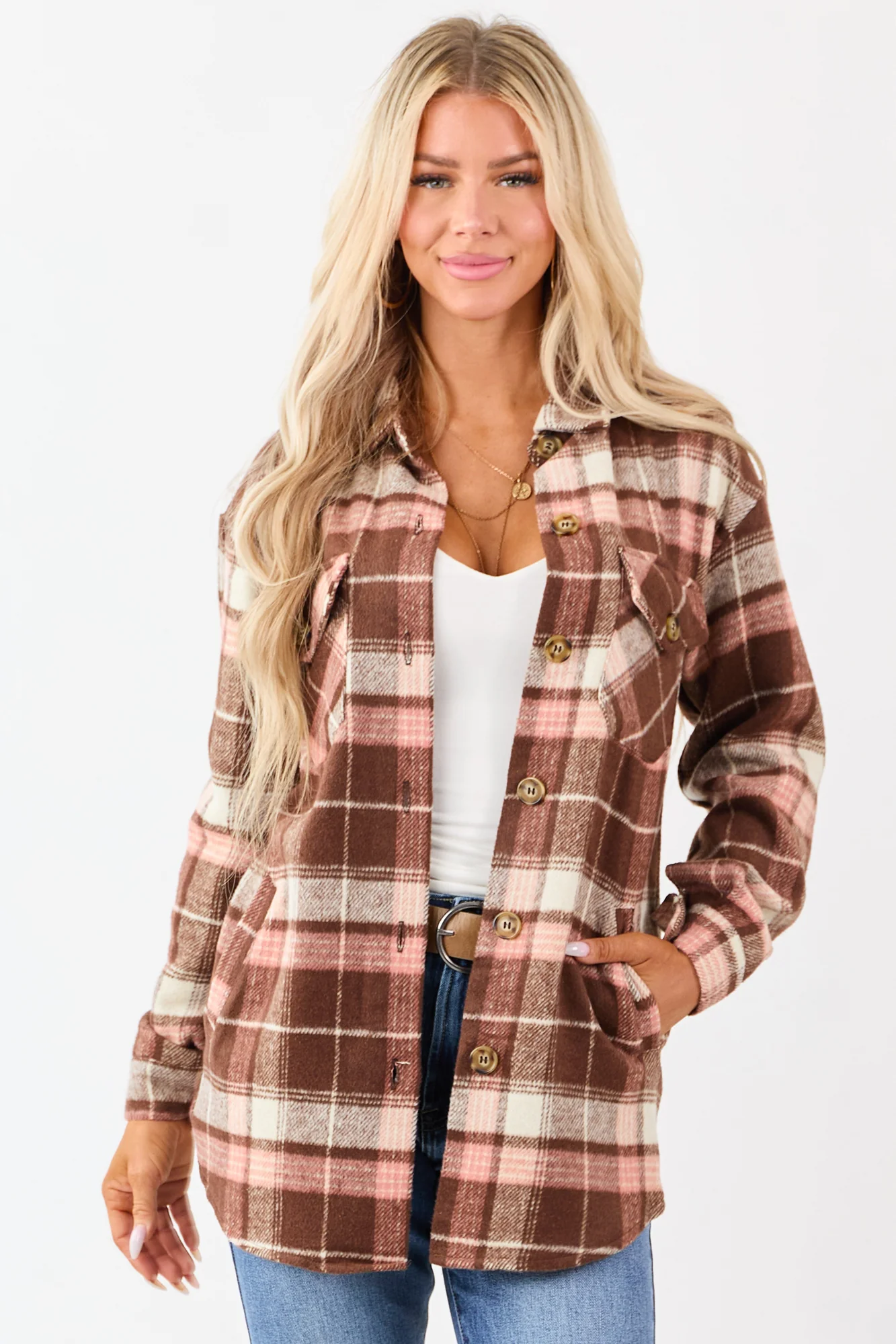 Stay warm and stylish in this Cocoa Plaid Collared Shacket . Made with thick, wear-resistant material, this versatile piece is perfect for layering in the fall season. Featuring a relaxed fit, banded button cuffs, drop shoulder, and 4 pockets. Plaid pattern in Cocoa, Punch, and Vanilla shades. Crafted from 100% Polyester. Available in sizes S, M, L, XL. Bust: 38″-44″. Length: 31″-34″. Sleeve Length: 29″-32″. Imported.
