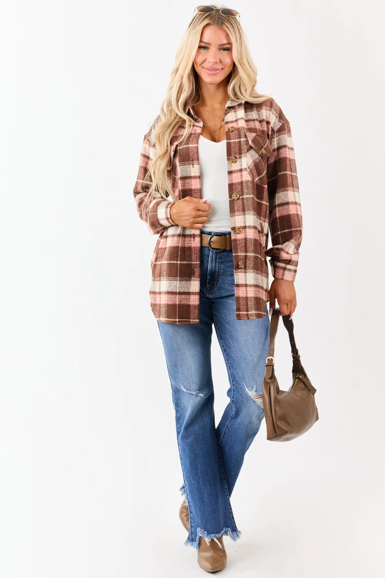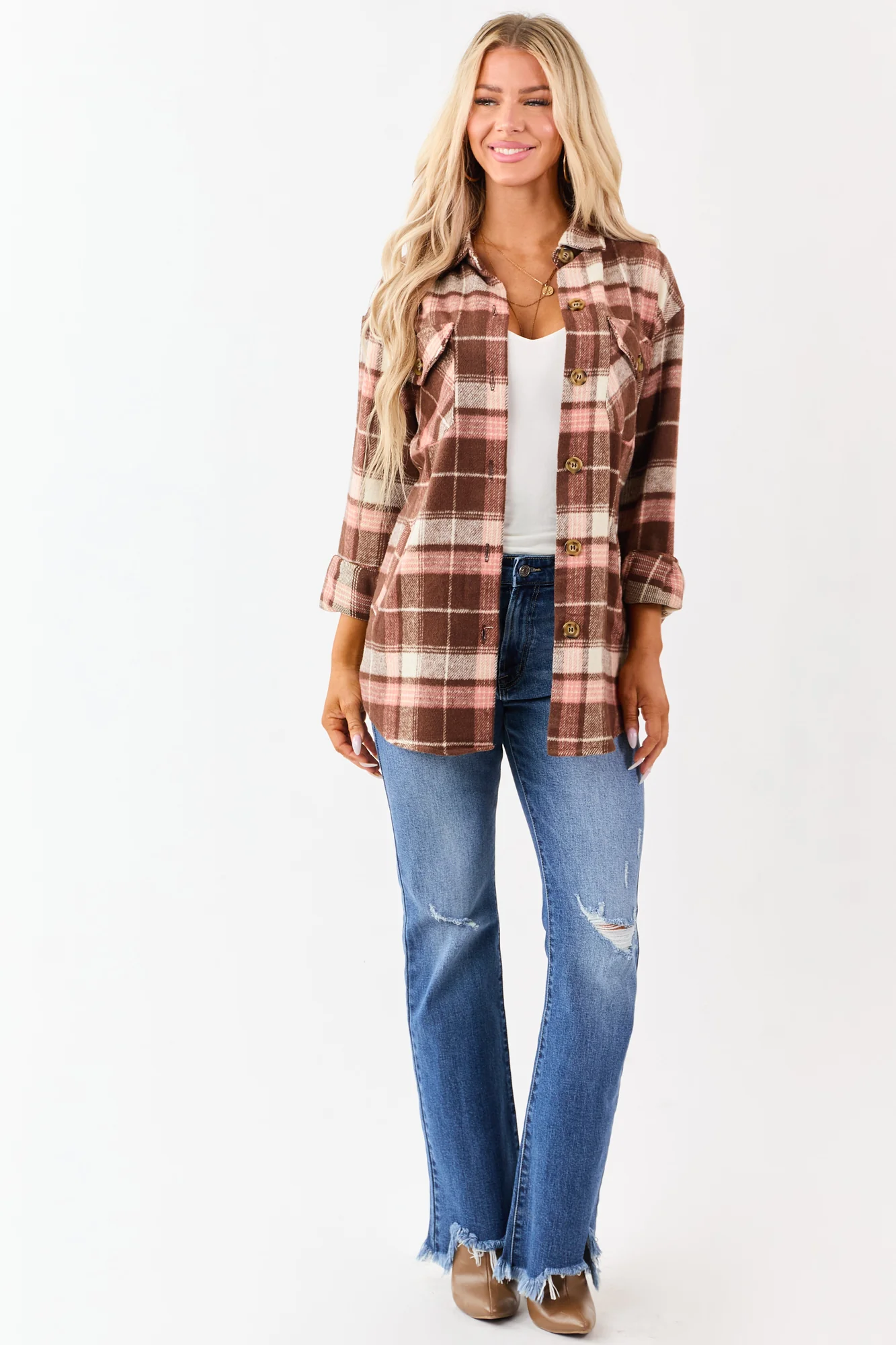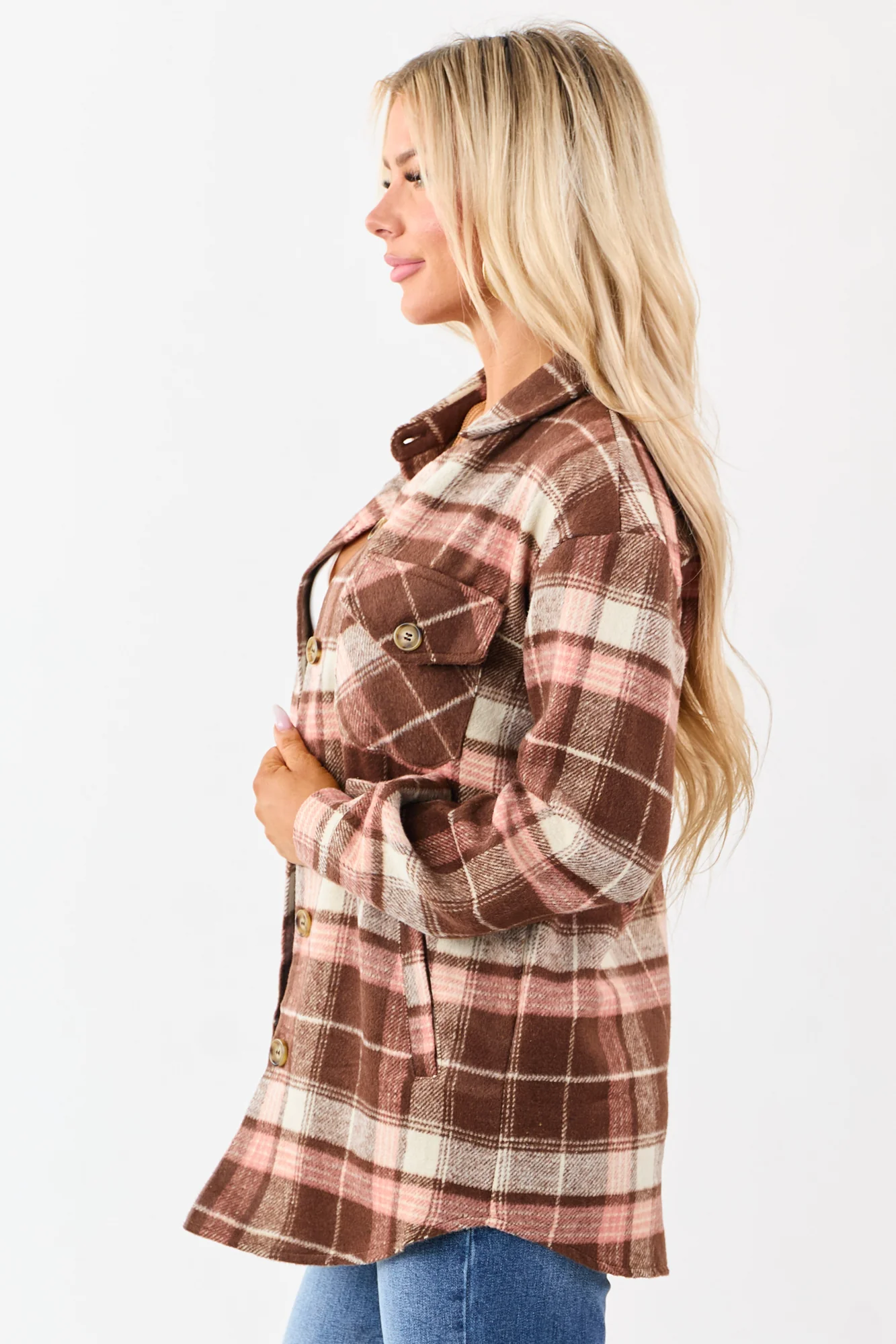 Stay warm and stylish in this Cocoa Plaid Collared Shacket . Made with thick, wear-resistant material, this versatile piece is perfect for layering in the fall season. Featuring a relaxed fit, banded button cuffs, drop shoulder, and 4 pockets. Plaid pattern in Cocoa, Punch, and Vanilla shades. Crafted from 100% Polyester. Available in sizes S, M, L, XL. Bust: 38″-44″. Length: 31″-34″. Sleeve Length: 29″-32″. Imported.