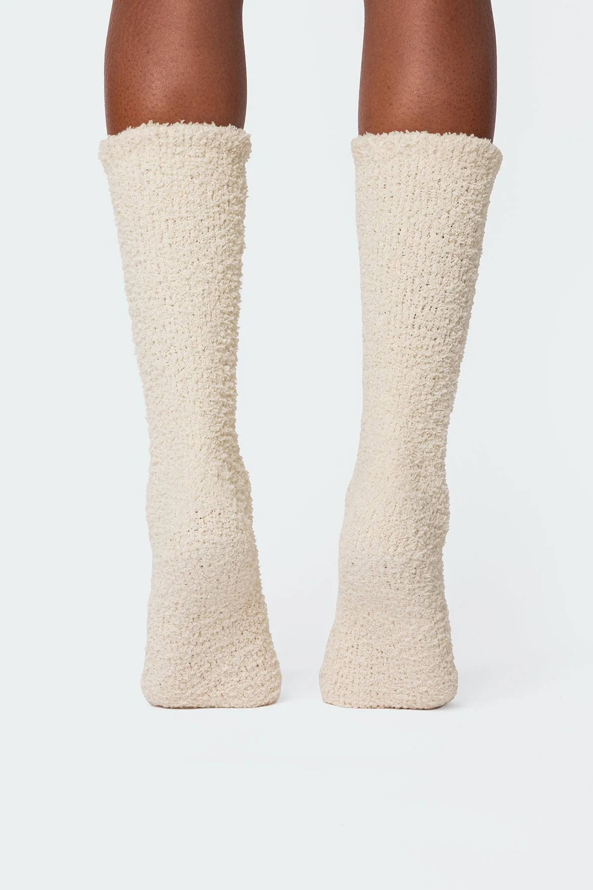 Indulge in luxury with our cream fluffy socks made from a blend of polyester and spandex, providing unrivaled softness and comfort. These cozy socks measure 18.1 inches in length, ensuring a perfect fit. Care instructions: Machine wash with similar colors for long-lasting use and enjoyment.