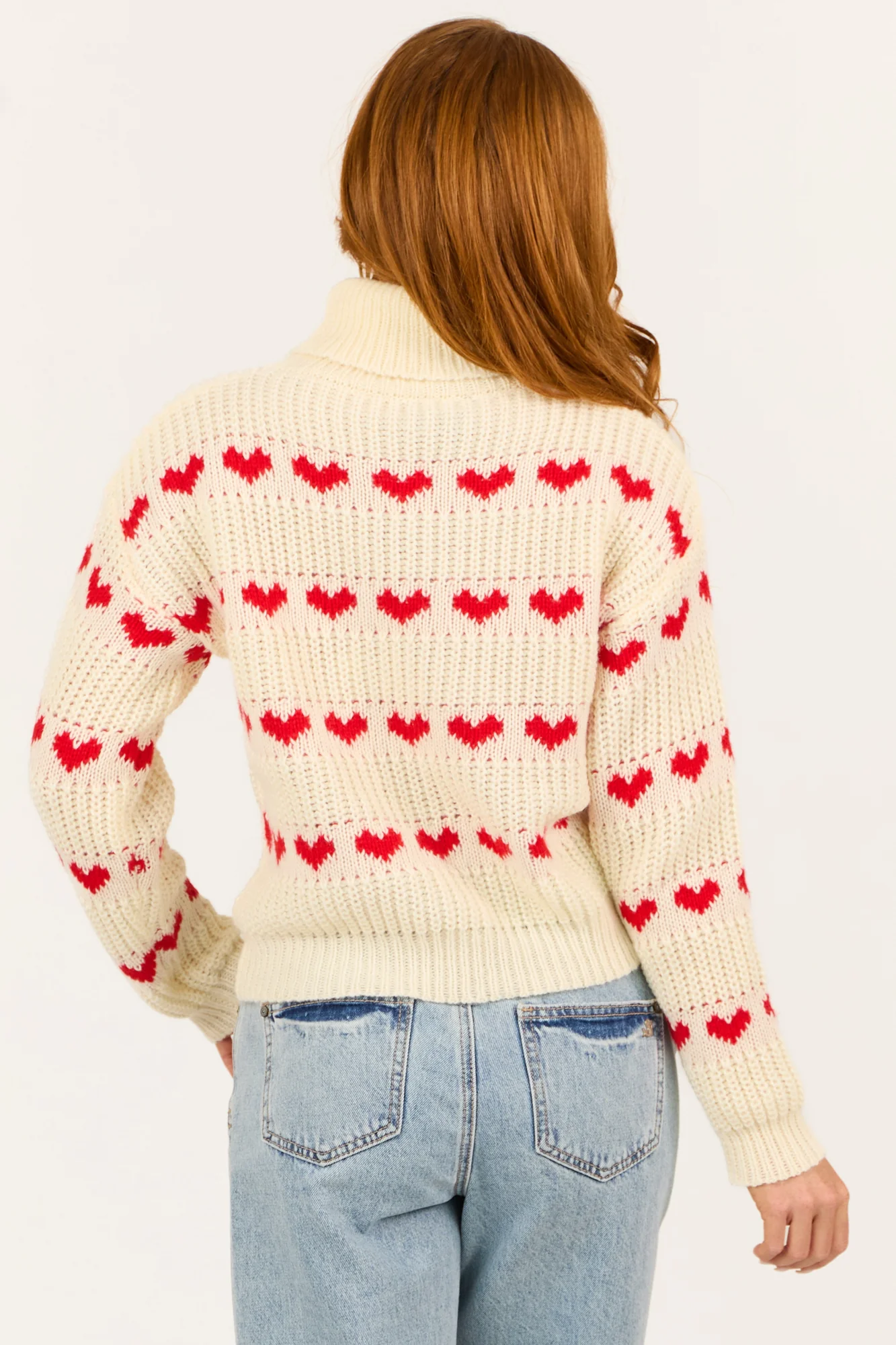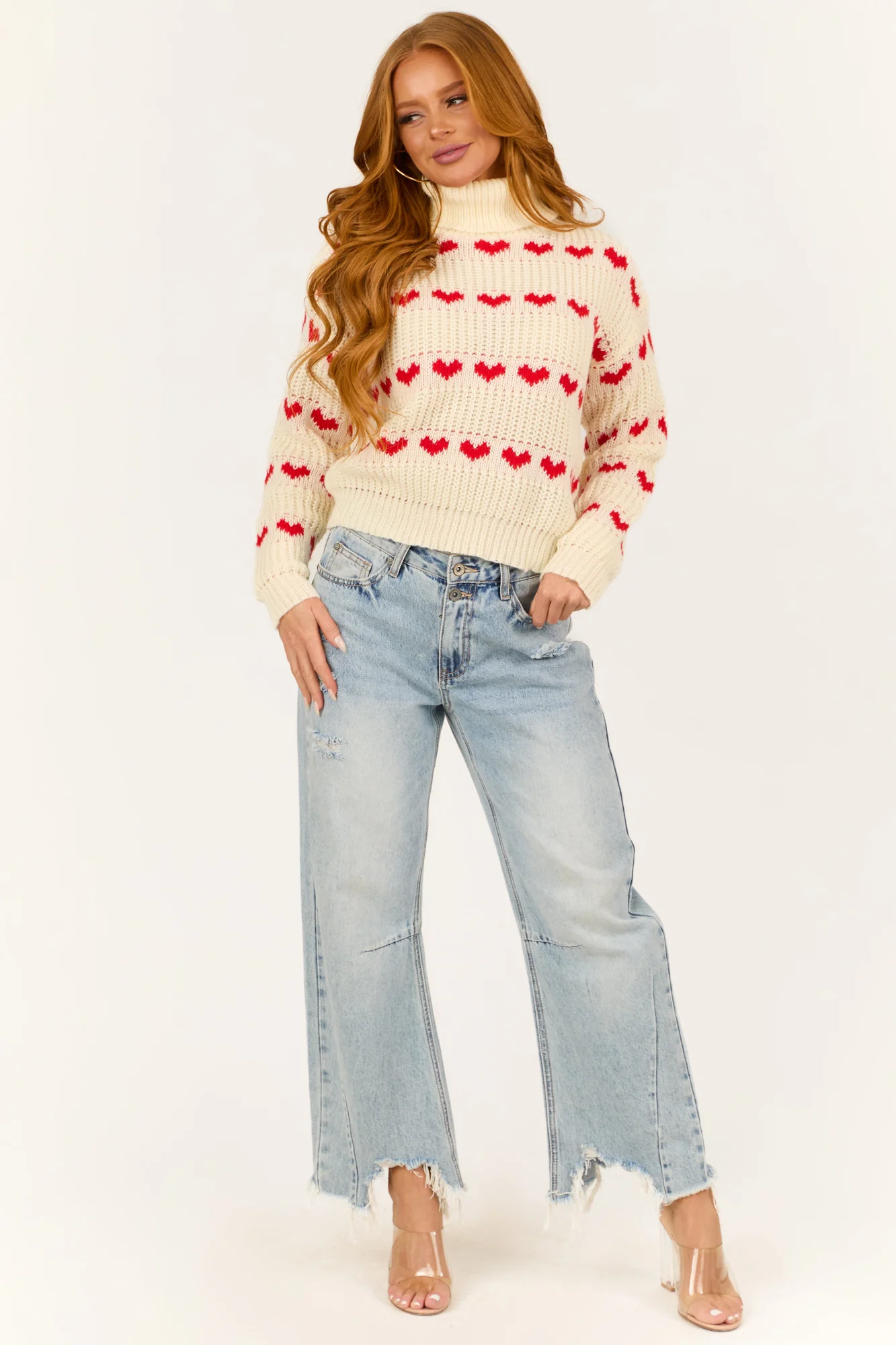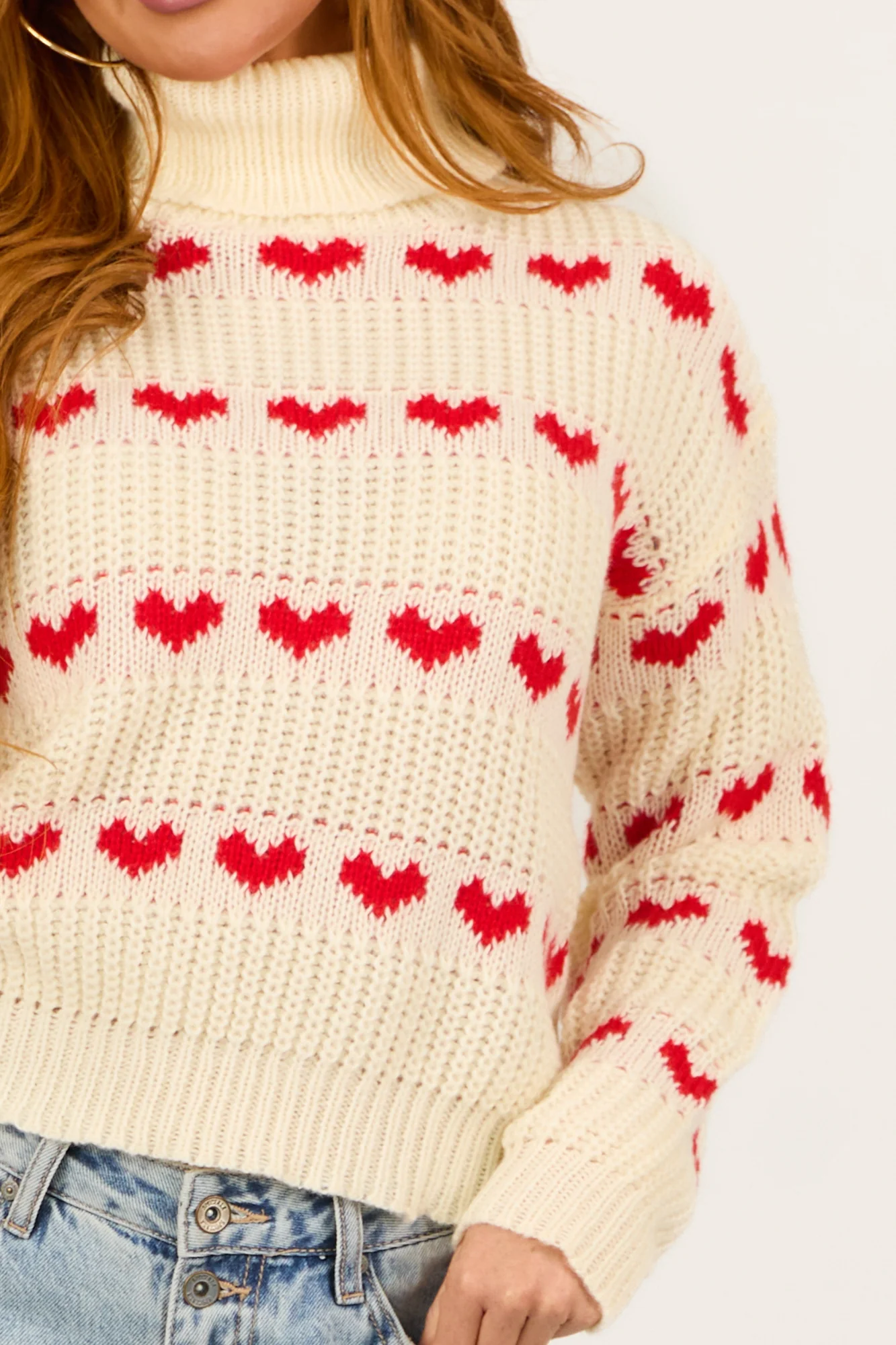 Indulge in ultimate comfort with our Cream Heart Print Turtleneck Sweater. Crafted from stretchy knit fabric for a perfect fit, featuring a charming heart print in Lipstick shade, and finished with ribbed trim and banded cuffs. The drop shoulder design adds a trendy twist, making it a must-have for your wardrobe. Care Instructions: Hand wash, dry flat, iron on low heat.