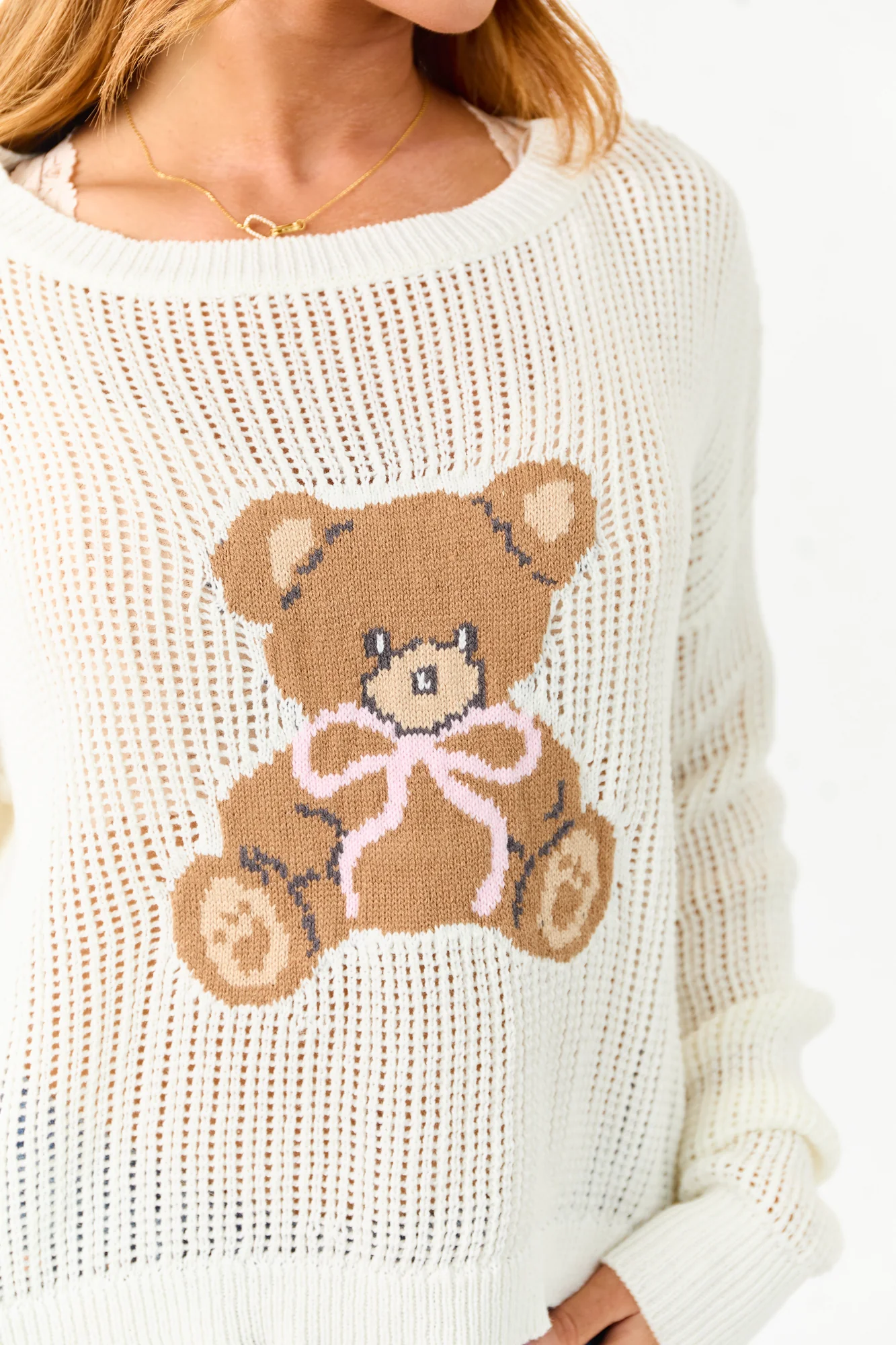 Stay warm and stylish in this cozy Ivory Bear Graphic Knit Sweater available in sizes Small, Medium, and Large. Embrace the teddy-core trend with its oversized fit, enhanced by a sweet bear graphic in shades of Peanut, Camel, Stone, and Carnation. Perfect for chilly days and casual hangs, this sweater features drop shoulders for a relaxed look. Made of a blend of 60% Cotton and 40% Acrylic, it offers both comfort and style. Imported. Model is wearing a size Small. Model’s height is 55″, bust 33″, waist 24″.