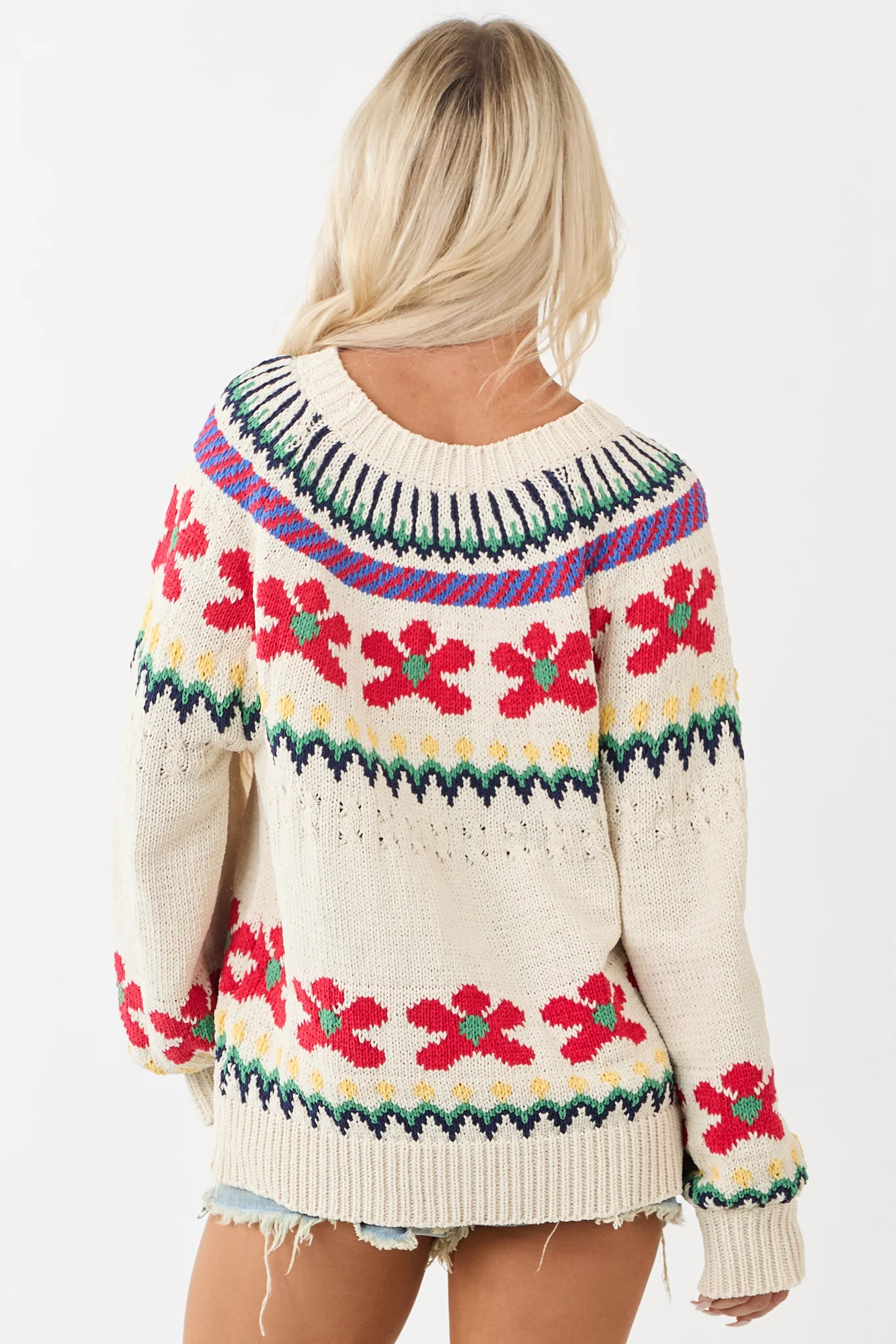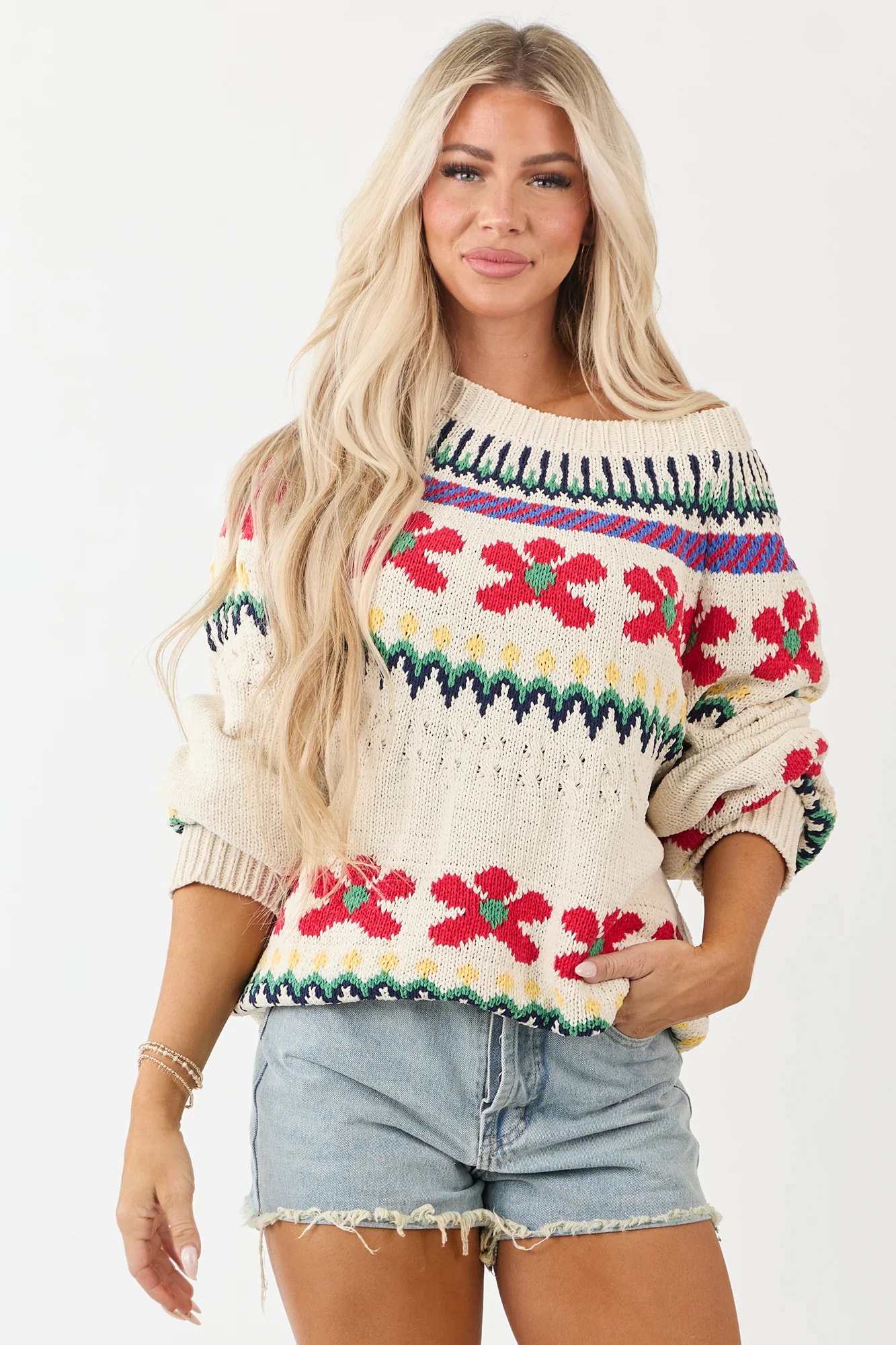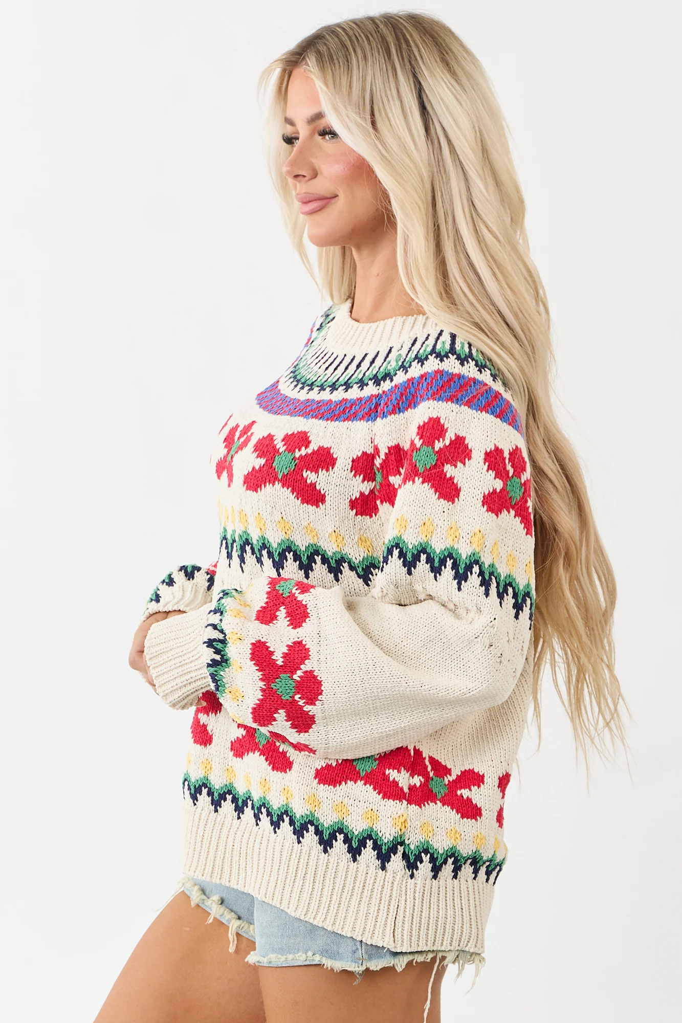 Indulge in the cozy charm of our Cream Nordic Floral Pattern Knit Sweater, adorned with a Nordic-inspired floral motif in shades of Lipstick, Pine, Navy, Sunshine, and Sapphire. This oversized sweater features stretchy rib knit fabric, long raglan bubble sleeves, and ribbed banded trim for a snug fit. Perfect for stylish fireside lounging or festive cold-weather outings, this 100% Polyester sweater offers both comfort and fashion. Please note that slight variations may occur due to the unique print and cutting process. Feel effortlessly chic in this trendy piece. Available in sizes S, M, and L.