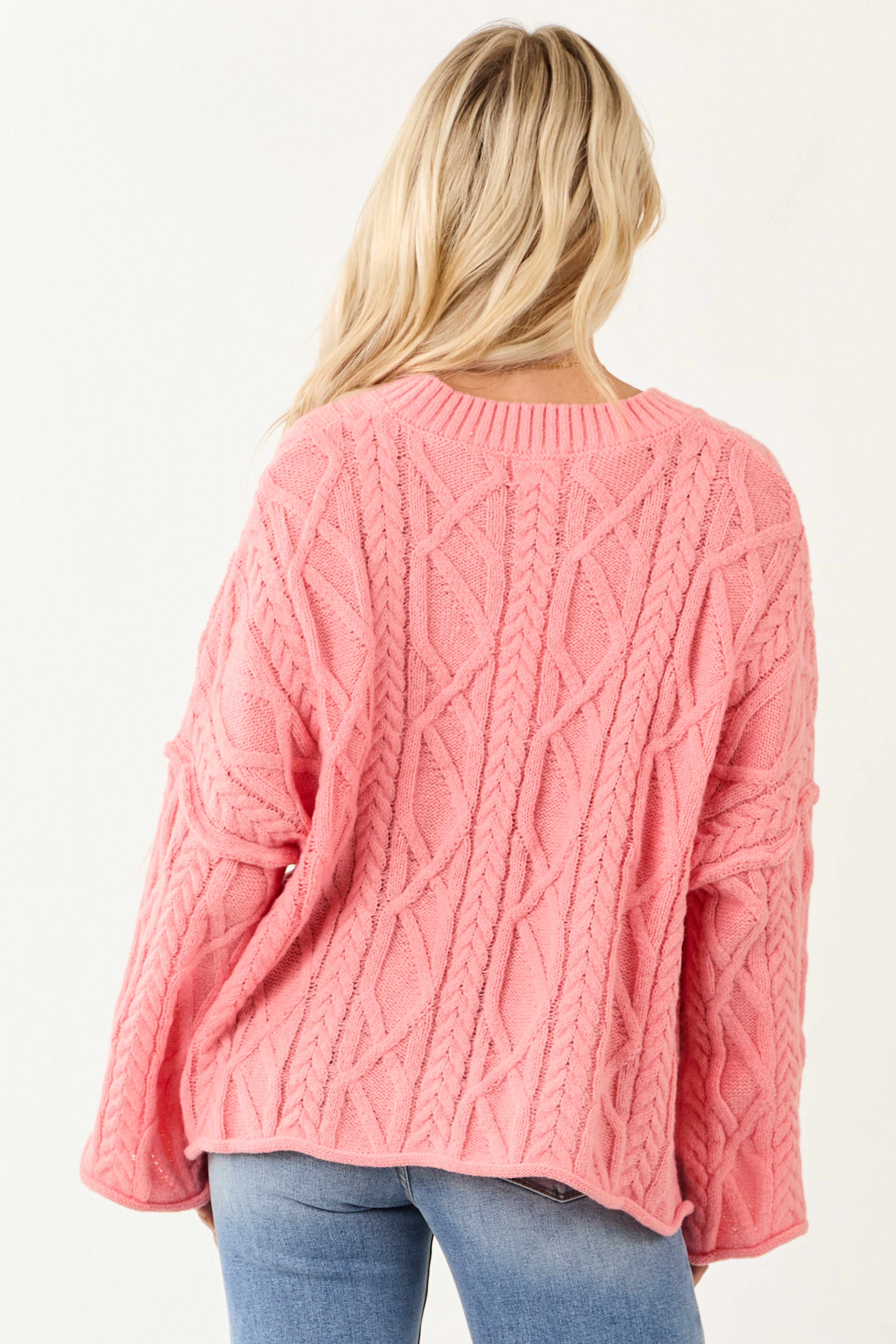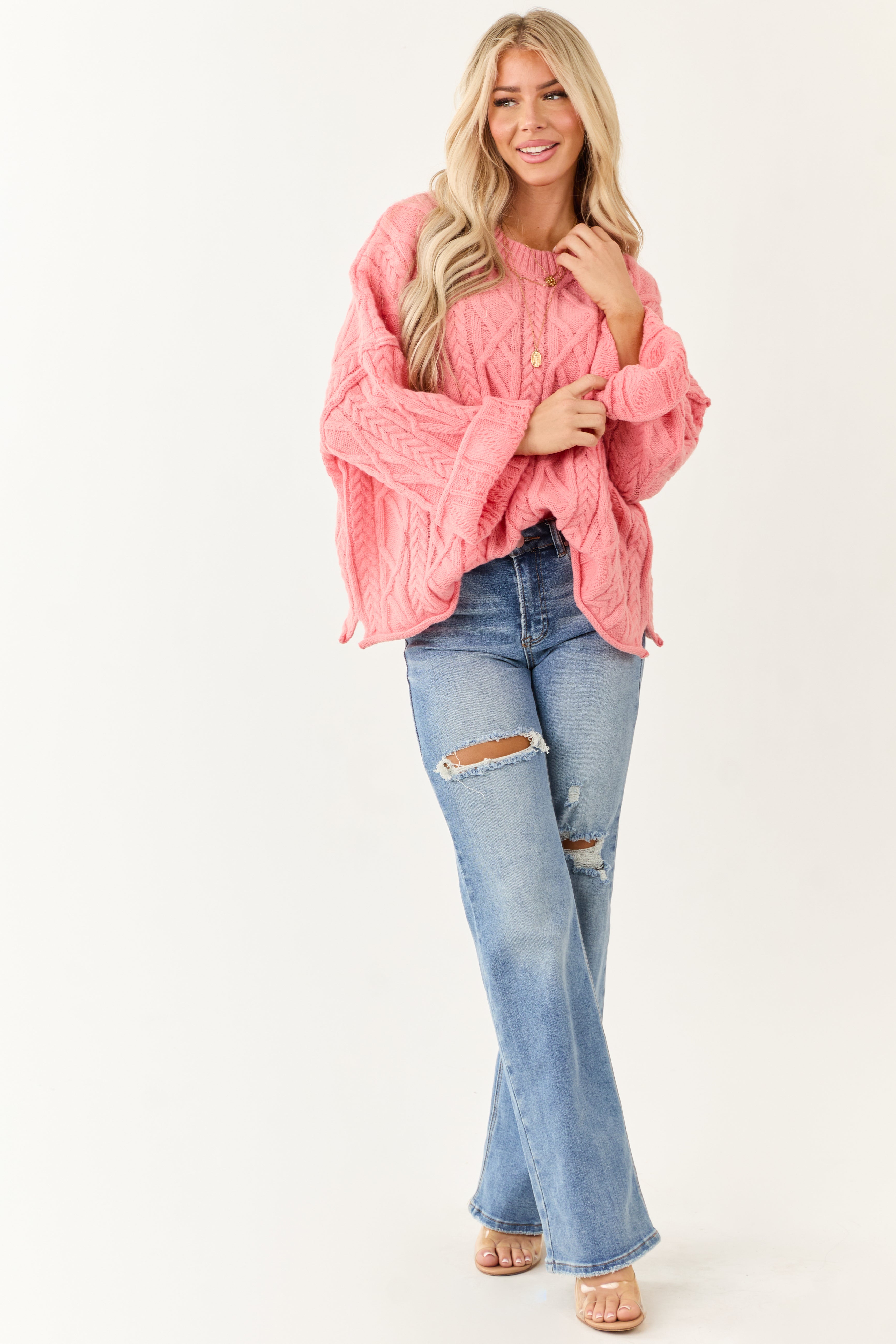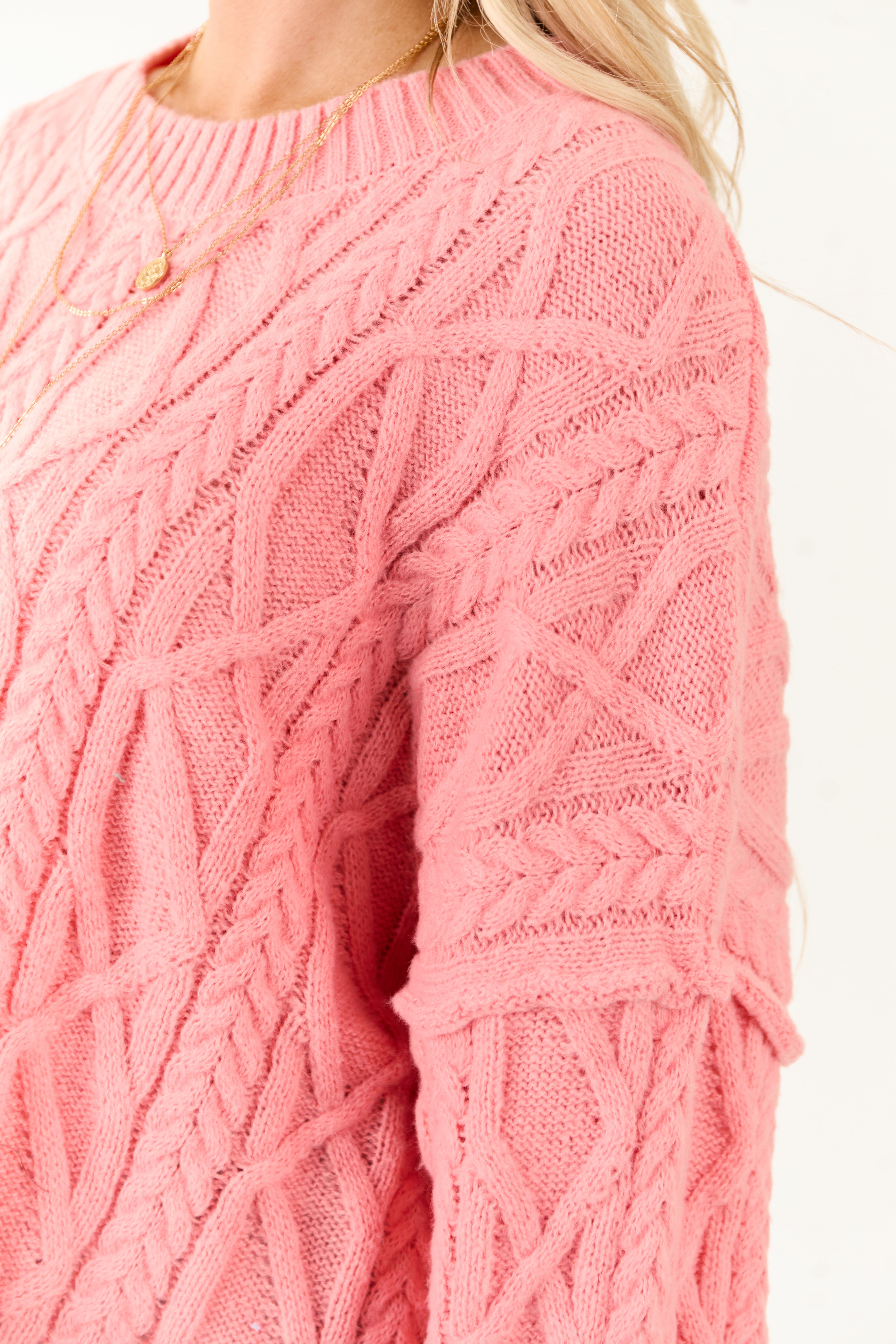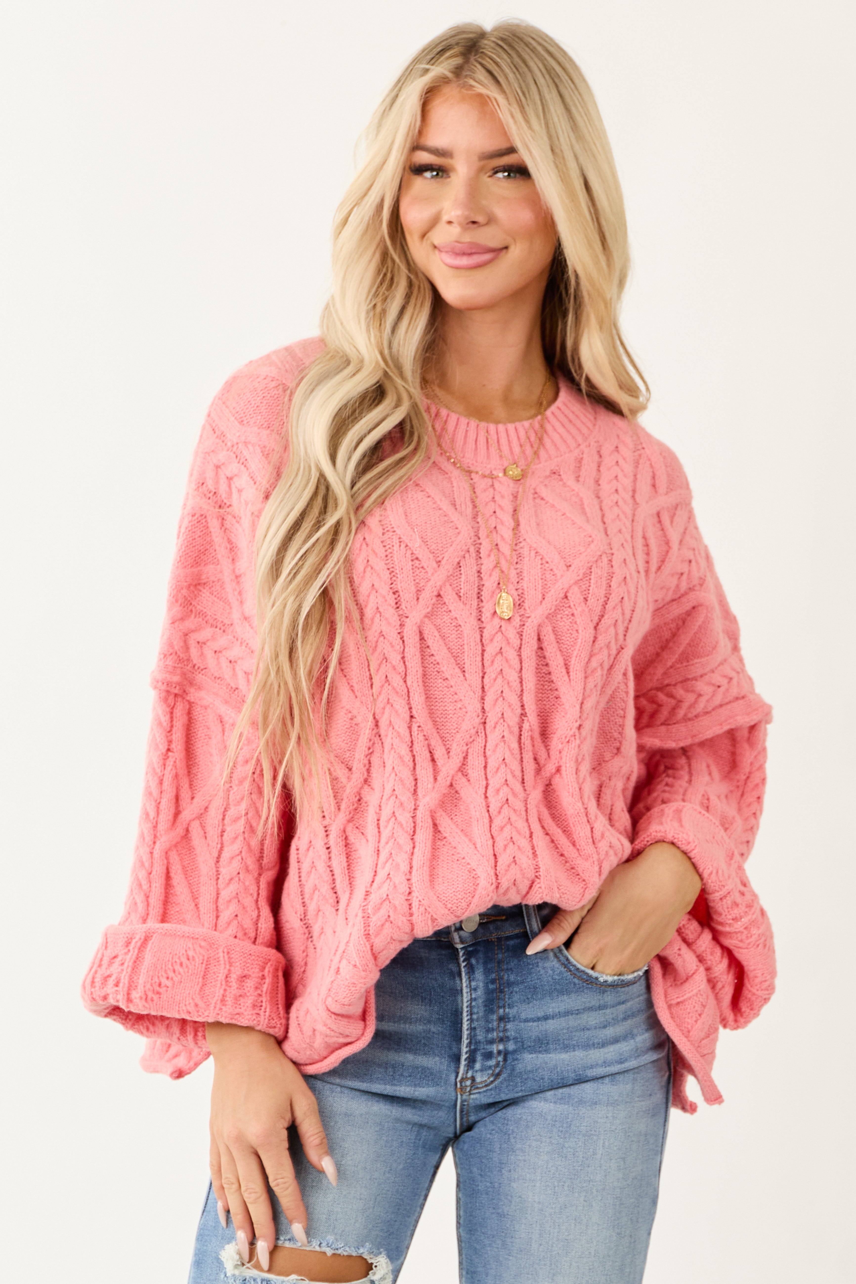 Indulge in the ultimate comfort with this oversized pink cable knit sweater, designed for effortless layering on cool days. Experience the luxurious warmth, stretchy cable knit, drop shoulder, rolled hem, cuffs, and side slits. Crafted from 100% Polyester for maximum coziness. This lovely piece x GeeGee offers a bold yet relaxed style that complements any wardrobe. Embrace the season in style and comfort with this must-have sweater.
