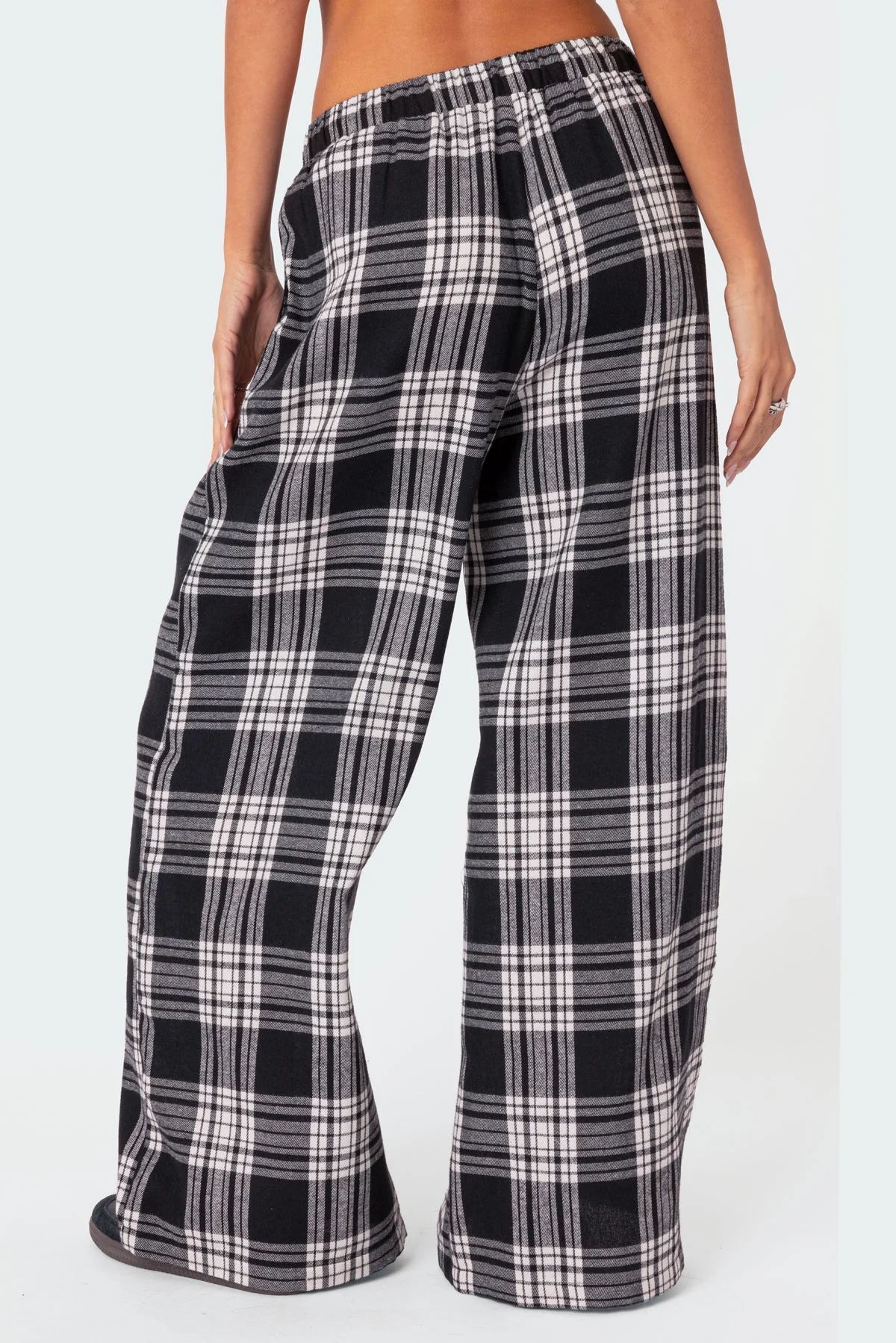 Indulge in comfort with our cozy plaid wide leg lounge pants. Crafted from a blend of Polyester and Cotton, these pants feature an adjustable tie waistband and a stylish plaid pattern. Perfect for relaxing at home or running errands, our model showcases the size small option, measuring at 59″. To care for the item, machine wash at a maximum of 30ºC with similar colors, avoid bleach and tumble drying, iron at a maximum of 110ºC, and refrain from dry cleaning.