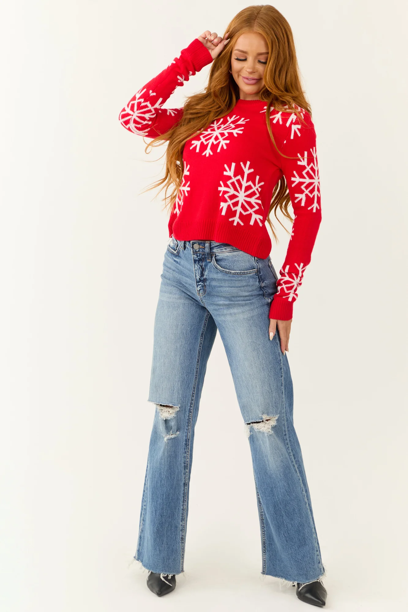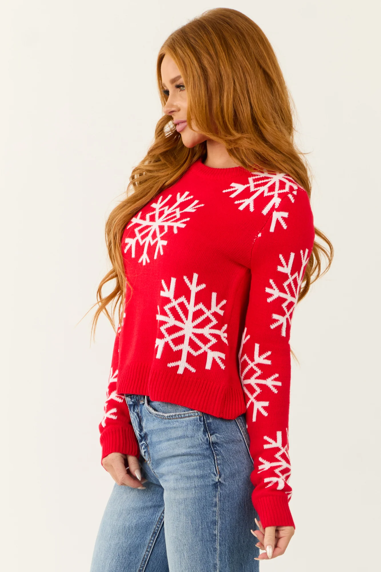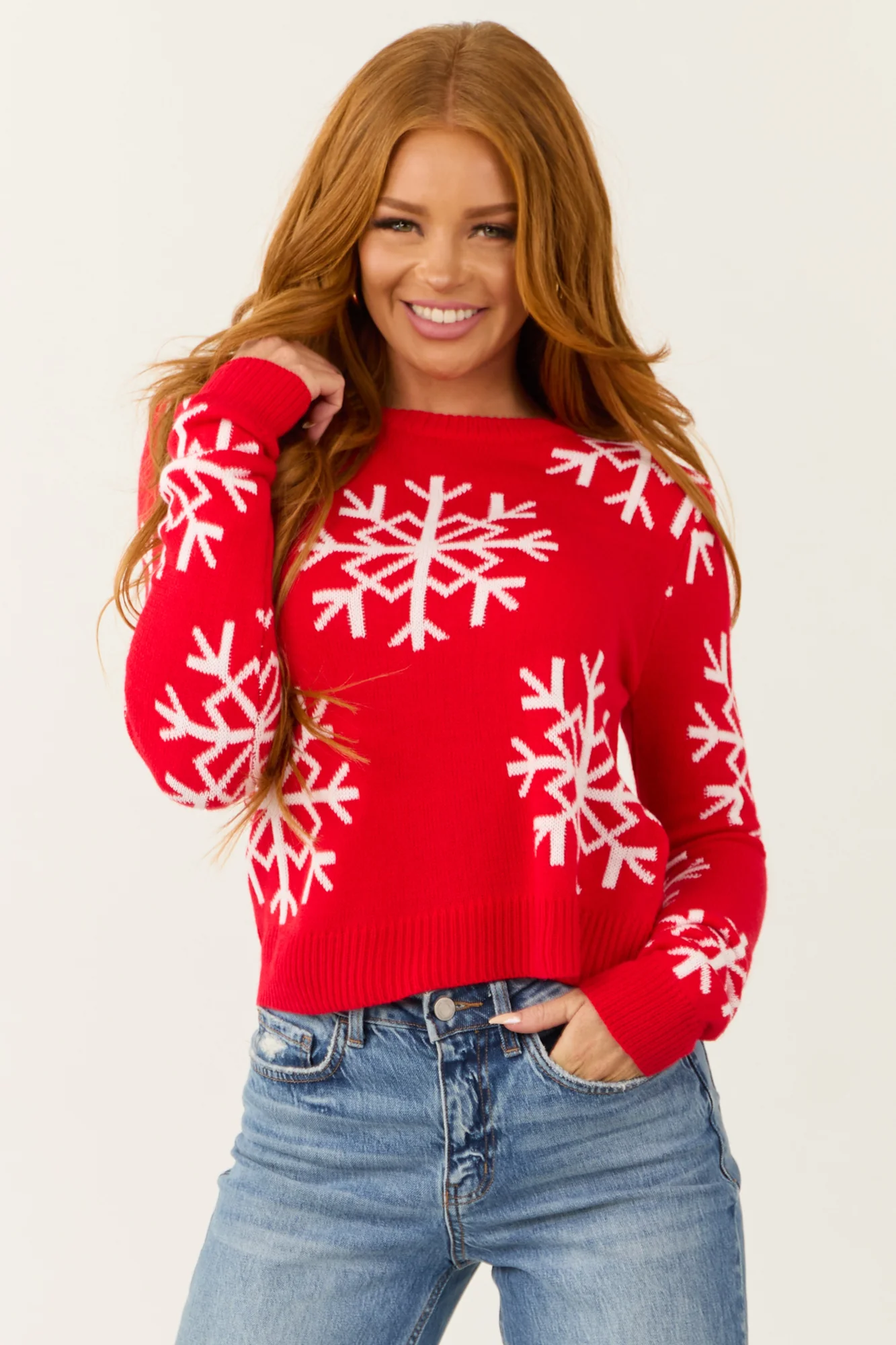 Stay warm and stylish with our Cozy Red Long Sleeve Snowflake Knit Sweater available in S, M, L, and XL sizes. Made from 100% Acrylic, this stretchy knit sweater features ivory snowflake details on the front and sleeves, a semi-cropped length, drop shoulders, and ribbed banded trim. Perfect for the winter season, pair it with your favorite jeans for a chic look. Hand wash cold and hang to dry for easy care. Model is 55″ and wearing a size Small.