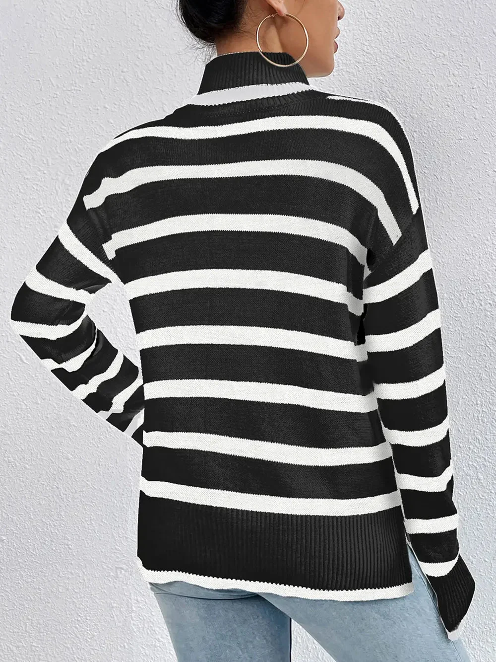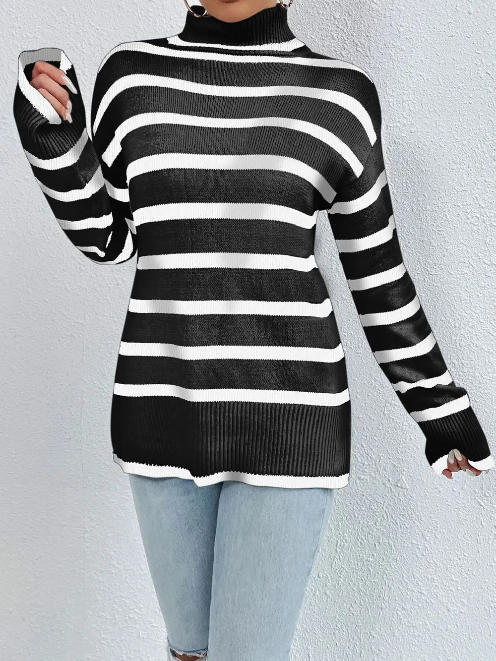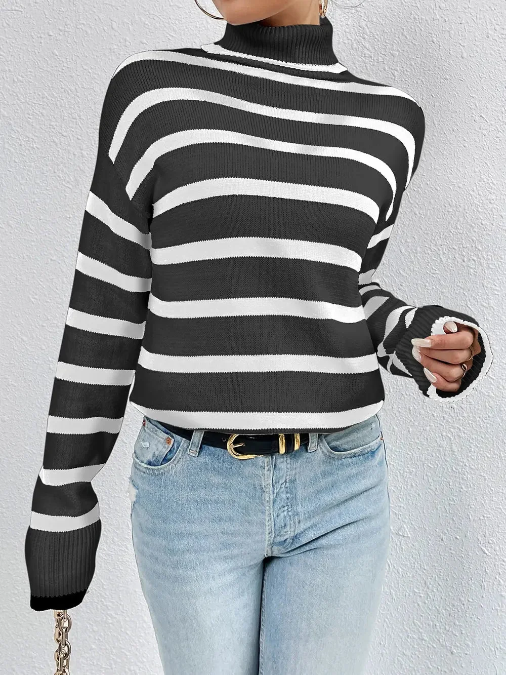 Indulge in comfort and style with our Cozy Striped Turtleneck Sweater, crafted from 100% acrylic for a soft touch. This wardrobe essential features a timeless striped design, slightly stretchy for a perfect fit. Machine washable for easy care. Available in multiple sizes.