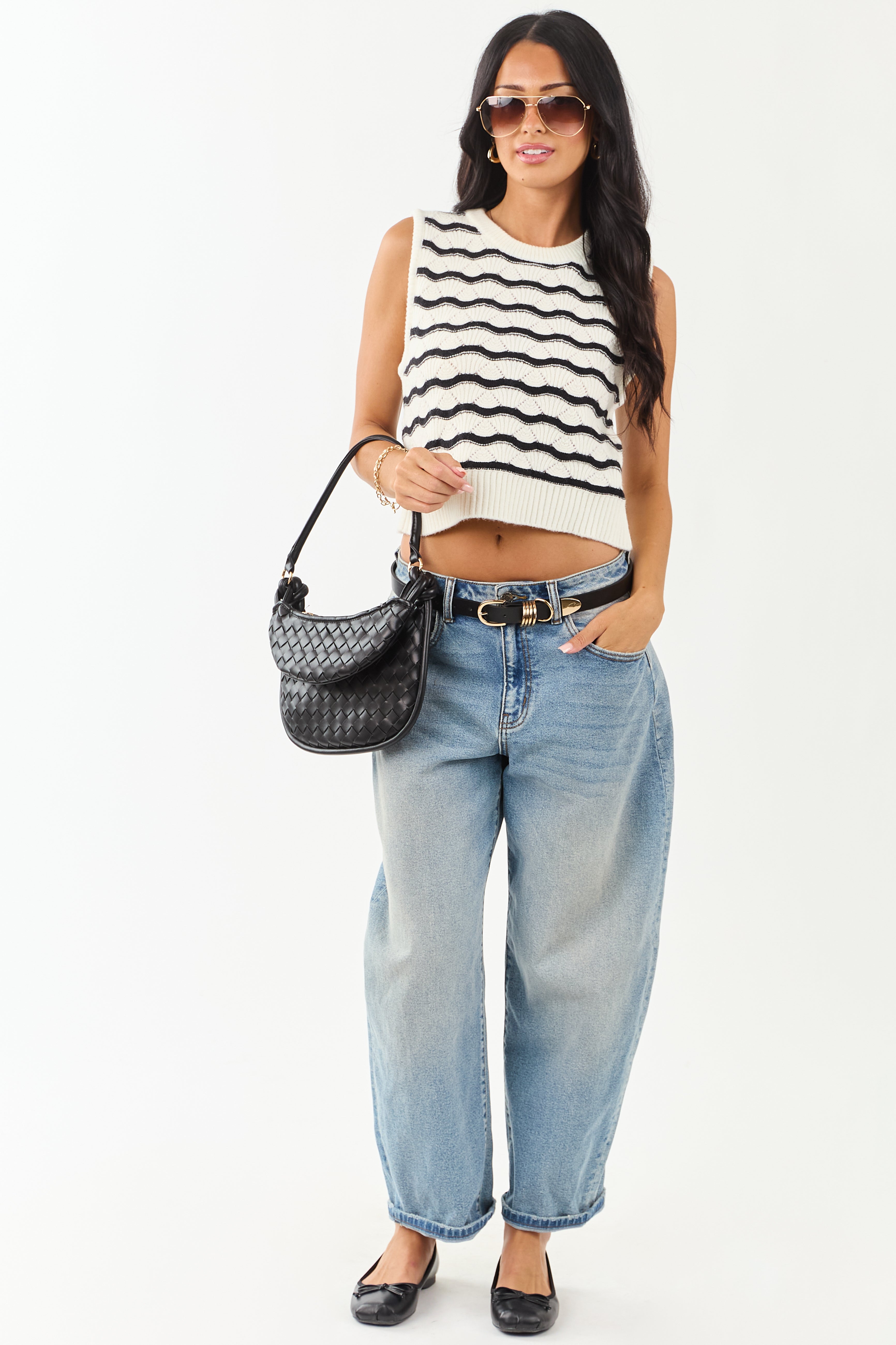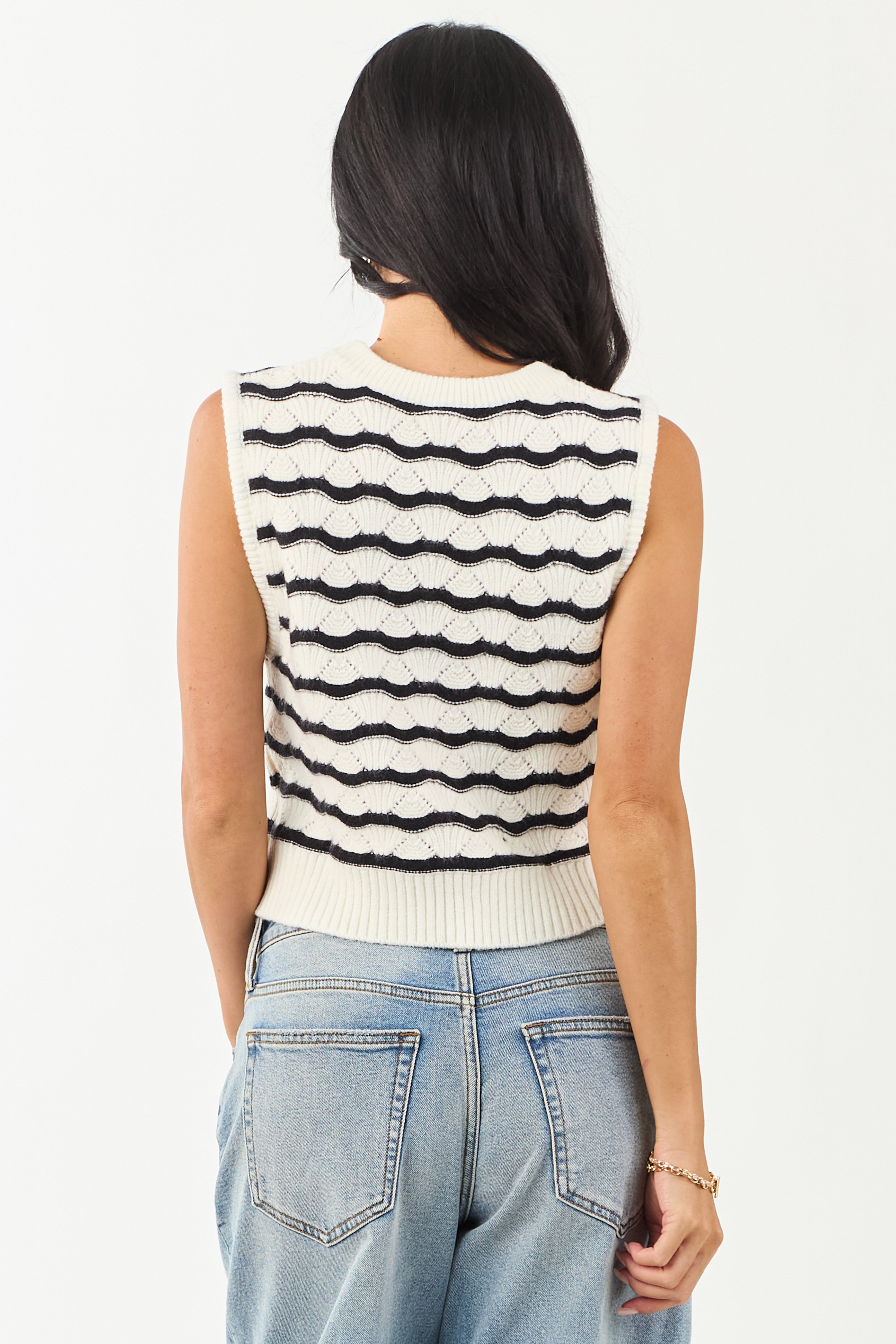 Stay stylish and comfortable in this groovy Cream and Black Striped Knit Tank Sweater. The wavy stripes create a classic color contrast that stands out. Made of stretchy knit with banded trim, this sweater tank top features a blend of 42% Acrylic, 30% Polyester, and 28% Polyamide for a cozy feel. Available in sizes S, M, and L. Ideal for casual outings or relaxed gatherings.