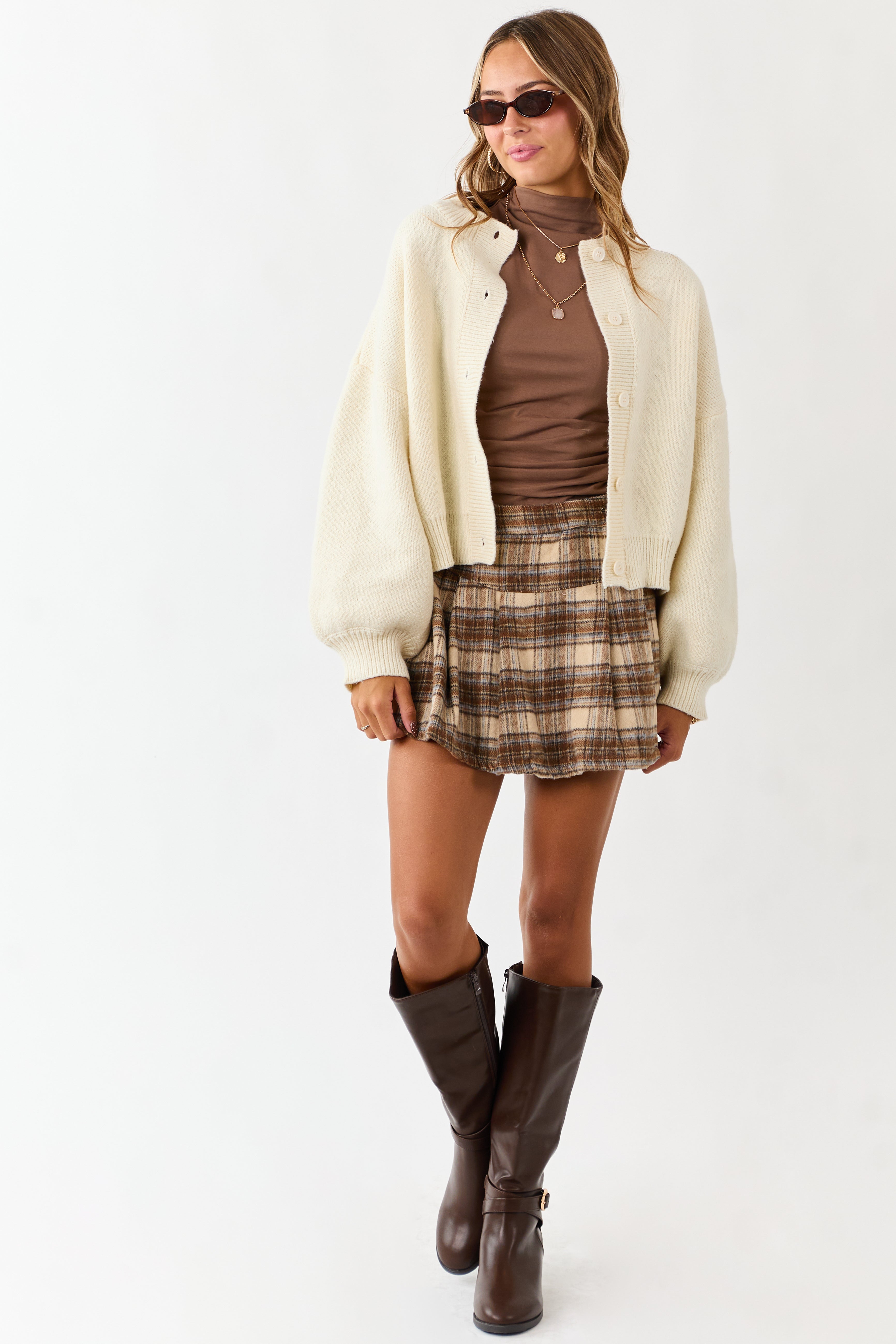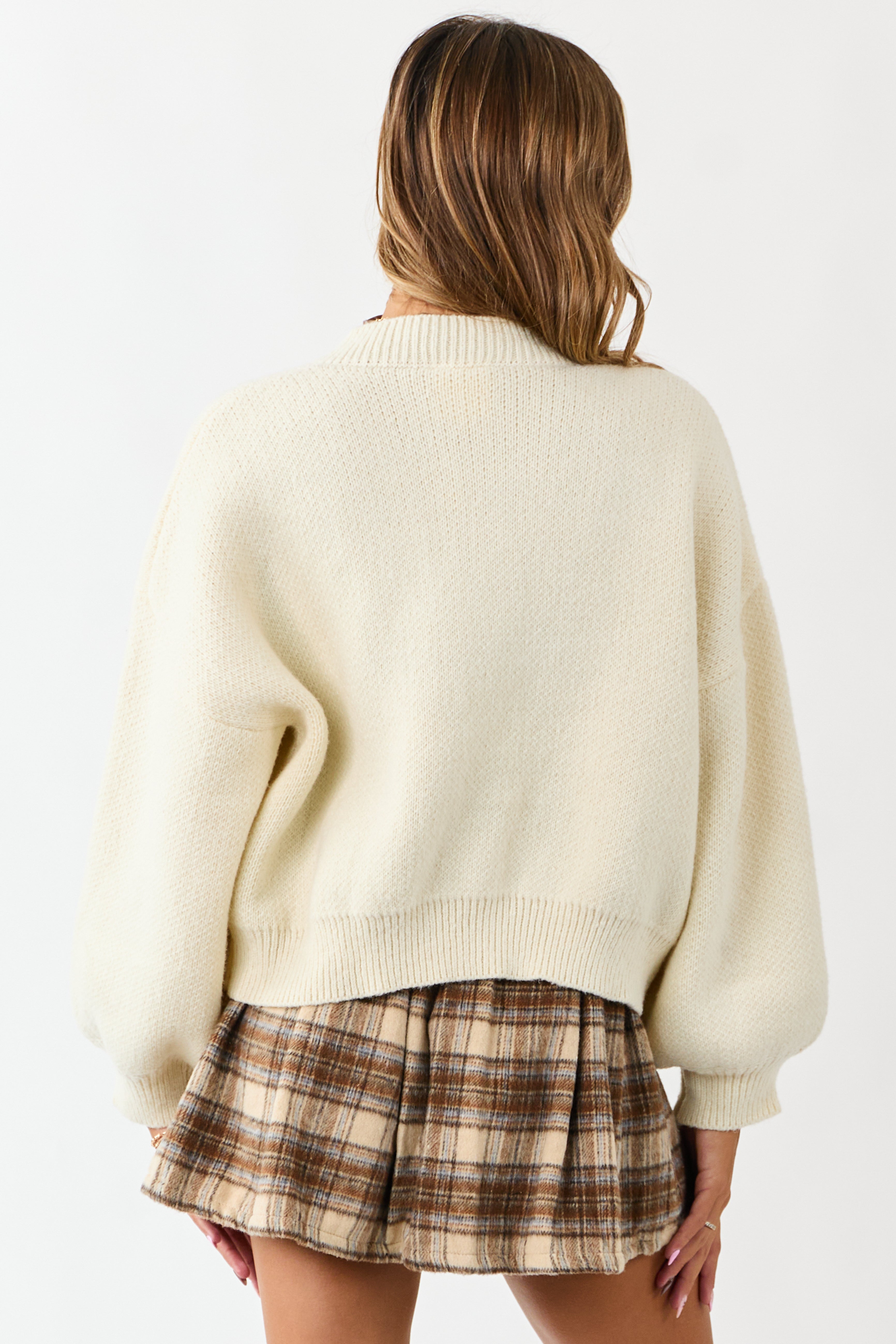 Elevate your style with this cream button down cardigan featuring dramatic puff sleeves and stand-out buttons. Made of stretchy knit with banded ribbed trim, drop shoulder design, and 100% polyester material. Perfect for layering in cool weather. Available in sizes XS, S, M, and L. Bust: 48-54″, Length: 21.5-23″, Sleeve Length: 23.5″. Imported.