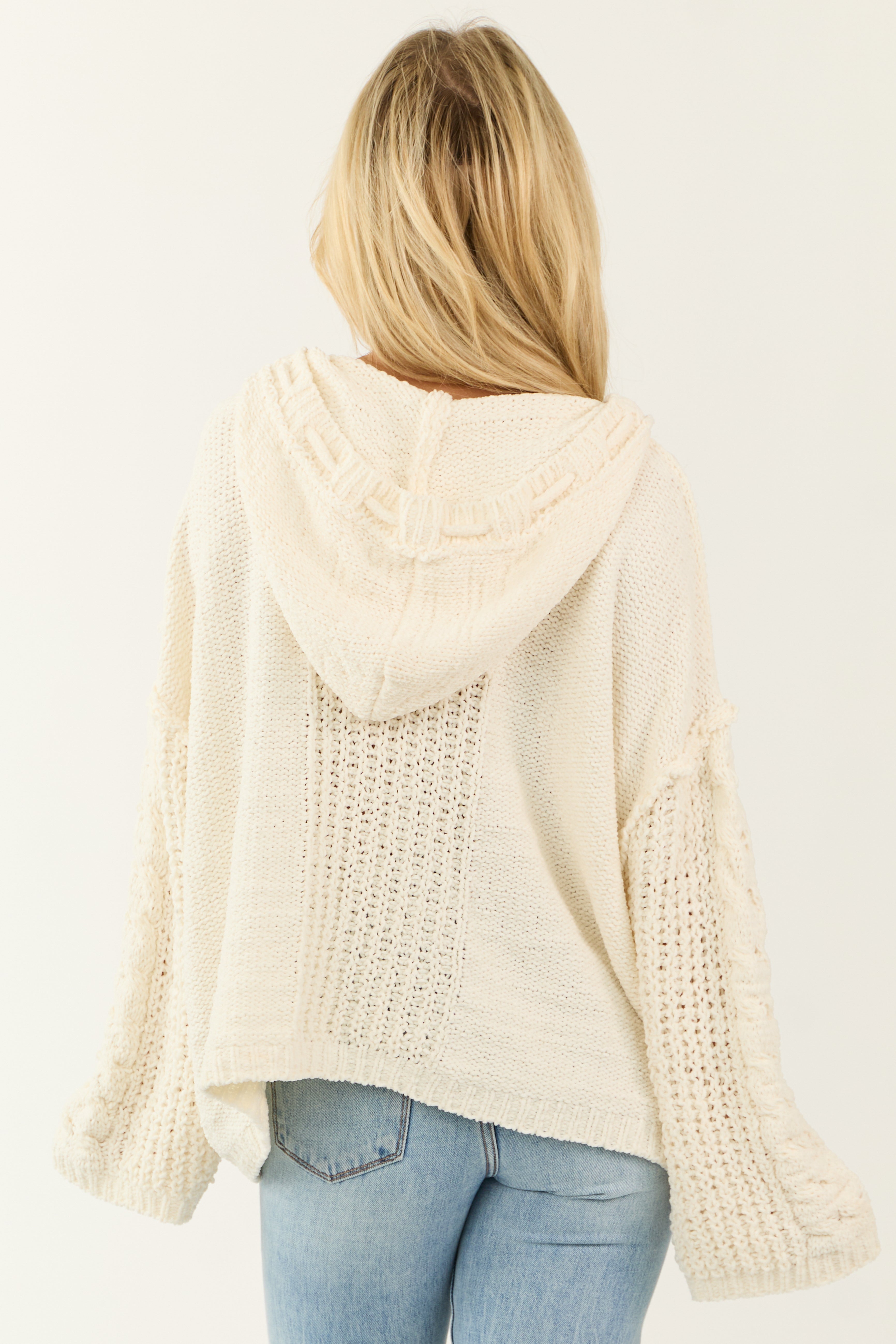 Stay cozy and stylish in this oversized Cream Cable Knit Drawstring Hood Sweater. Crafted from stretchy chunky cable knit, it features a flattering V neckline, drop shoulders, and a versatile hood with a drawstring. The long sleeves and relaxed fit make it perfect for everyday wear. Hand wash cold, line dry. Model is wearing a size Small. Available in sizes S, M, and L.