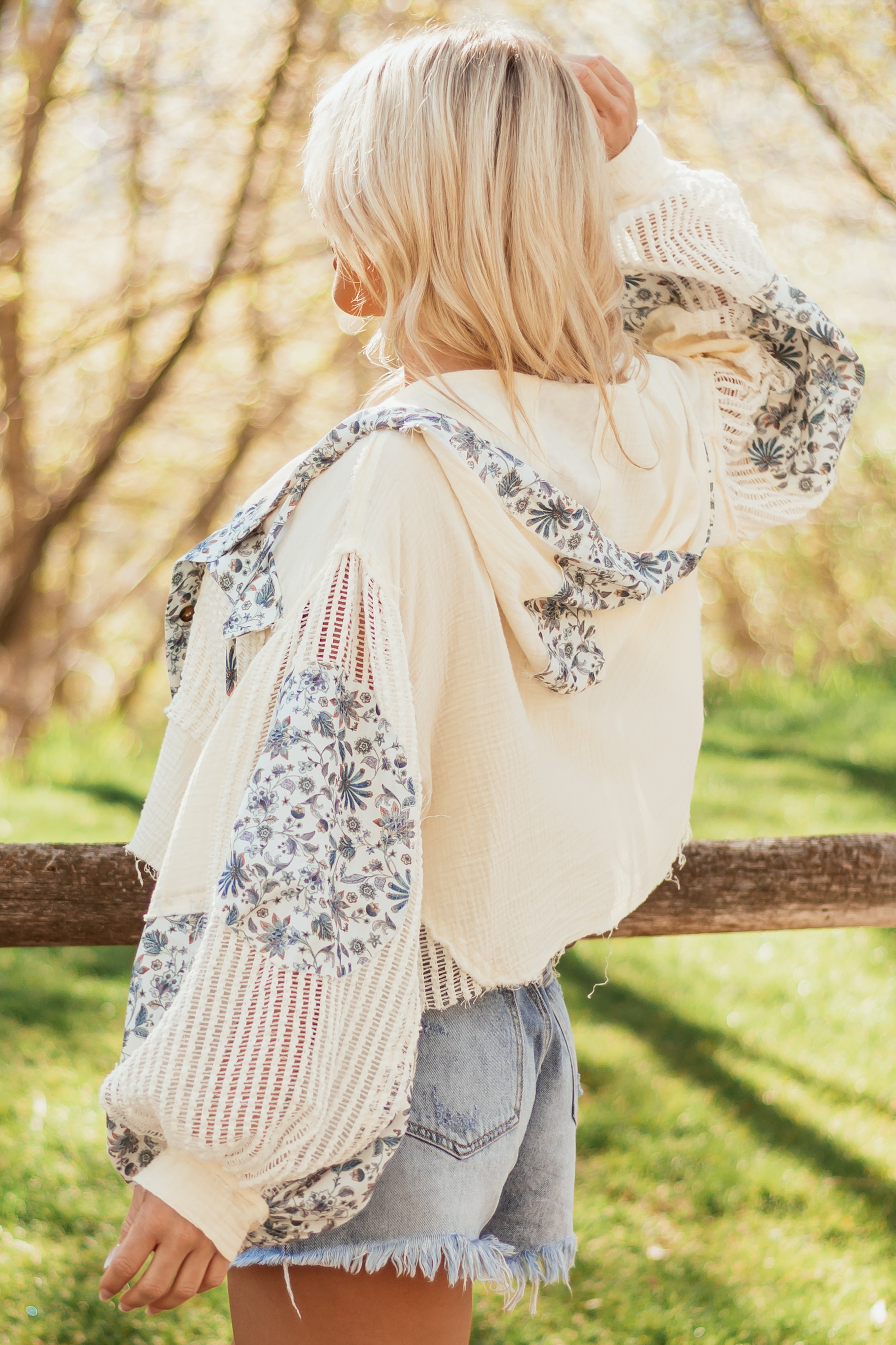 Embrace wearable art with our Cream Contrast Floral Cotton Hooded Shacket for women. This shacket features an oversized, wide boxy fit made of non-stretchy lightweight cotton. Adorned with an off white open crochet patchwork and contrast floral patterns in Cream, Sapphire, Fire, Peach, Iris, and Sky Blue, this button-down shacket boasts a semi-cropped design with drop shoulders, banded button cuffs, chest pockets, drawstring hoodie, and high-low raw hem. Uniquely designed with 100% Cotton. Due to its handmade nature, each piece is exclusive, embodying individuality and creativity. Ideal for fashion-forward individuals looking to make a bold statement. Imported.