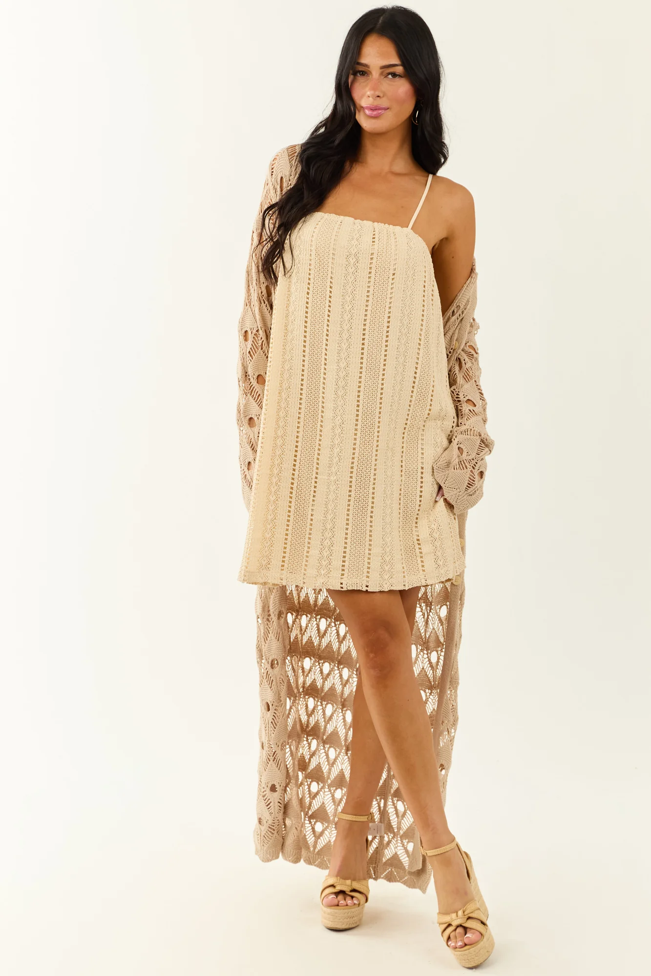 Elevate your summer style with our light, breathable cream cotton mini dress. Effortlessly refined, this dress features a loose shift fit for comfort. The elastic bust provides extra space, while the square neckline and sleeveless design offer a chic look. Adjustable spaghetti straps add versatility. Crafted from 100% cotton with a 95% polyester and 5% spandex lining, this dress is perfect for warm days. Imported. Available in sizes S, M, and L. Model is wearing a size Small. Models Measurements: Size 1, Height 59″, Bust 34″, Waist 26″.