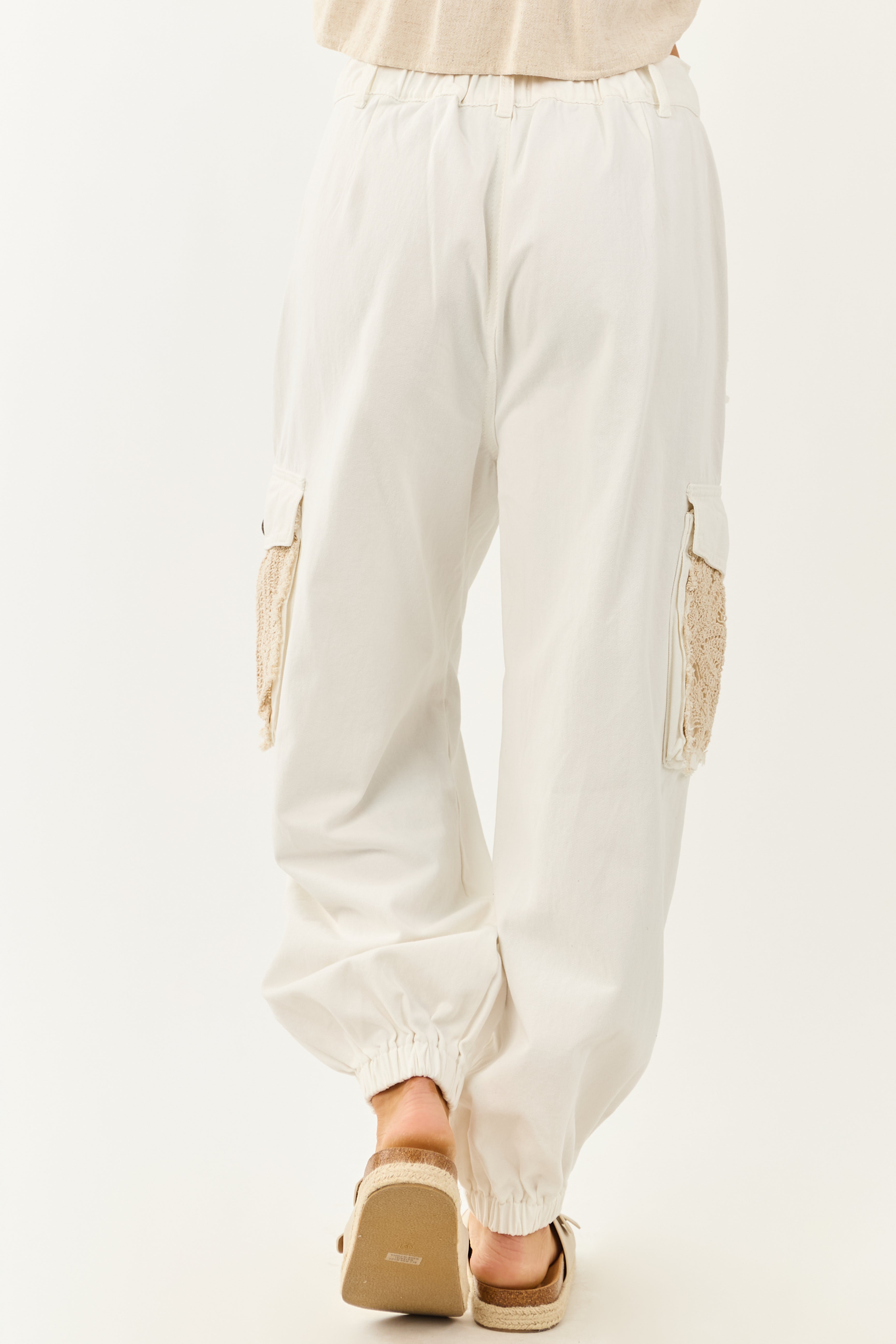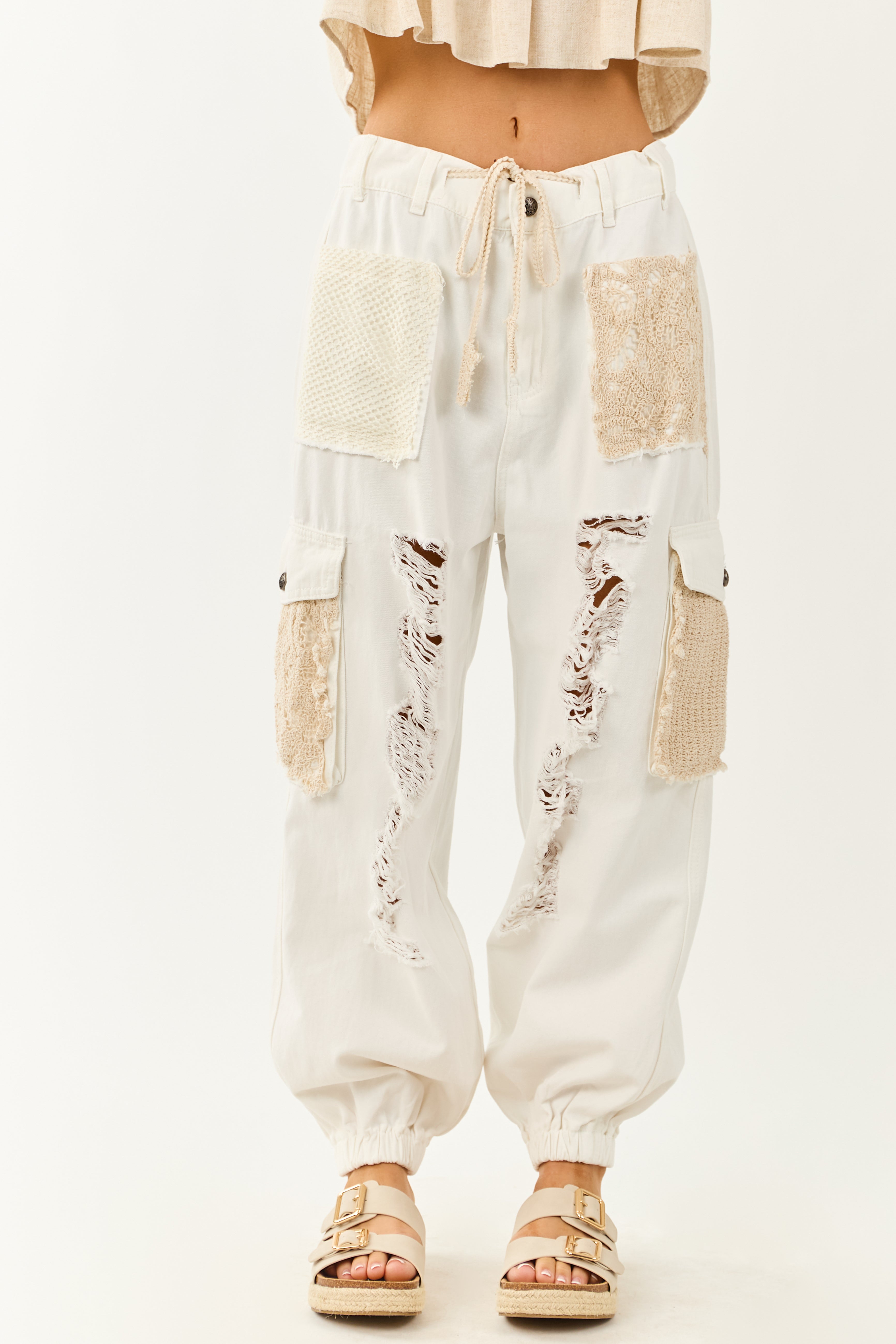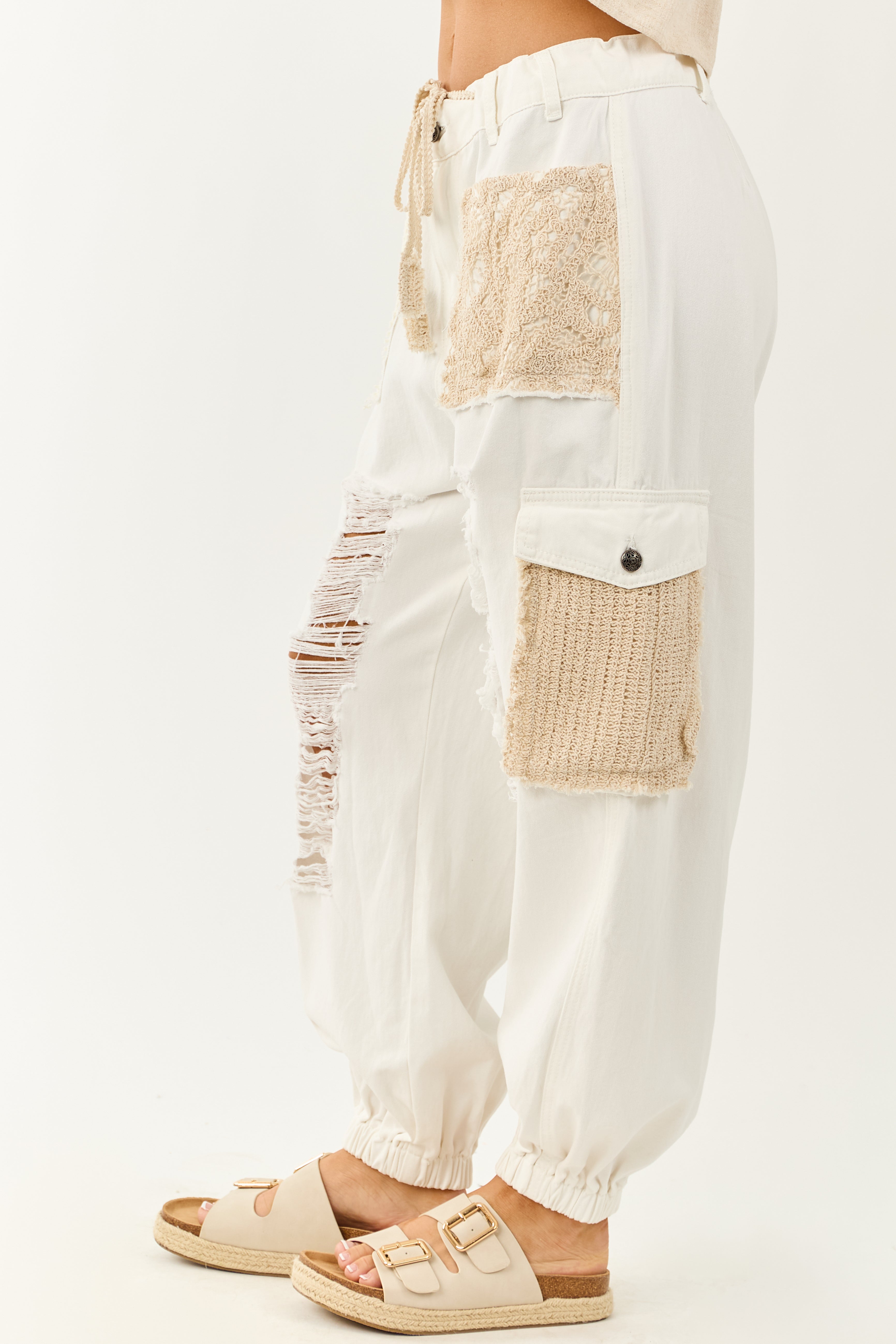 Explore the utility and artistry of these cream crochet patchwork cargo jogger pants crafted from non-stretchy denim. The high-rise design features delicate crochet patches in cream and beige, heavy distressing, and a versatile, adjustable drawstring waistband. Elevate your style with this unique blend of comfort and creativity. Available in sizes XS to XL. Perfect for casual outings, the inseam measures 27 inches for a stylish yet relaxed look.