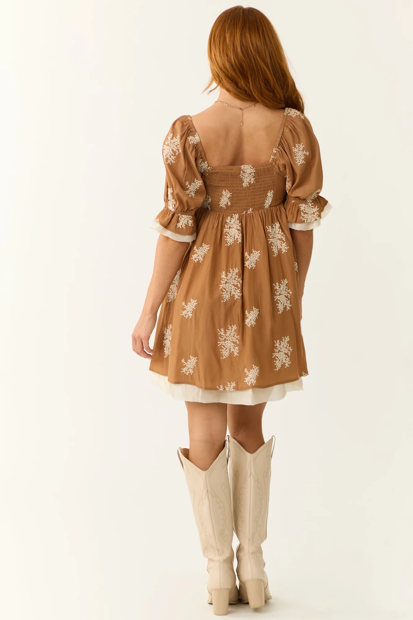 Indulge in elegance with our Cream Embroidered Puff Sleeve Babydoll Dress. This babydoll-style dress features delicate tulle trim and intricate embroidery in a relaxed fit. Crafted from a blend of 60% Rayon and 40% Spandex, it offers comfort and style. The square neckline, short puff sleeves, and elastic ruched back complete the look. Perfect for a date night, this non-stretchy woven dress is lined for a luxurious feel. Care instructions: Hand wash cold, hang to dry. Model is wearing size Small. Size S: Sleeve 14, Bust 30, Waist 28, Length 33. Size M: Sleeve 14.5, Bust 33, Waist 30, Length 34. Size L: Sleeve 15, Bust 36, Waist 32, Length 35.