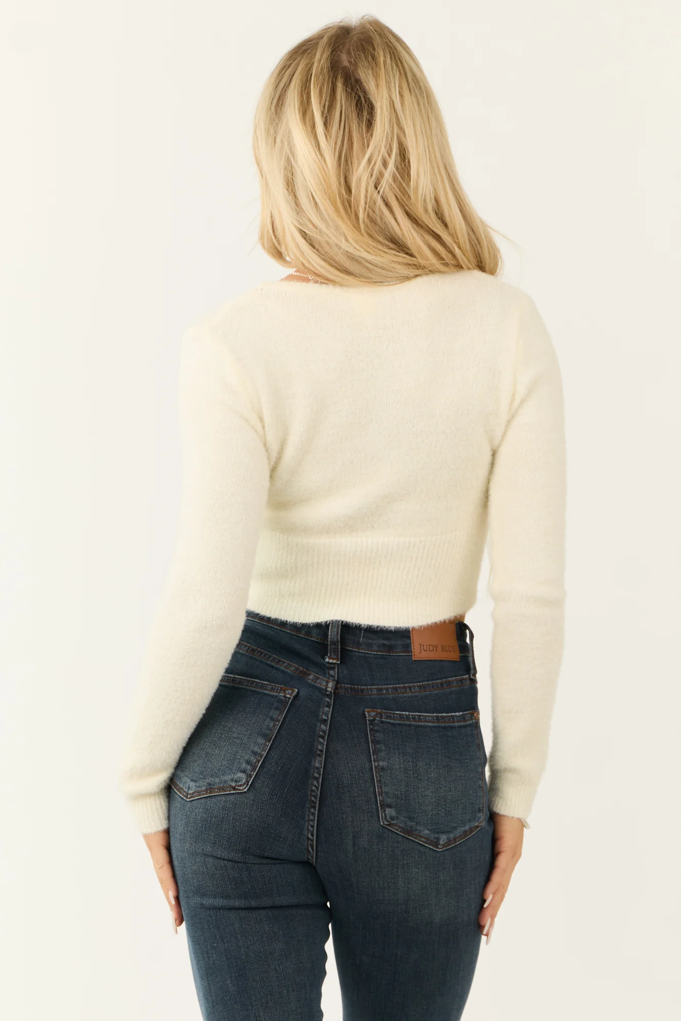 Stay cozy and stylish with our Cream Eyelash Knit Cropped Sweater. Crafted from a stretchy knit blend with a ribbed banded trim, this sweater features a flattering V neckline, long sleeves, and a trendy cropped length. The drop shoulder design adds chic allure, making it a versatile addition to your wardrobe. Care instructions: Hand wash with cold water, line dry, iron low, do not bleach, do not tumble dry. Model is wearing a size Small. Model Profile: Size 1, Height 57″, Bust 34″, Waist 26″.
