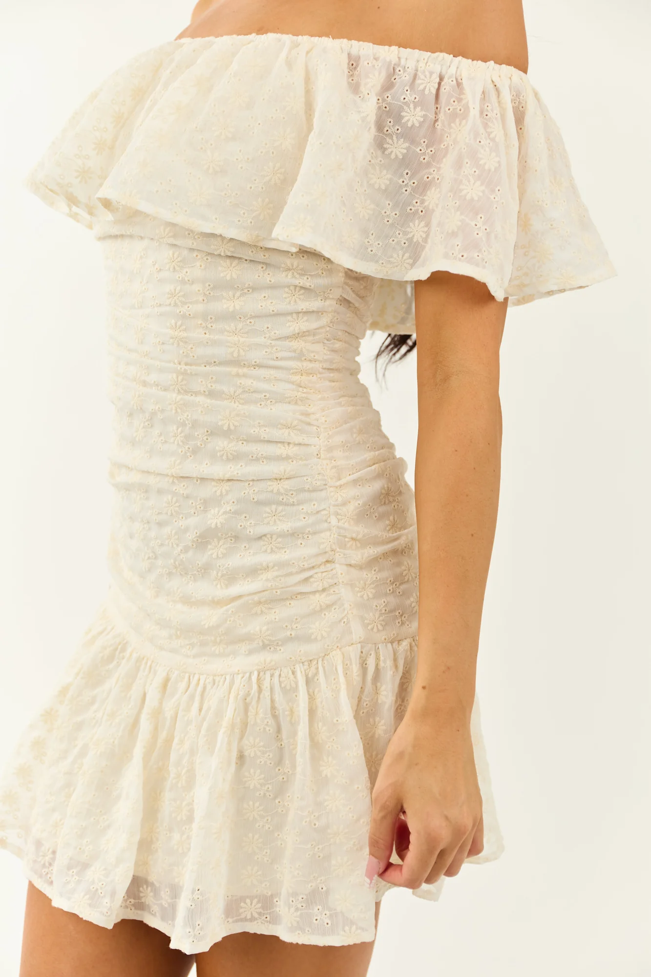 Indulge in romance and elegance with our Cream Eyelet Lace Ruffle Mini Dress. Crafted from a blend of 65% Polyester and 35% Cotton, this dress features a fitted sheath style with non-stretch eyelet lace. The elastic off-shoulder neckline and ruffle bust overlay add a charming touch, while the back zipper ensures easy wear. Perfect for golden hour moments, this dress is lined with 100% Rayon and includes ruched sides for a flattering silhouette. Available in sizes S, M, and L.