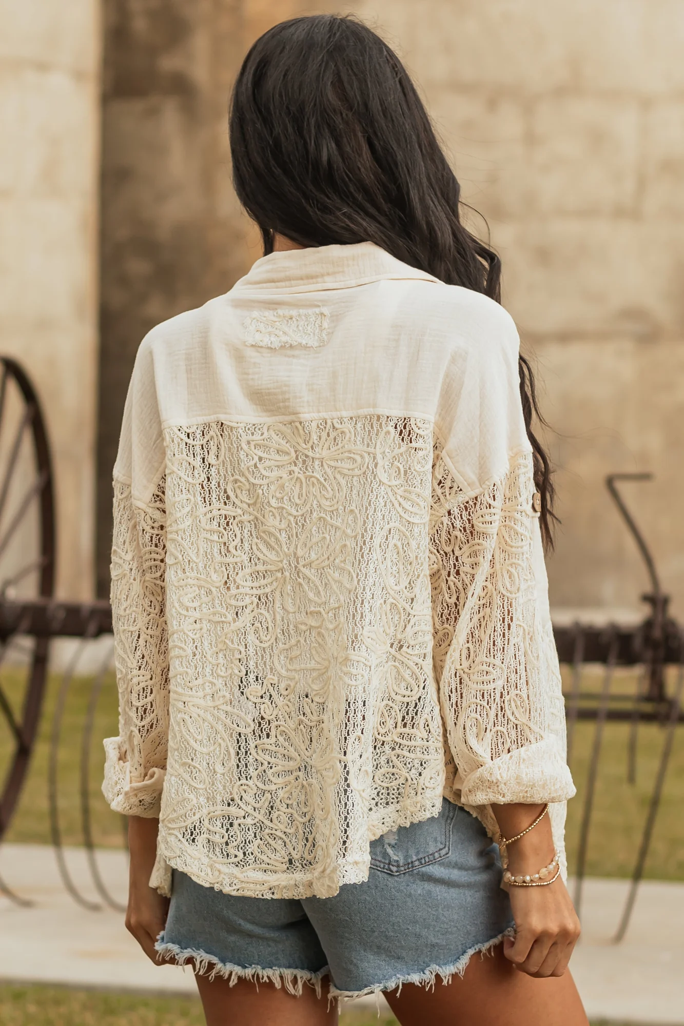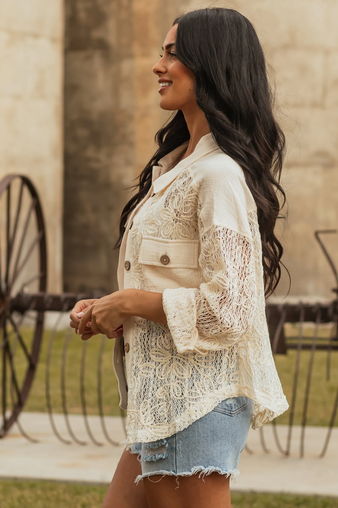 Elevate your style with this charming cream shacket featuring 3D floral accents, a button-down front, oversized fit, and semi-stretchy open knit construction. The non-stretchy cotton gauze contrasts beautifully with ivory threading, while the buttoned chest pockets and banded button cuffs add a touch of sophistication to your look. Made of 70% Polyester and 30% Cotton with 100% Cotton contrast. Imported.