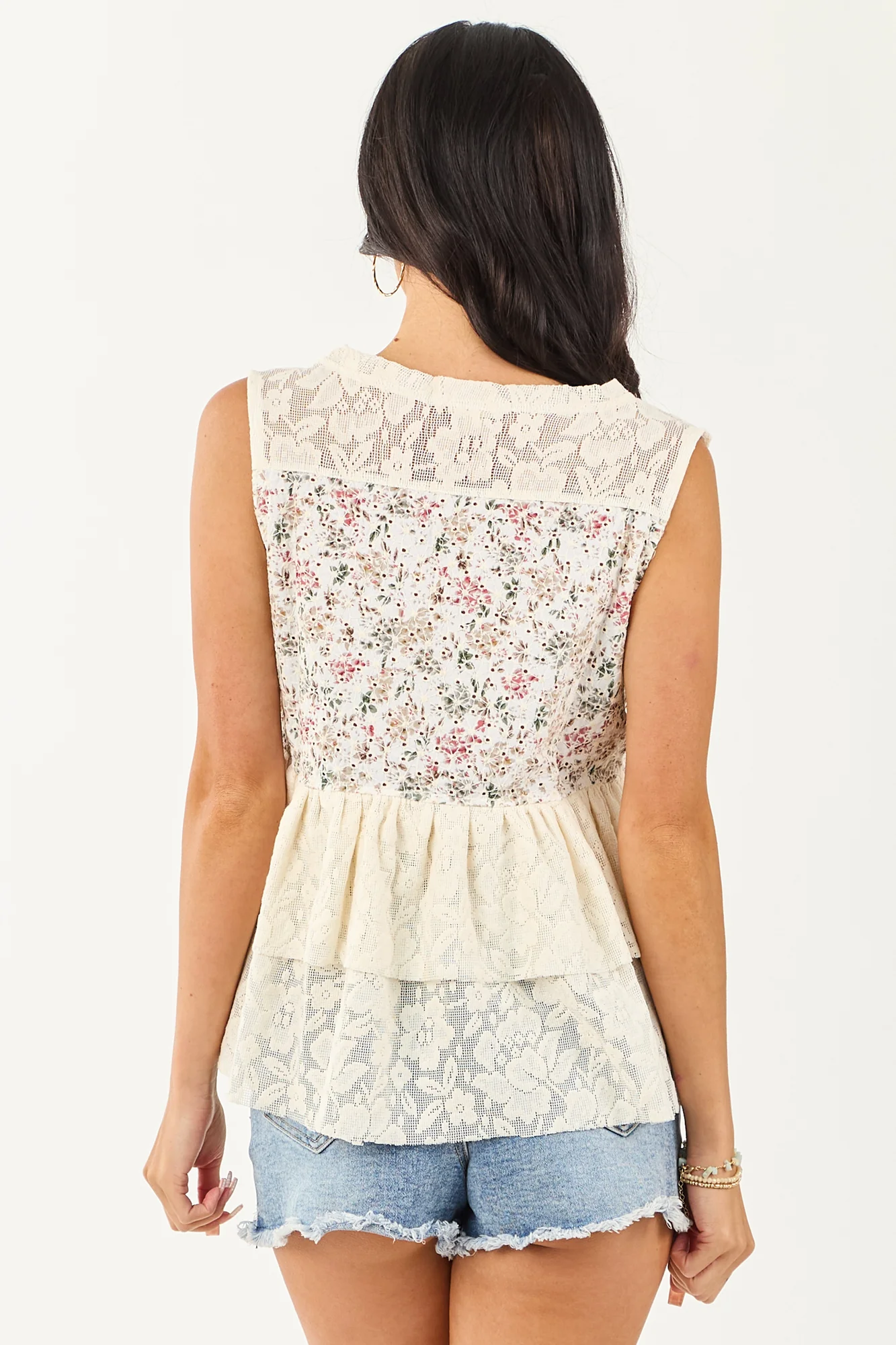 This charming tank top features delicate floral prints, soft lace contrast, and a peplum hem, perfect for warm days. Crafted from a non-stretchy cotton blend with open eyelet embroidery detailing on an Army Green, Punch, and Taupe color palette. The cream sheer lace back yoke and hem add an elegant touch. Sizes available: S, M, L. Bust: 38″-42″. Length: 23″-25″. Strap: 3″. Model is 59″ tall, wearing a size Small (Size 1), with a bust of 34″ and waist of 26″.