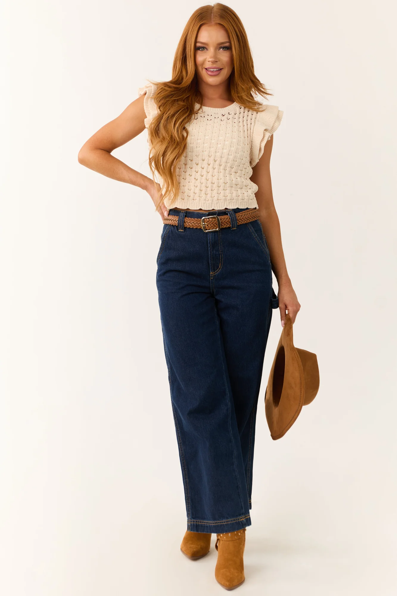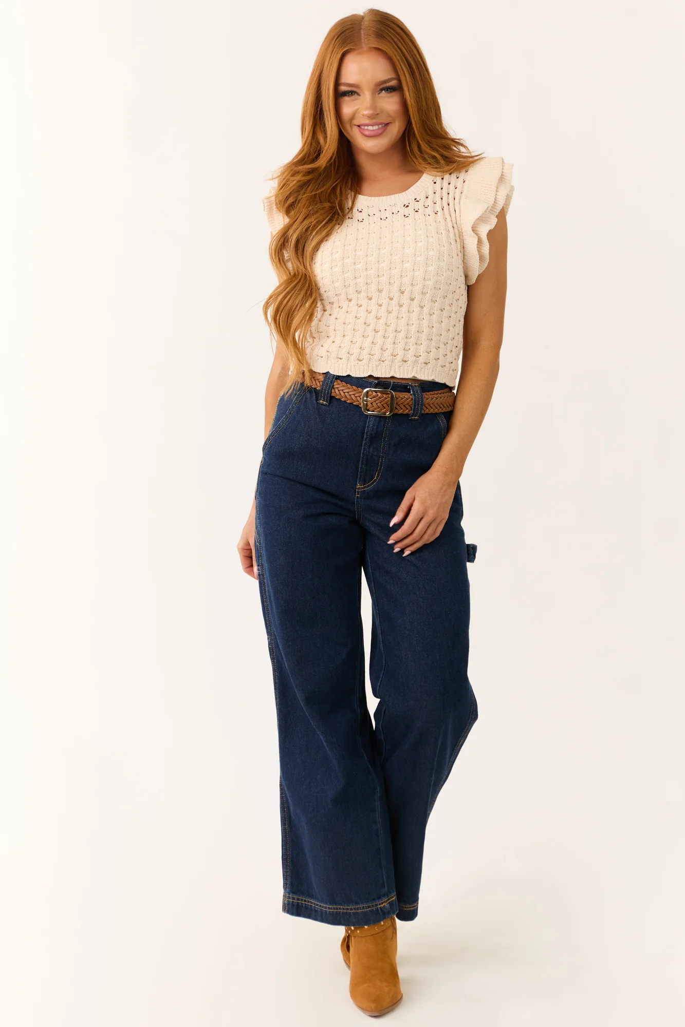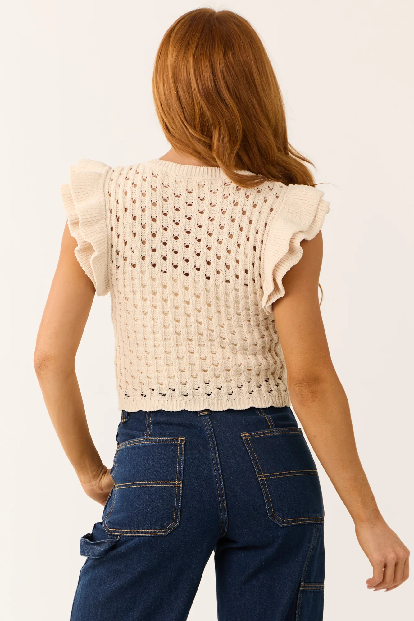 Indulge in cozy elegance with our Cream Knit Ruffle Sleeve Sweater . Crafted from stretchy open knit fabric with stylish ribbed trim and a charming scallop hem, this cropped sweater features short ruffle sleeves for a playful touch. Available in sizes S, M, and L with a length range of 17″ to 19″ and bust sizes from 28″ to 32″. Ideal for daytime or date night, this top pairs wonderfully with any bottom for a chic look. 100% Polyester. Imported. Dry clean only for best care. Model is 55″ and wears a size Small.