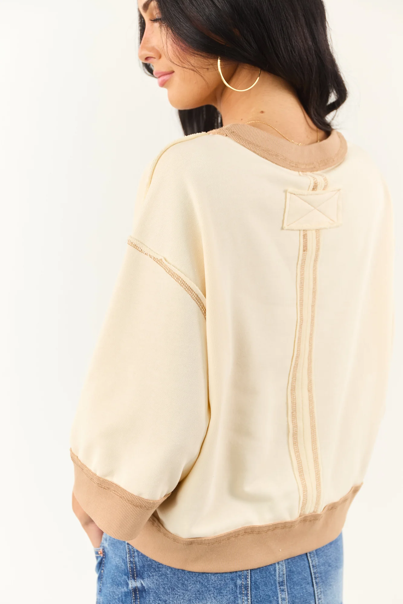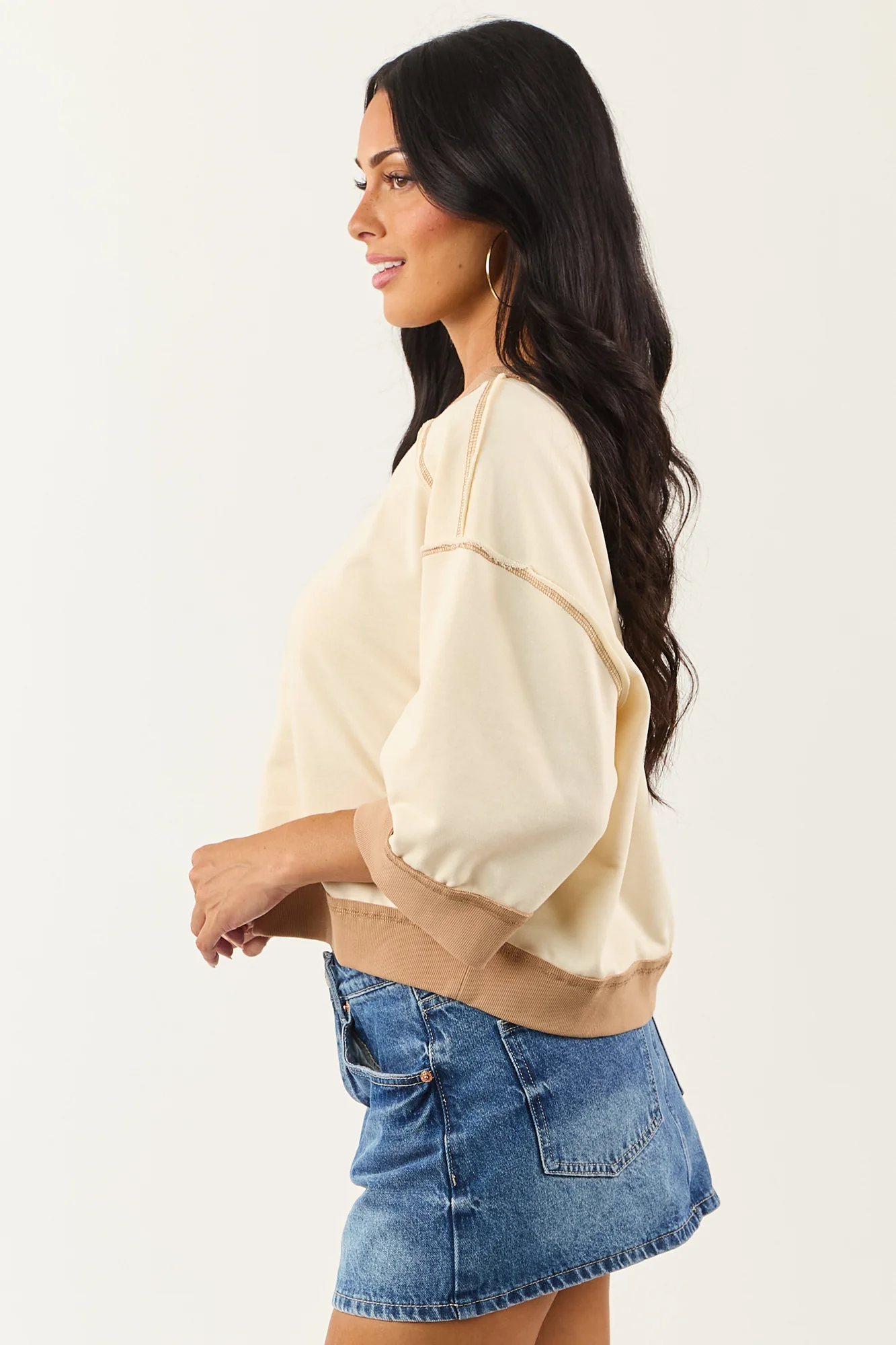 This cream knit top comes in sizes S, M, and L with bust measurements of 48″, 50″, and 52″, and length options of 21″, 21.5″, and 22″. The top features a relaxed fit, soft knit texture, drop shoulder design, and ribbed coffee-colored trim for added style. Made of 53% Cotton and 47% Polyester with 95% Cotton and 5% Spandex contrast details. Perfectly paired with the Entro Cream Contrast Waistband Knit Mini Skort. Imported.