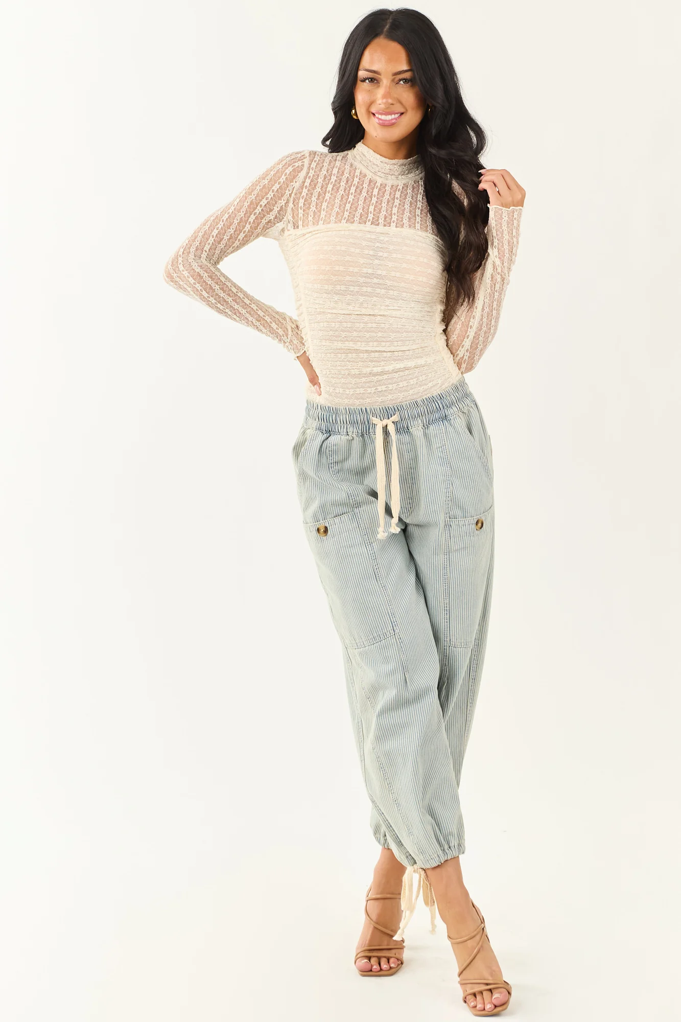 Indulge in the allure of our Cream Lace Mesh Ruched Bodysuit, crafted in sultry yet sweet lacy details. This bodysuit features a mock neck, sheer sleeves and yoke, and a cheeky cut design with a double snap button crotch closure. The stretchy knit mesh offers both comfort and style, making it an ideal pairing with jean shorts, maxi skirts, or any ensemble that calls for a little drama. Youll love the lined torso, the impeccable attention to detail, and the flattering silhouette it offers. Imported and made of 90% Nylon and 10% Spandex, with 95% Polyester and 5% Spandex lining. Embrace your inner elegance with this final sale piece. Model is wearing size Small.