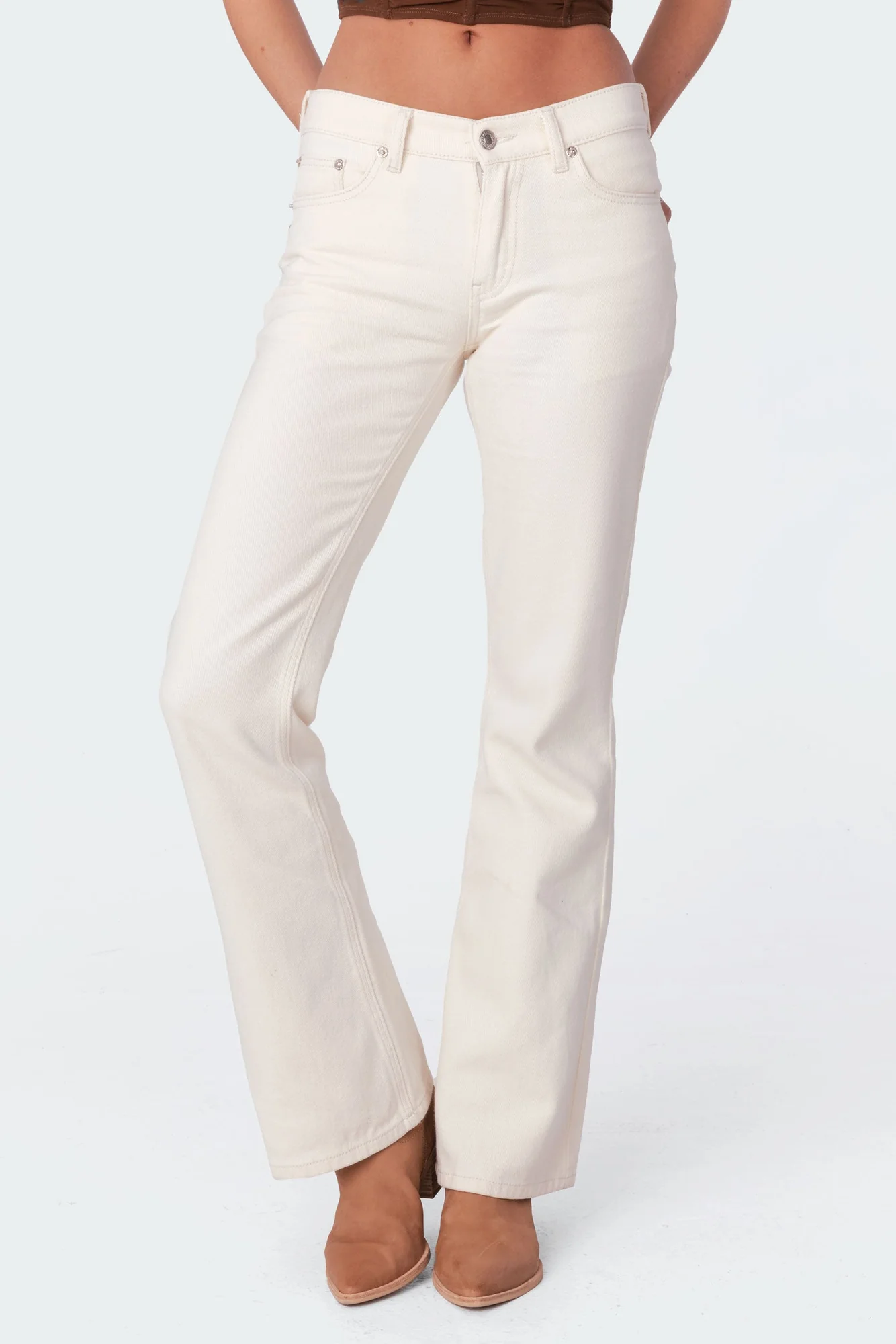 Get the trendy low-rise look with these cream denim pants. Made from durable cotton fabric, these pants are super comfortable for year-round wear, keeping you stylish and on-trend. The versatile cream color allows for easy styling with different outfits, making these pants a must-have in your wardrobe. Care instructions: Machine wash in cold water with like colors. Model is wearing size S. Model Height – 57.