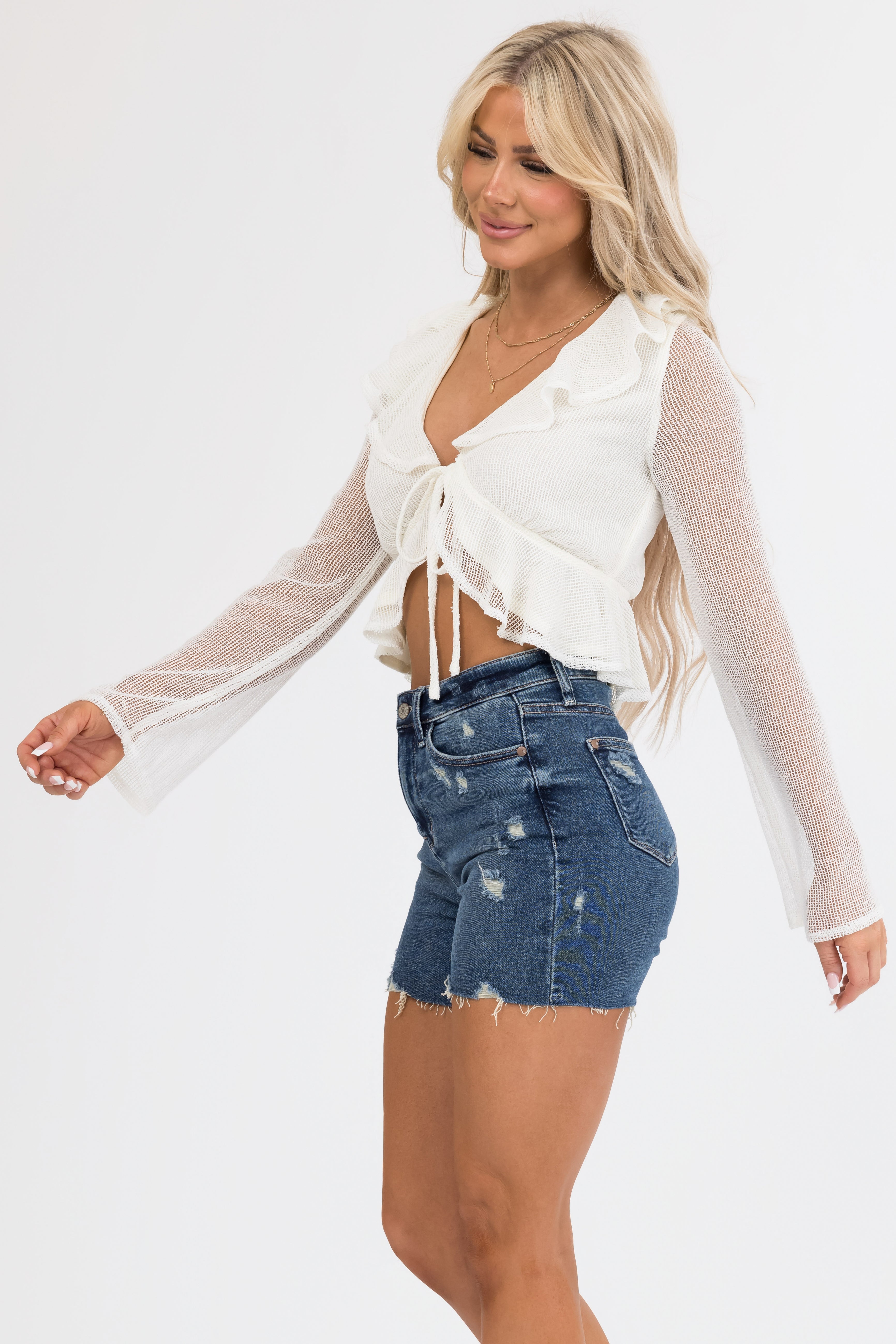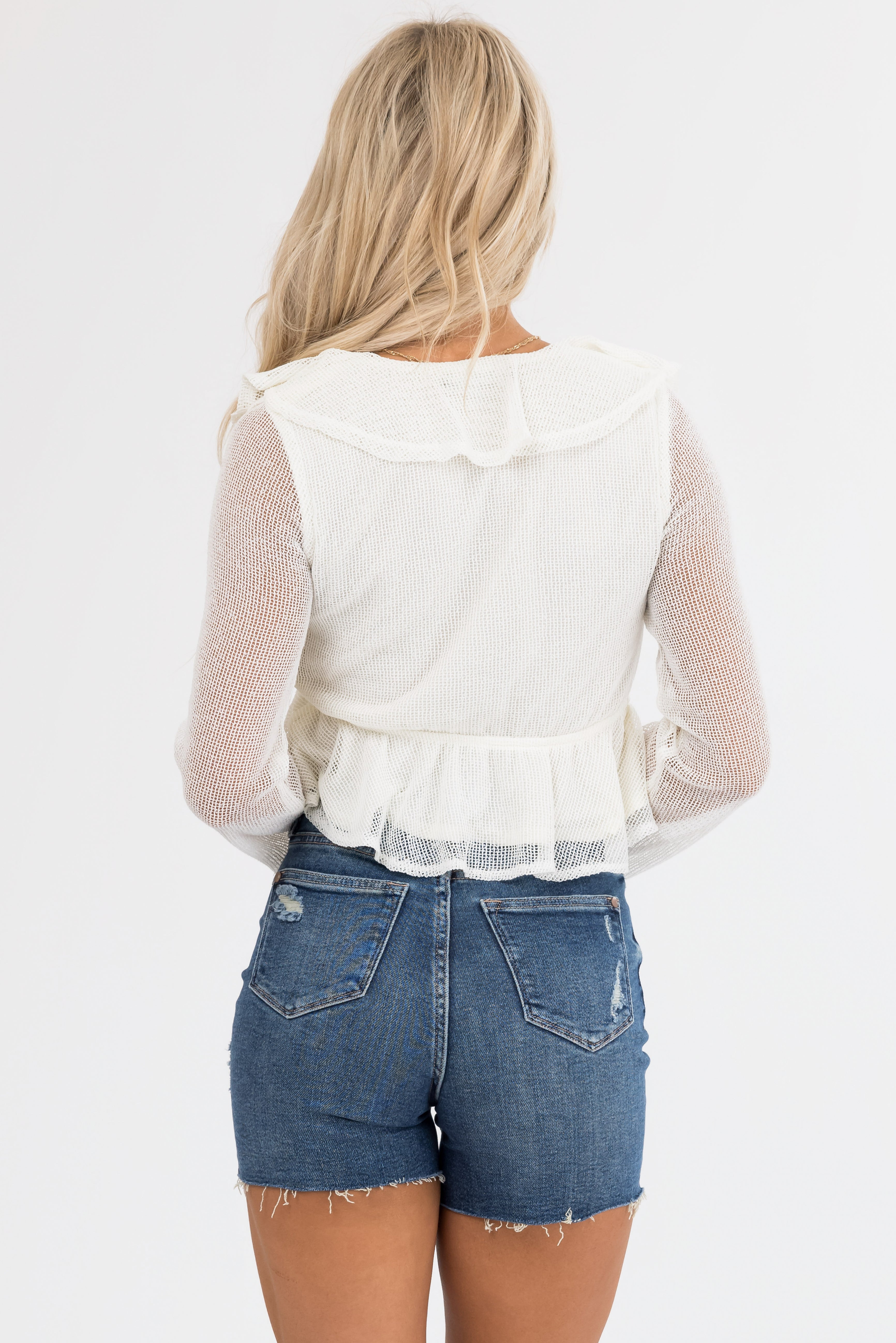 Upgrade your wardrobe with our Cream Mesh Bell Sleeve Crop Top featuring a V neckline with ruffle detail, slim bell mesh sleeves, semi-cropped length, and a curved empire ruffle hemline. This slightly sheer top is perfect for any occasion. Made of non-stretchy woven fabric with 100% Polyester lining for a comfortable fit. Pair it with our Cream Mesh Maxi Skirt with Back Slit for a stunning ensemble. Hand wash cold and line dry for best care results. Available in sizes S, M, and L.