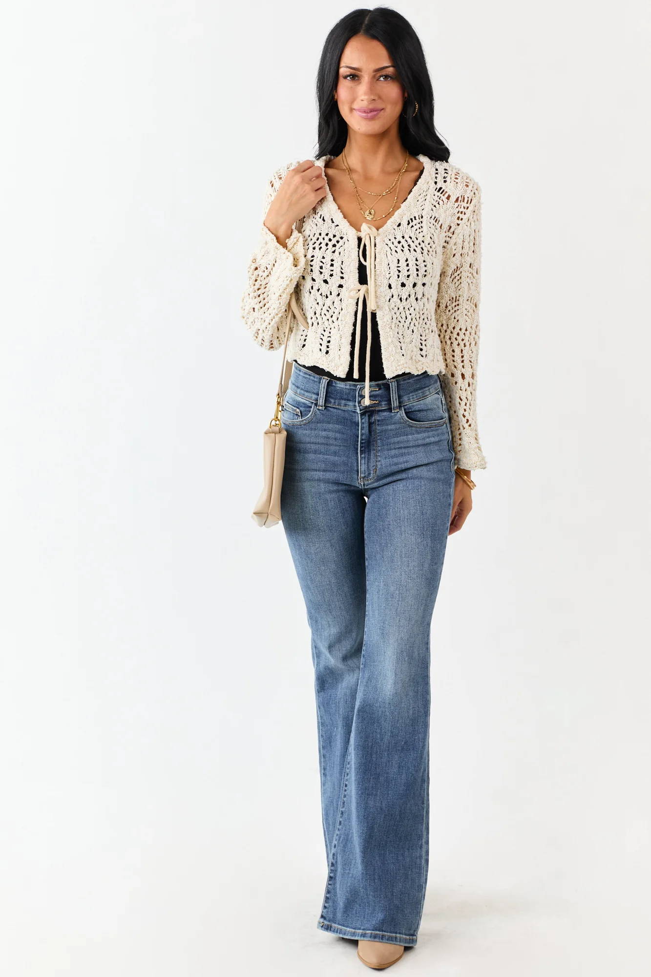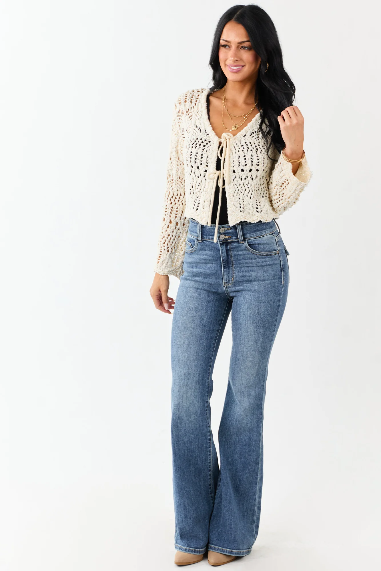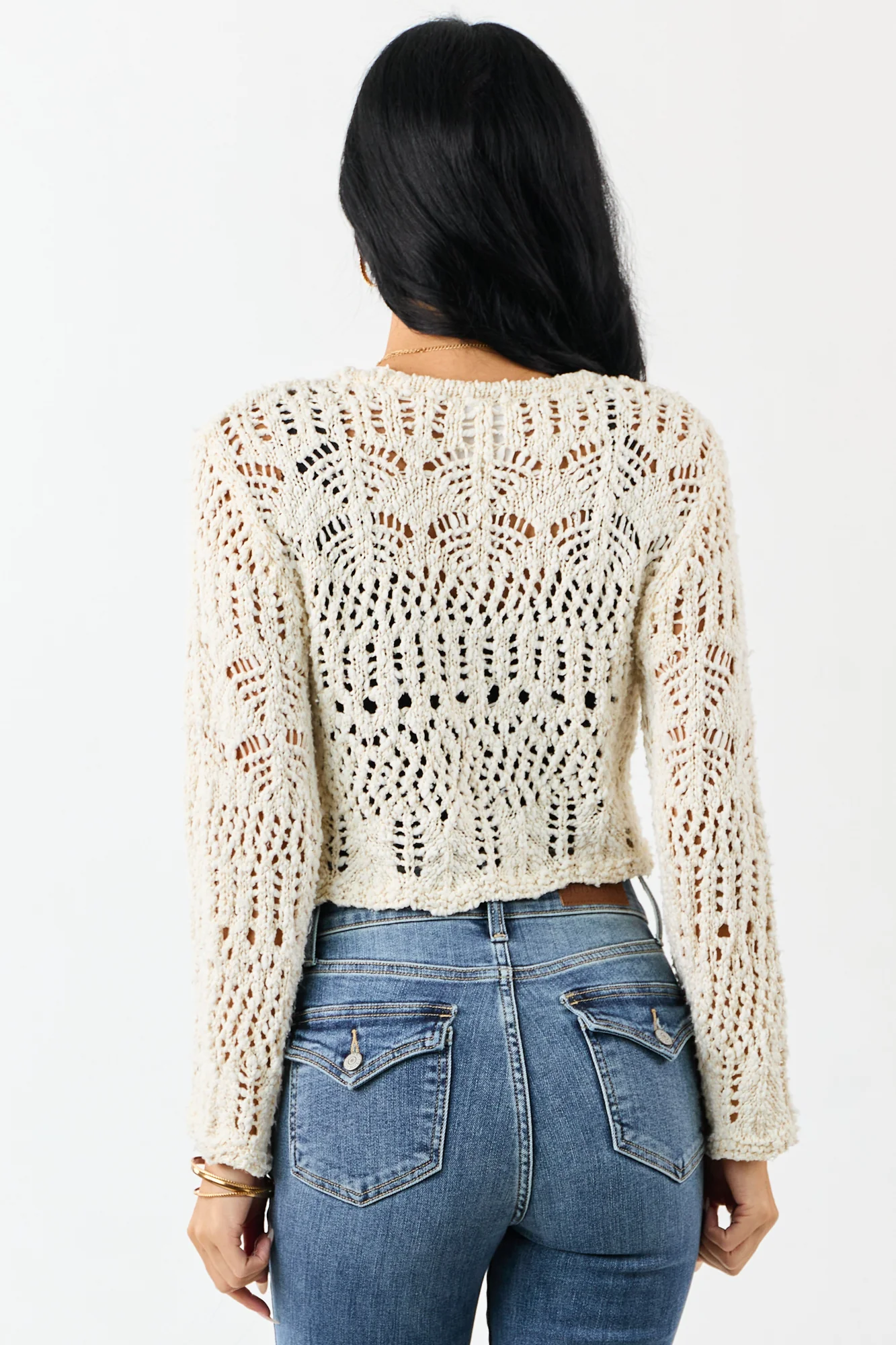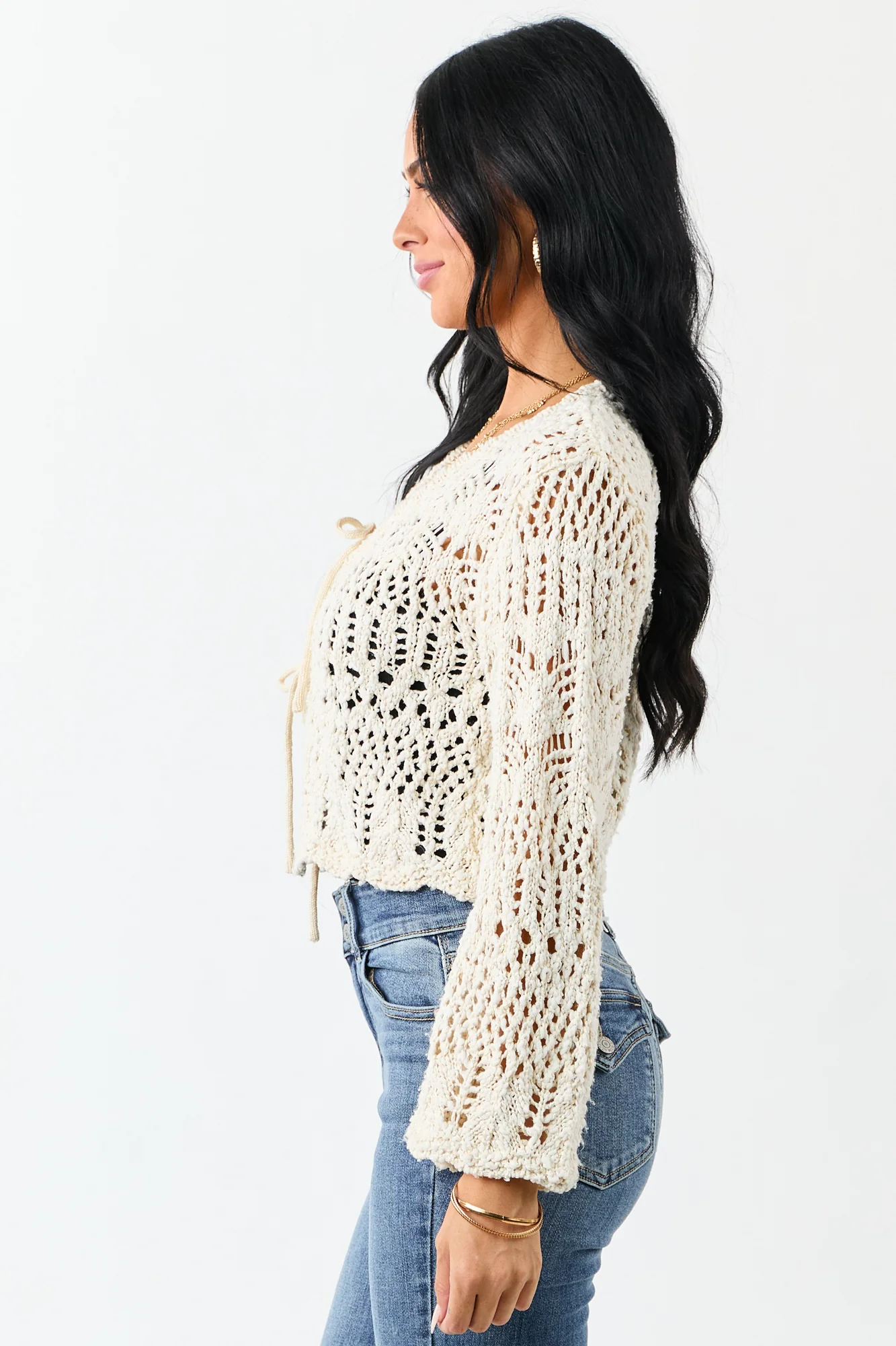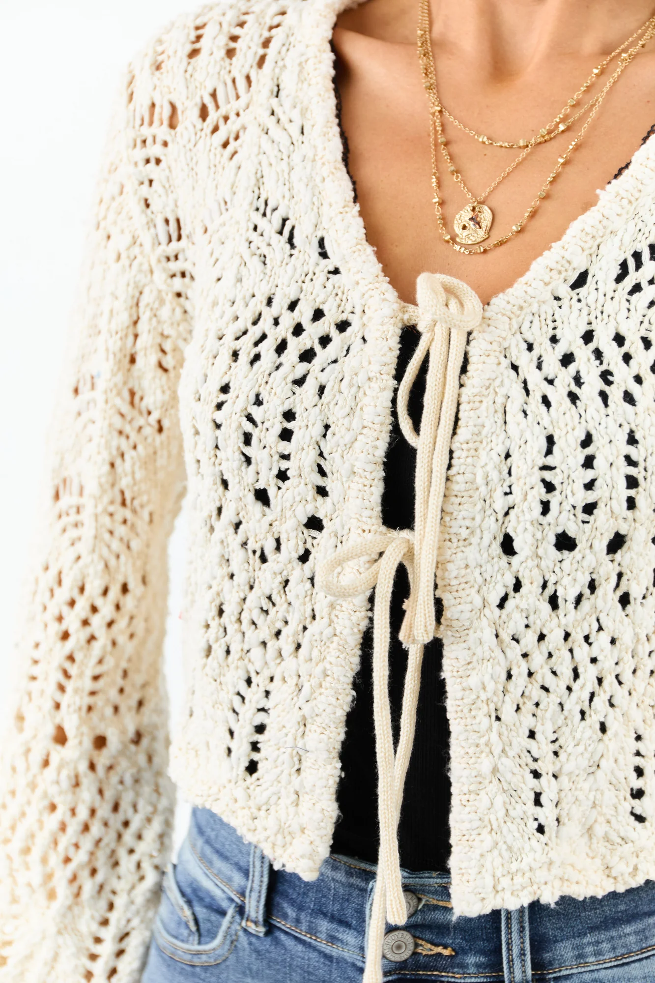 Stay cozy and stylish with our Cream Open Knit Tie Cardigan! This beautiful sweater features a slight flare sleeve, open crochet knit, V neckline, and a cropped length. Crafted from 60% Acrylic and 40% Polyester, this unlined cardigan is perfect for any occasion. Hand wash cold, dry flat, and look effortlessly chic. Available in sizes XS, S, M, and L.
