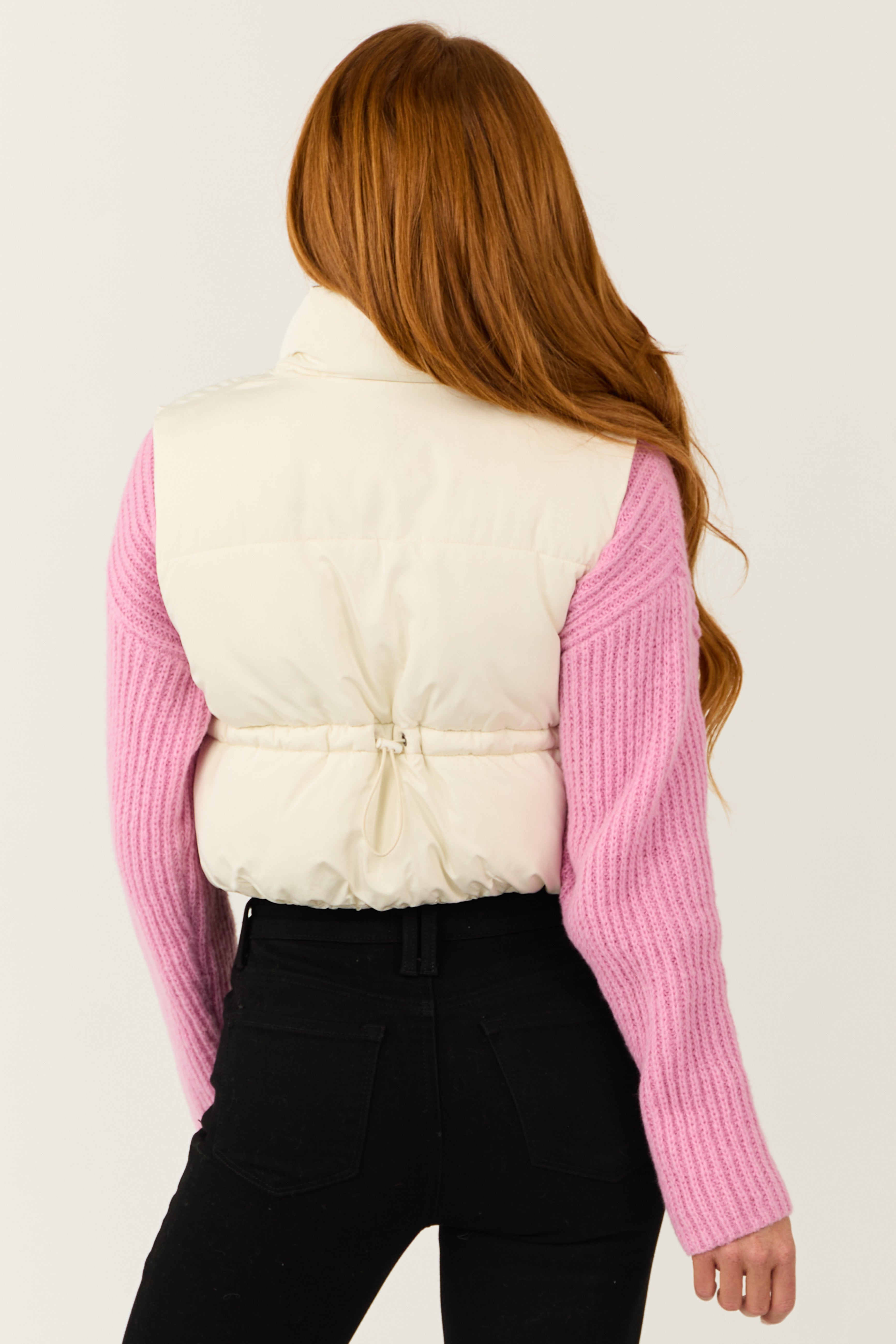 Stay cozy and stylish in this cream puffer vest featuring a mock neckline with an optional collar, side pockets, and a cinching waist tie at the back. Made of non-stretchy woven fabric with a polyester and nylon blend, this vest is lined for added warmth. Perfect for chilly days, this vest is versatile and fashionable, ideal for your daytime outings. Care instructions: Hand wash cold, flat to dry or dry clean. Available in sizes S, M, and L.