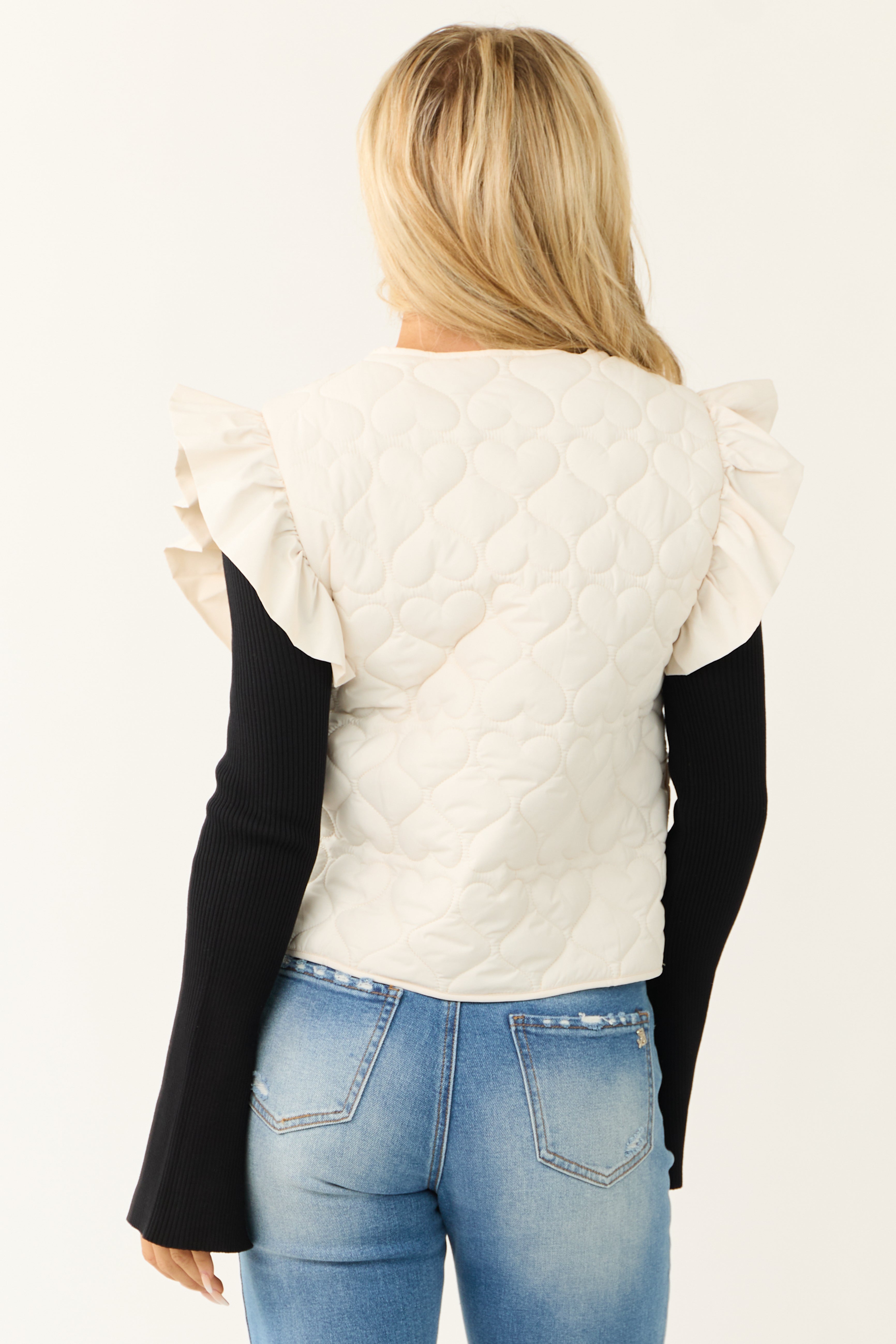 Stay stylish and warm with our Cream Quilted Puffer Vest featuring charming ruffle straps. Made of non-stretchy woven polyester, this vest comes with chest pockets and a cozy lining for added comfort. Perfect for fall, this vest is a versatile addition to your wardrobe. Available in sizes S, M, and L. Hand wash cold, line dry. Model is wearing a size Small. Ideal for layering over your favorite tops for a chic daytime look.