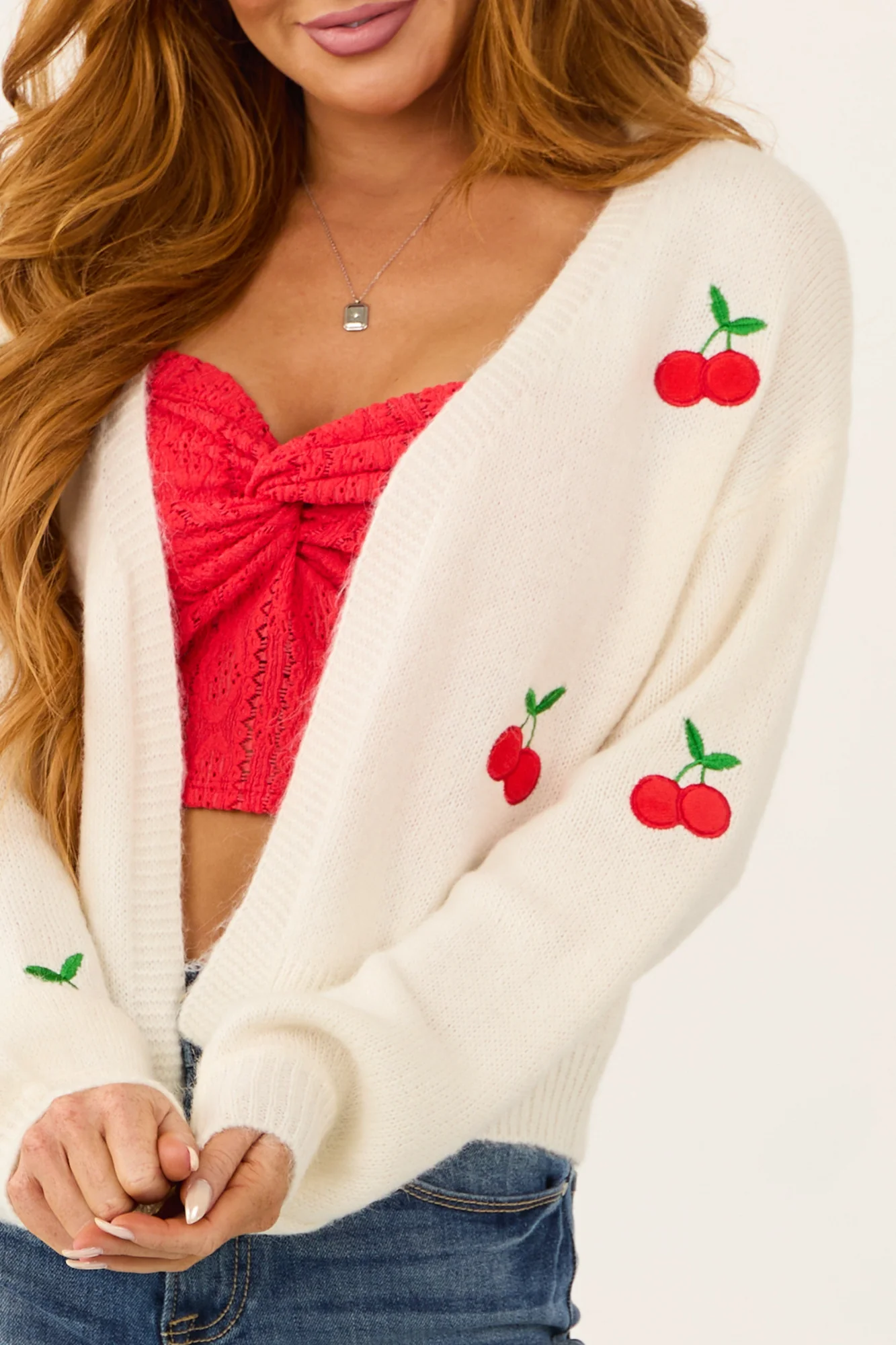 Stay cozy and stylish with our Cream Ribbed Knit Cherry Pattern Cardigan Sweater. Made of stretchy ribbed knit, featuring cherries in shades of Jade and Lipstick. This long-sleeved sweater has a drop shoulder design, ribbed banded trim, and an open front. Crafted from 85% Acrylic and 15% Polyester, it offers both comfort and style. Perfect for layering in fall and winter. Care instructions: Hand wash cold, line dry, iron on medium heat. Model is wearing size Small.