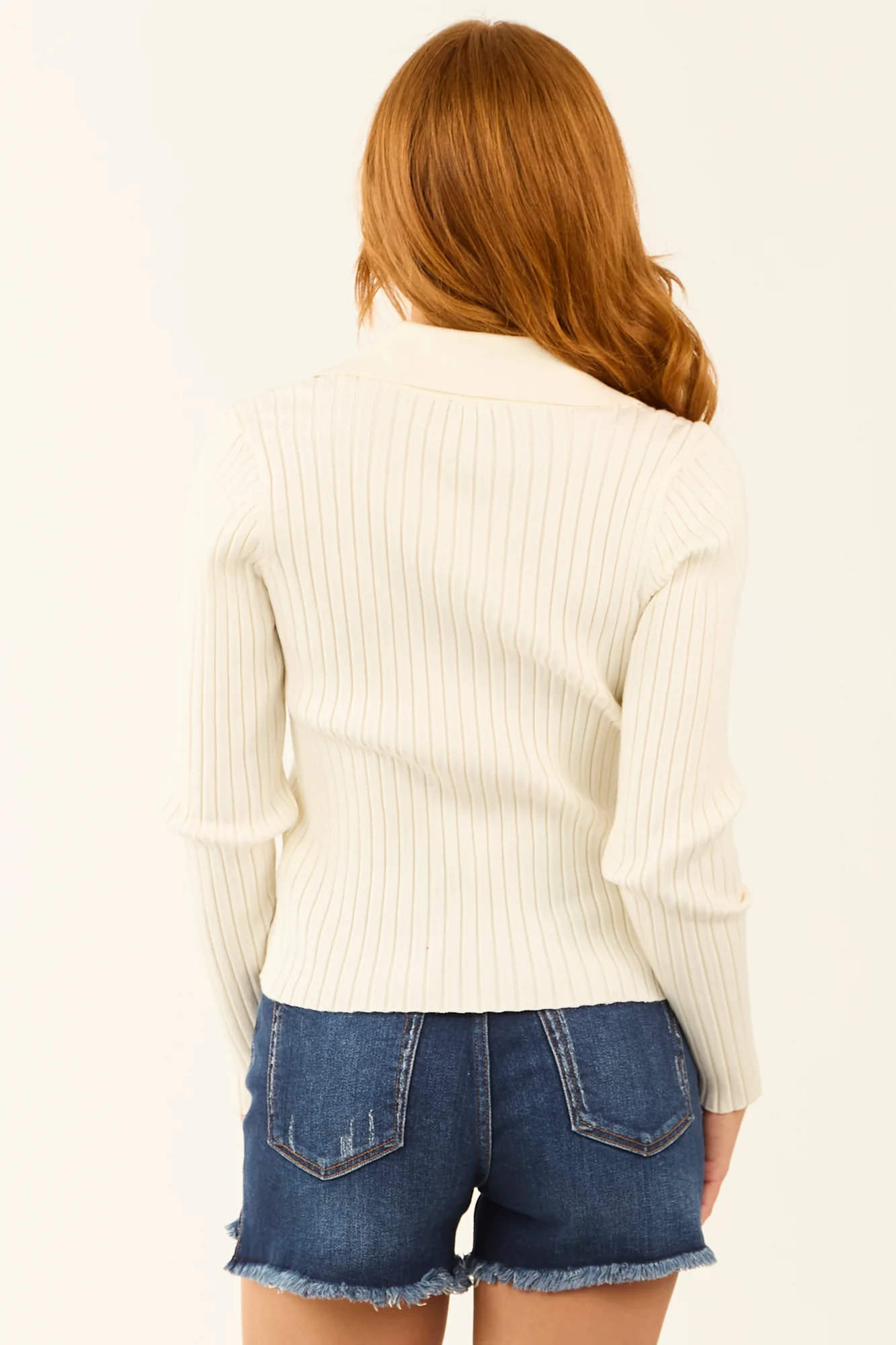 Stay cozy and stylish in this cream ribbed knit sweater featuring a flattering V-neckline. Made with a fitted, stretchy design for comfort. Crafted from 45% Viscose, 30% Nylon, and 25% Polyester blend. Perfect for everyday wear. Hand wash cold, line dry. Model is wearing size Small. Size S: Sleeve 23″, Length 22″, Bust 28″.