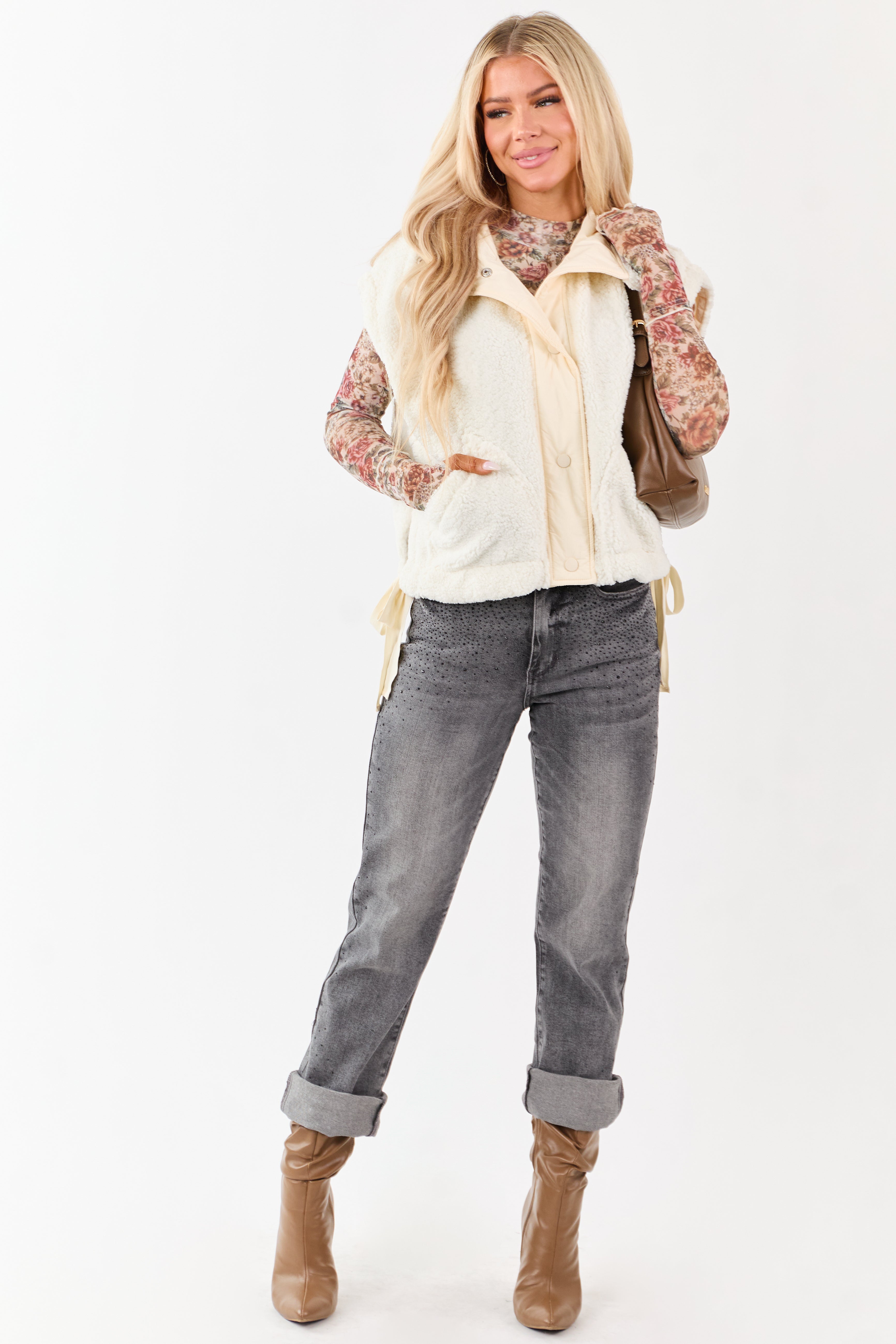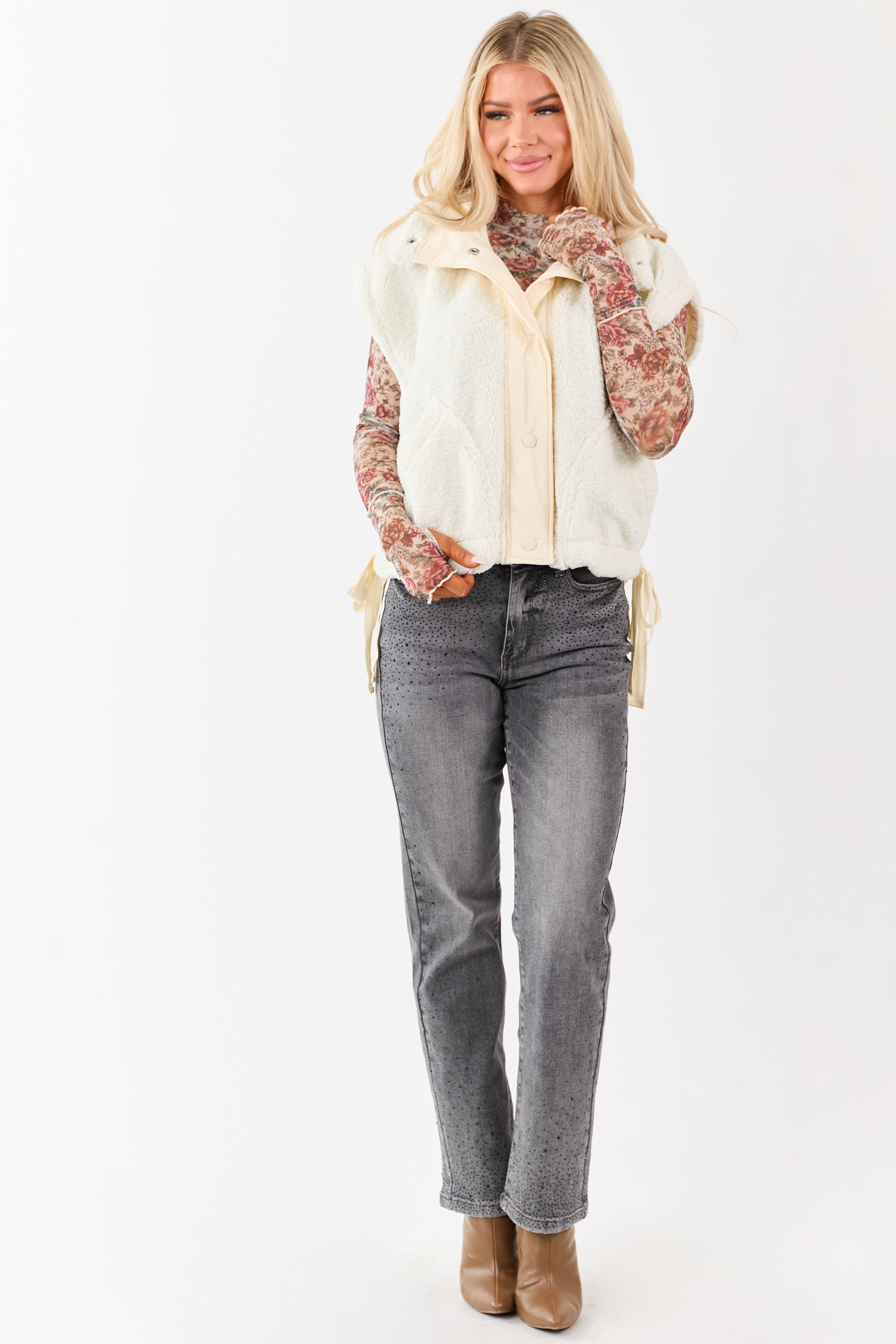 The Cream Sherpa Button Down Side Tie Vest is a versatile layering piece made of soft, neutral-toned sherpa fleece. This oversized vest features a snap button front, a stretchy sherpa collar, adjustable side tie hem, side slits, side pockets, and a comfortable lining. Perfect for all-day wear, this vest adds warmth and style to any outfit. Available in sizes S, M, and L.