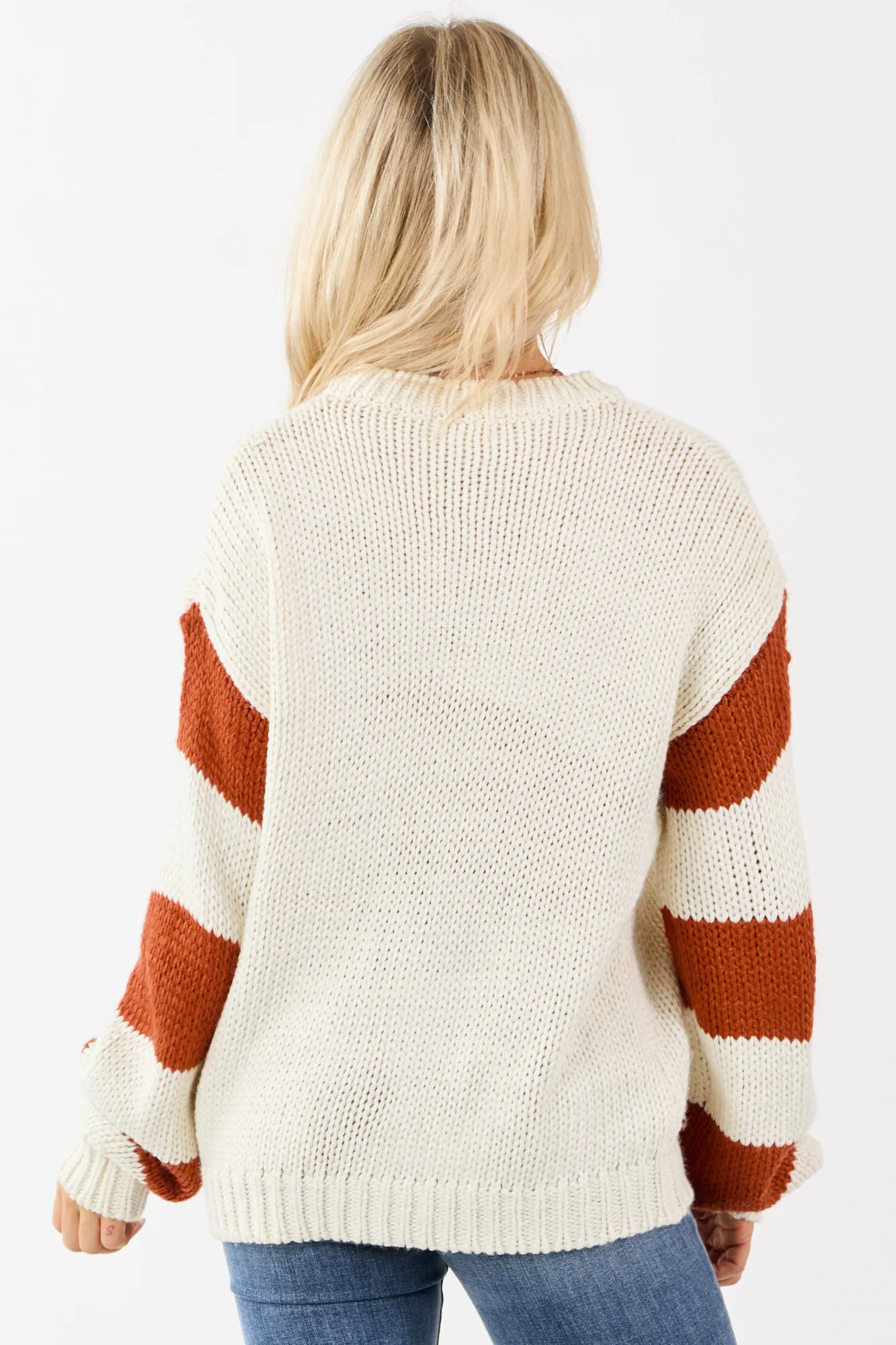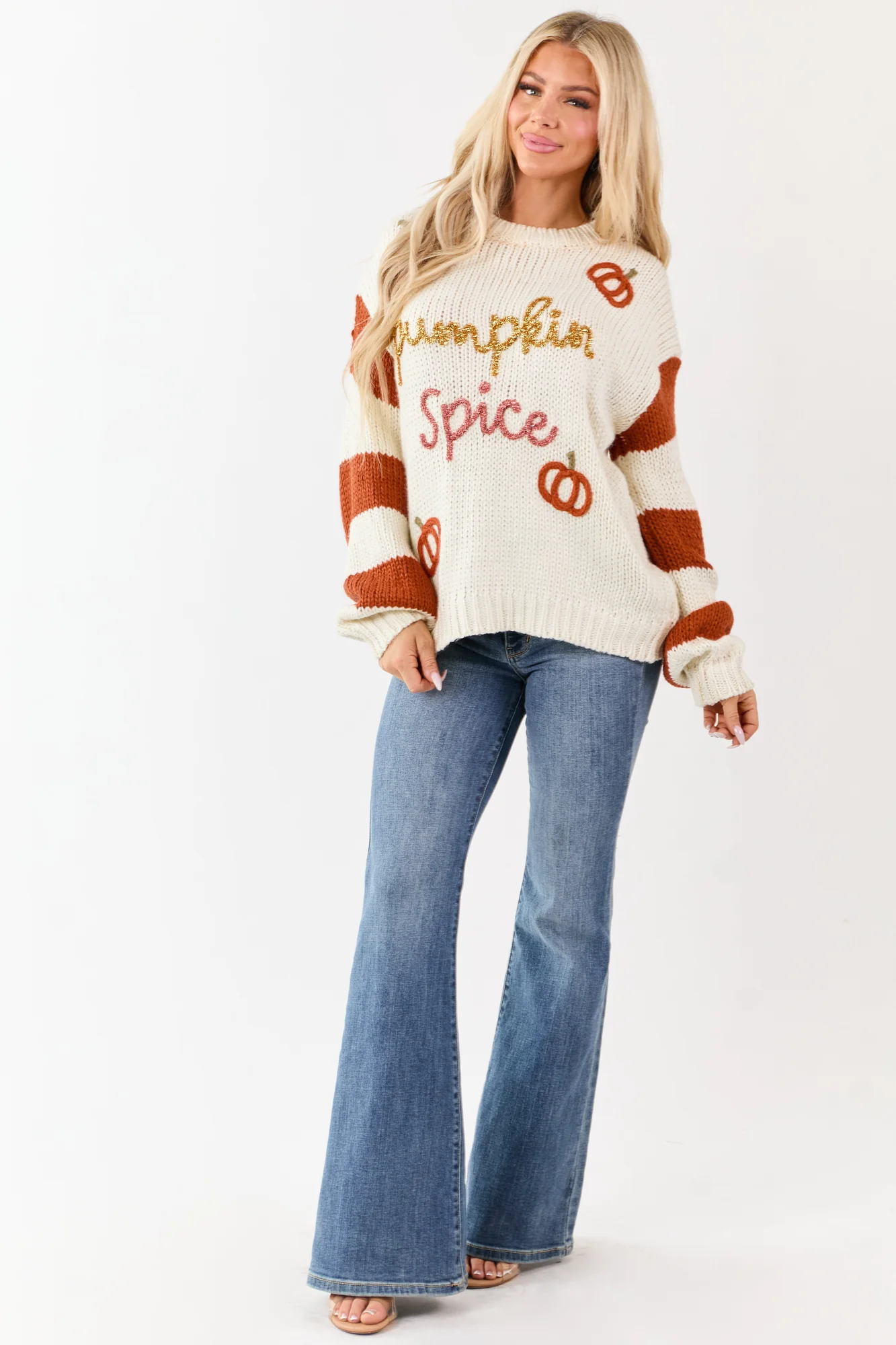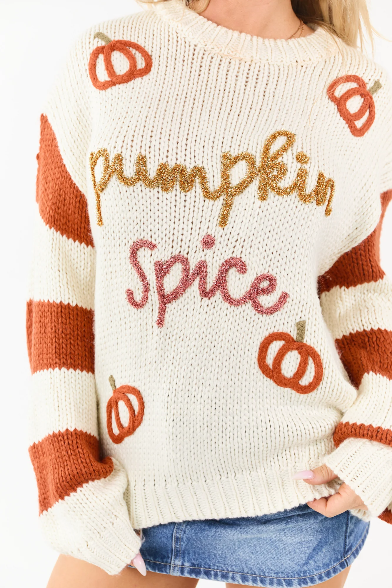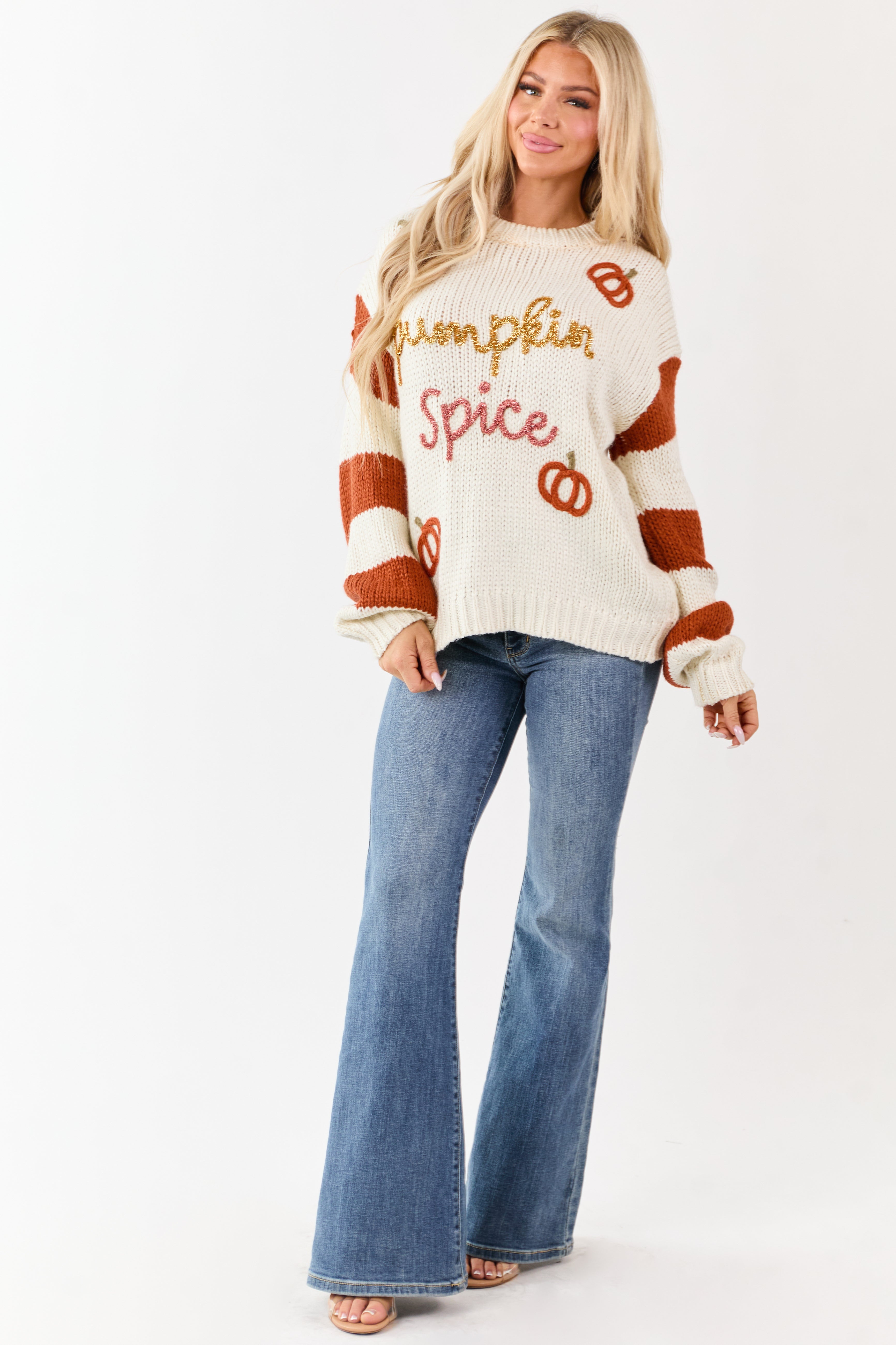 Stay cozy this fall in our Cream Soft Knit Sweater featuring a playful ‘Pumpkin Spice’ graphic. This relaxed sweater comes with lurex thread accents, striped sleeves, and a flattering fit. Made of 100% Acrylic, it features banded ribbed trim, drop shoulder design, and metallic lurex graphic in Gold and Punch hues. The pumpkins in Tawny and Sage shades complement the striped sleeves, making it a perfect choice for autumn. Available in sizes Small, Medium, and Large. Model is wearing a size Small. Stay warm, stylish, and comfortably chic in this trendy piece.