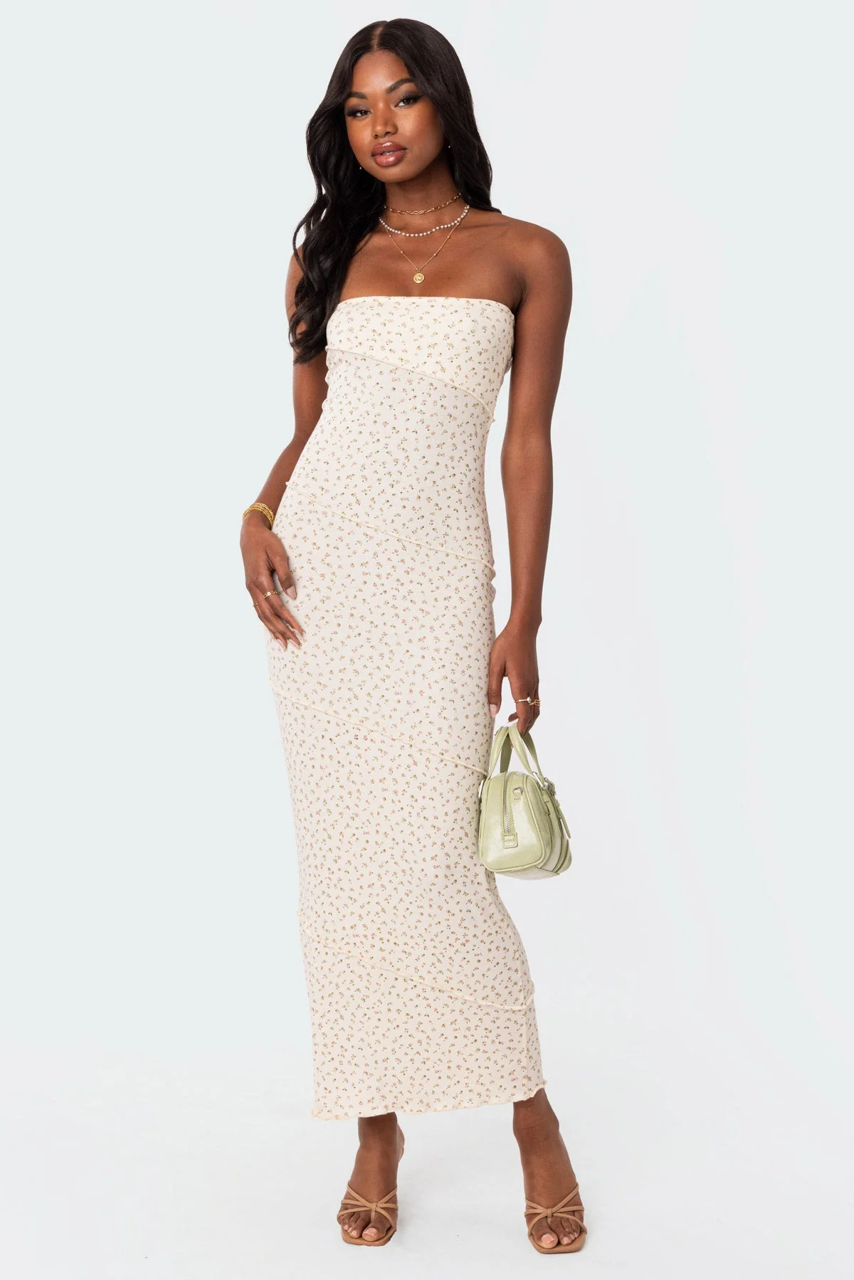 Indulge in effortless elegance with our cream strapless ribbed maxi dress for women. Featuring a charming flower print on soft polyester and spandex fabric. This dress is perfect for any occasion, from daytime gatherings to evening soirees. The strapless fit exudes confidence, making it a versatile addition to your wardrobe. Available in sizes XS to XL, ensuring a flattering fit for every body type. Elevate your style with this must-have piece. Model wears size S. Model height is 59. Care Instructions: Wash with similar colors.