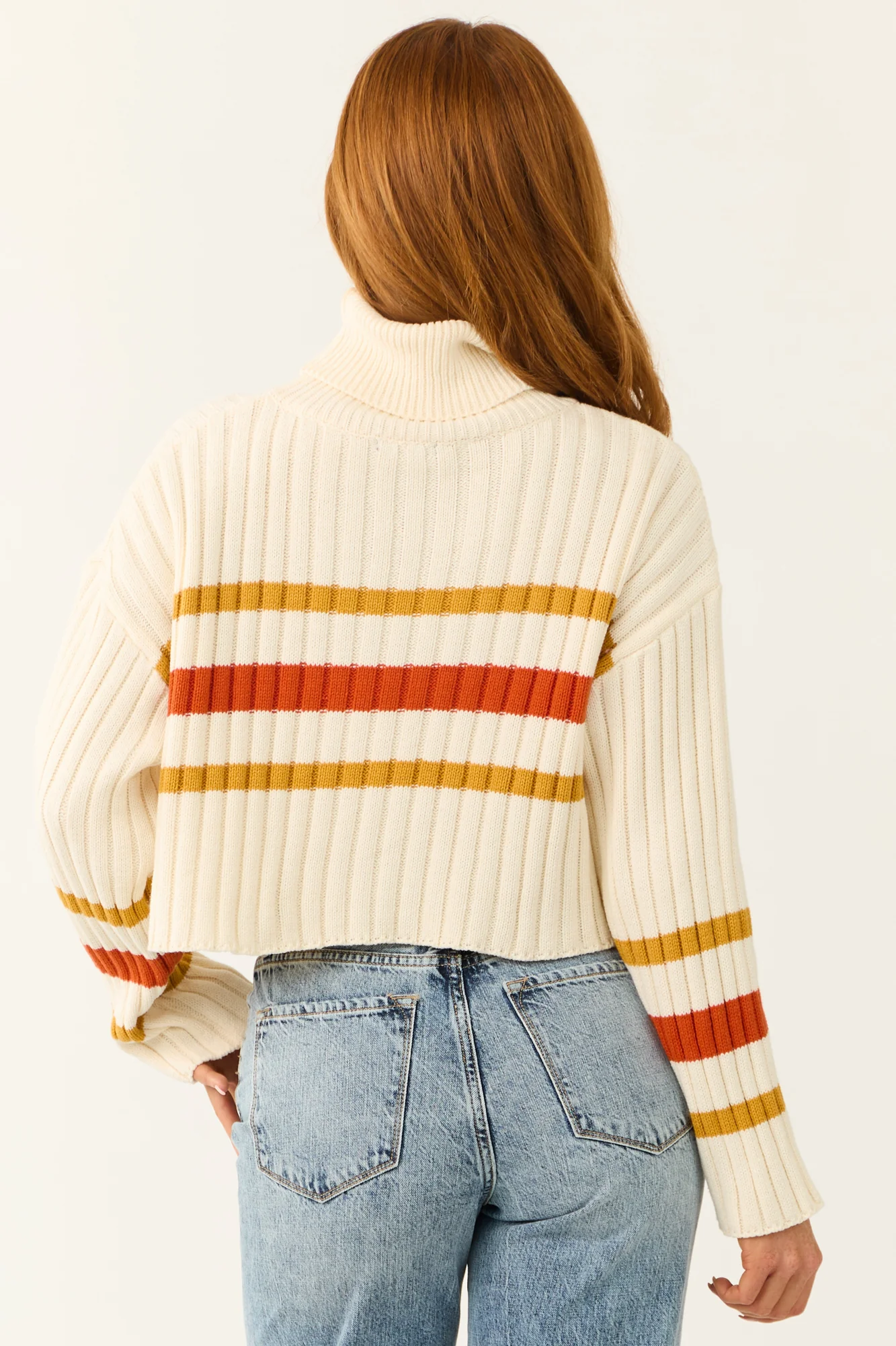 Stay cozy and stylish with our Cream Striped Cropped Sweater featuring a turtleneck design. Made from stretchy ribbed knit in Cream, Mustard, and Rust shades, this sweater offers comfort and style. The long sleeves, drop shoulder, and imported cotton-acrylic blend ensure a trendy look. Perfect for fall and winter seasons. Hand wash cold and hang dry. Available in sizes S, M, and L.