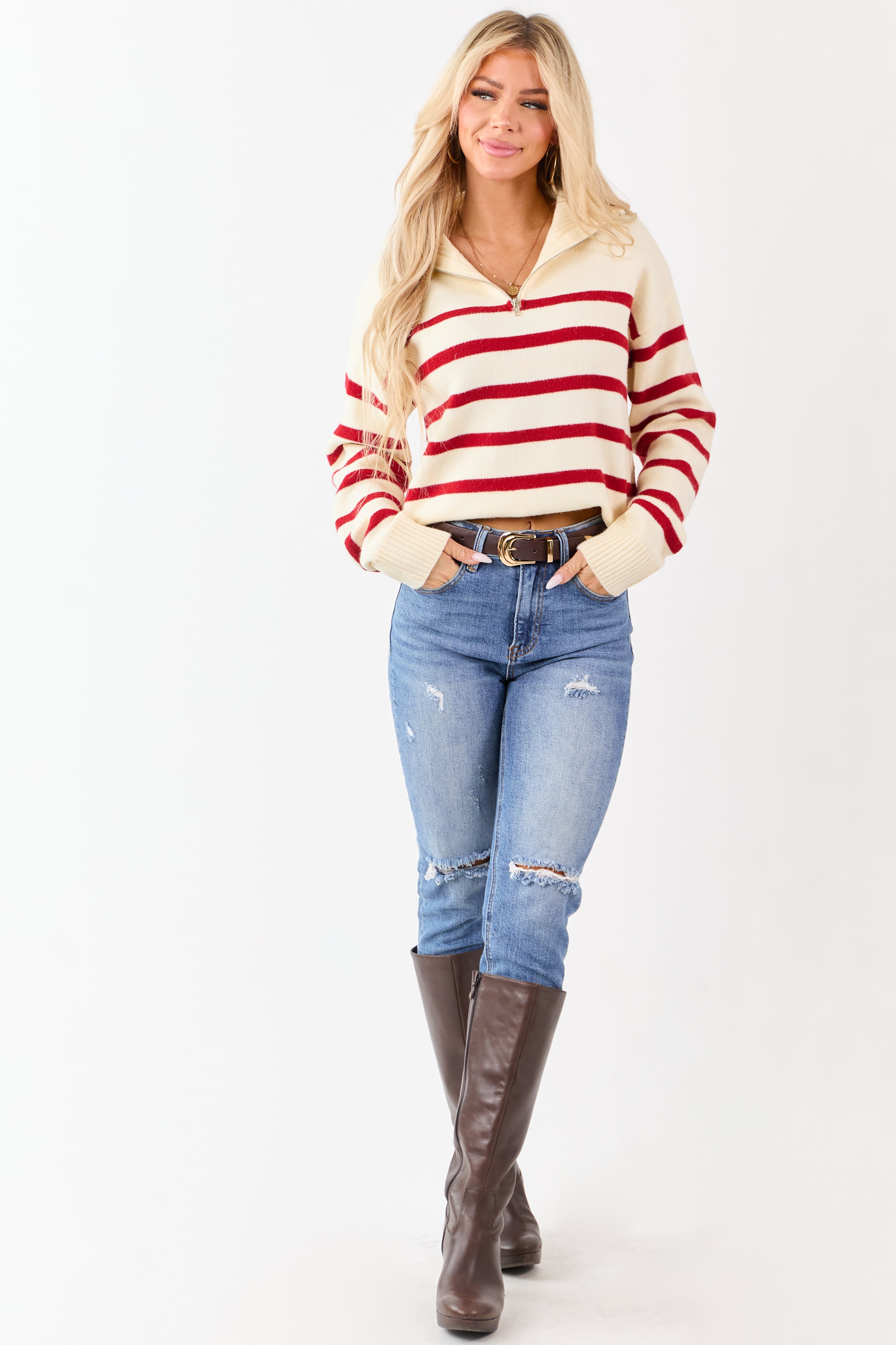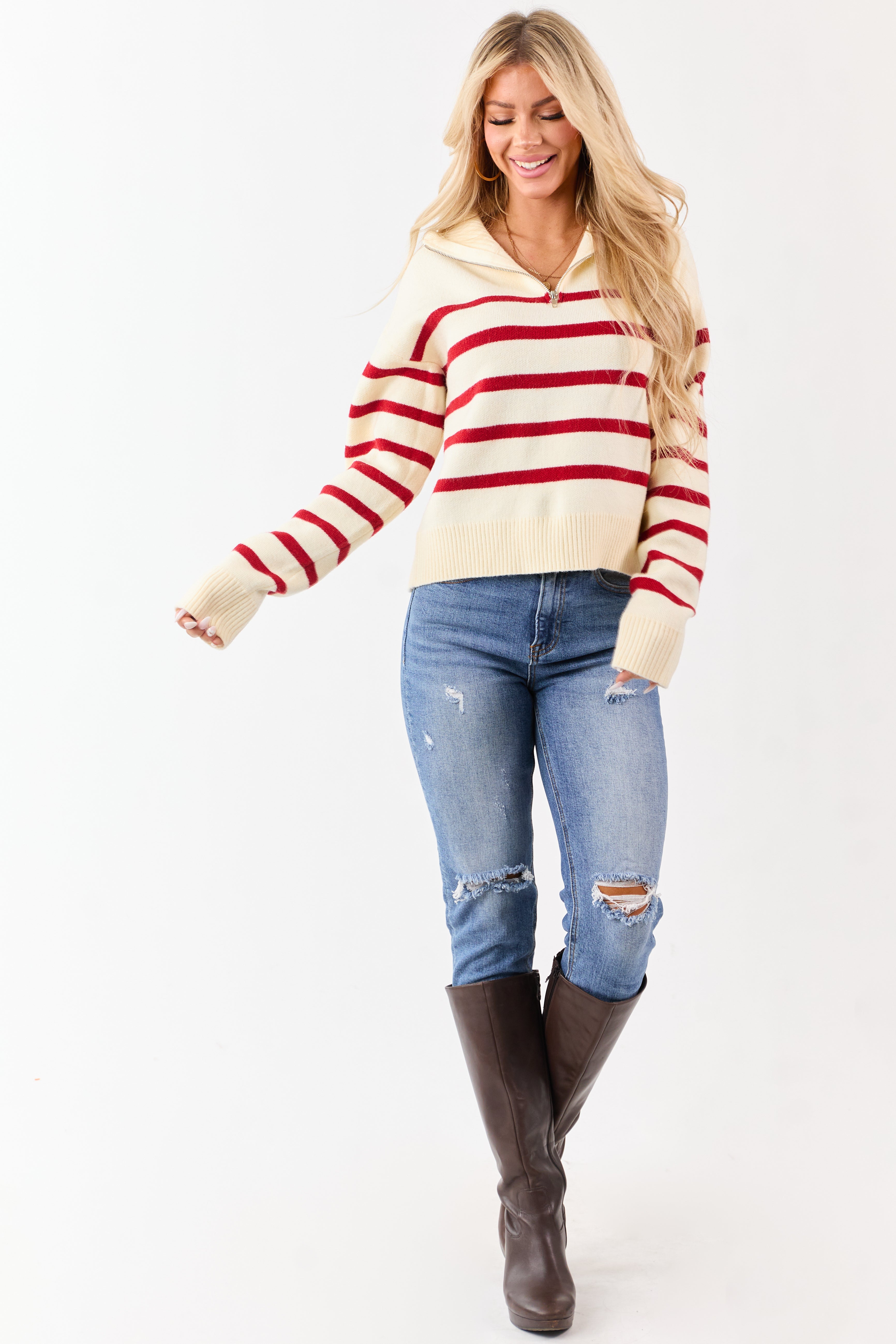 Add a touch of classic charm to your wardrobe with this cream striped knit sweater. Featuring a stylish half zip-up front and a soft knit texture, this sweater is designed for comfort and elegance. The stretchy ribbed knit fabric, drop shoulder design, collared neckline, and banded trim enhance the overall appeal. Made of 62% Polyester, 28% Nylon, and 10% Acrylic, this imported sweater is a versatile addition to your collection. Please note that variations may occur due to the fabrics print and the cutting process, ensuring each piece is unique. Model is wearing a size Small. Model’s Profile: Size 3, Height 57″, Bust 35″, Waist 26″.