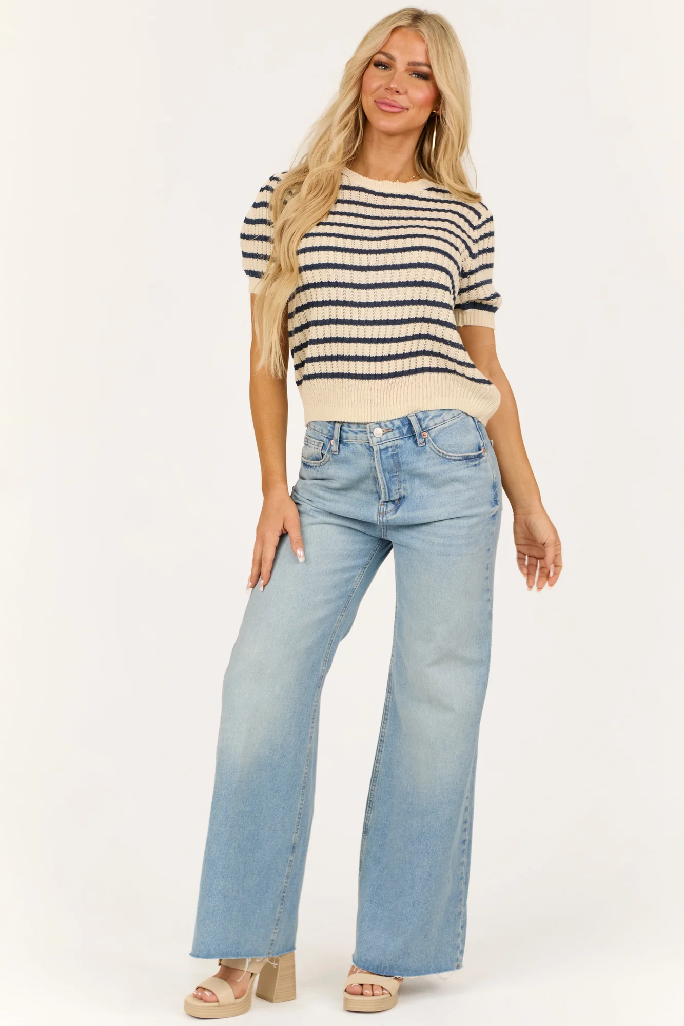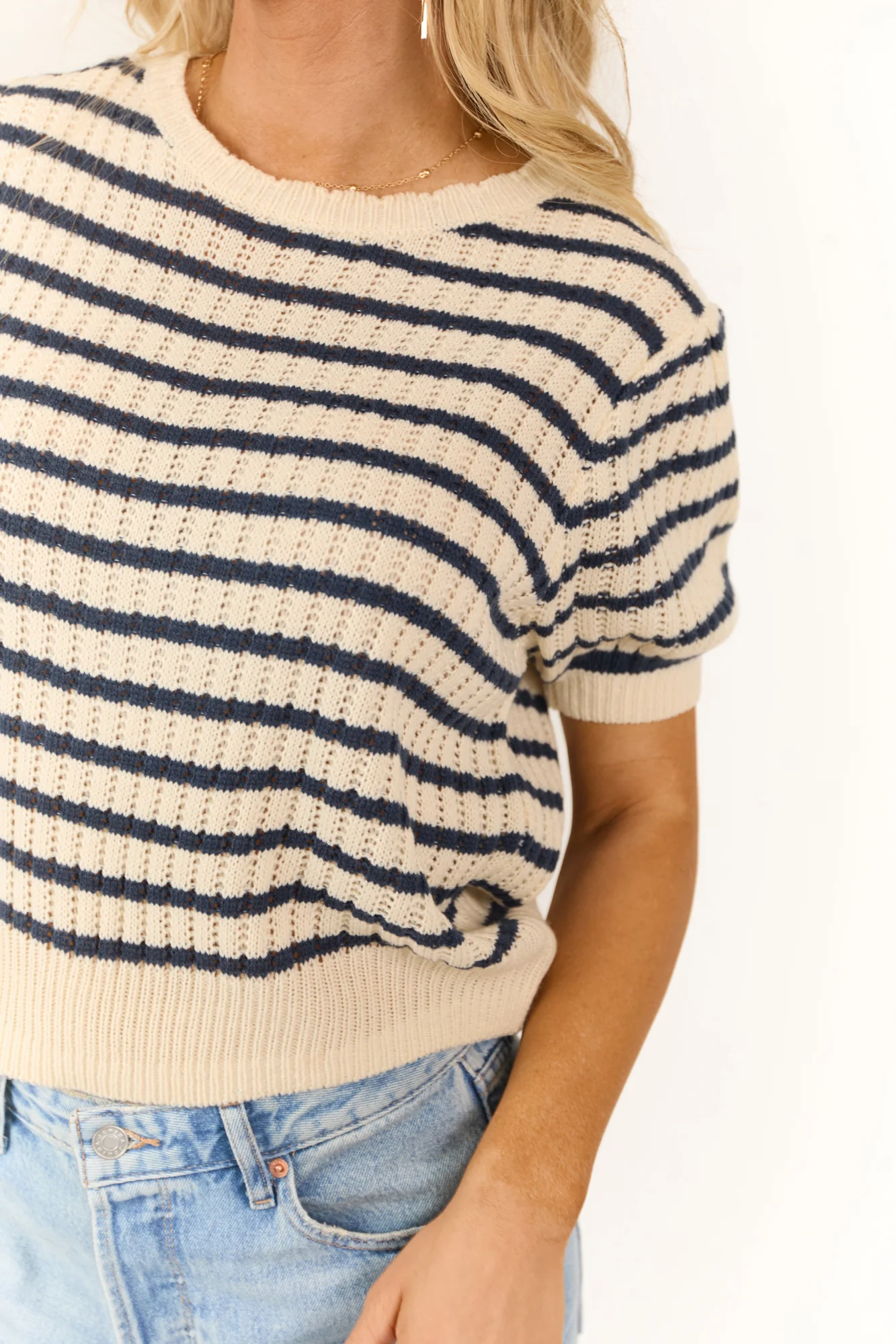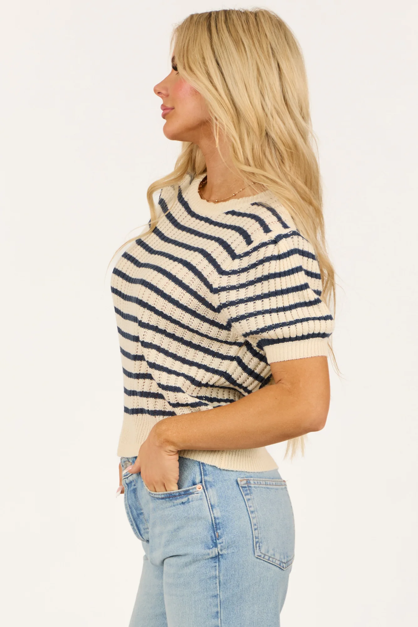 Stay stylish and comfortable with our Cream Striped Knit Short Sleeve Sweater in sizes S, M, and L. Made from stretchy knit with stripes in shades of Cream and Steel Blue, this sweater features banded trim and is crafted with 100% Acrylic for a cozy feel. Perfect for casual or daytime wear, the versatile design ensures a perfect fit. Hand wash cold, lay flat to dry, and avoid ironing to keep it looking its best. Each piece is unique due to the fabric print and hand-sewn nature. Feel confident and chic with this trendy piece. Model is wearing a size Small.