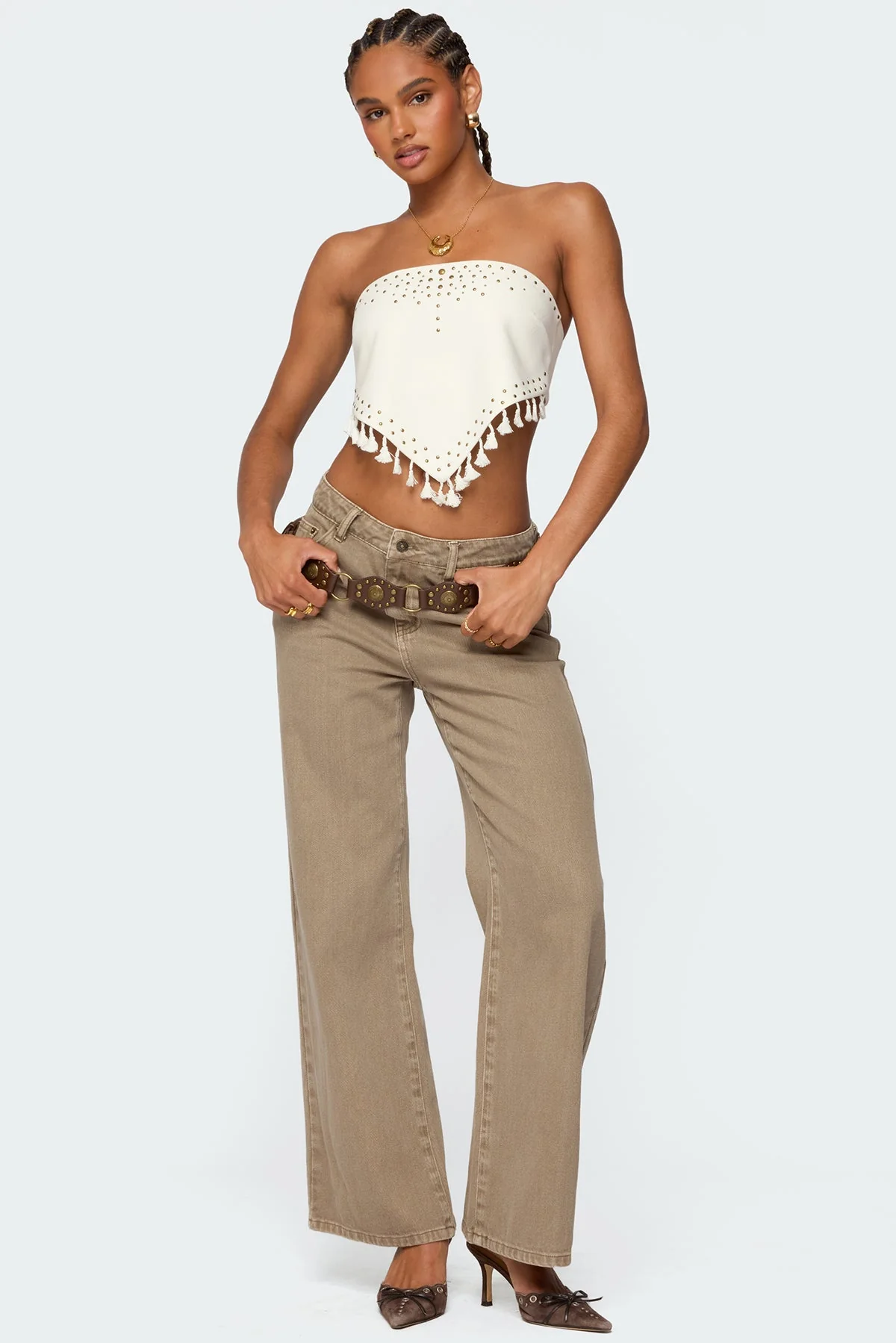Experience elegance and style in our cream Stud & Tassel Strapless Top. This top features a handkerchief design with studded detailing, an open back, and a tassel hem for a unique touch. Made of high-quality polyester and spandex blend for comfort and durability. Perfect for any occasion. Models wear sizes ranging from XS to XL. Item care instructions: Hand wash, do not bleach, do not tumble dry, do not iron, do not dry clean.