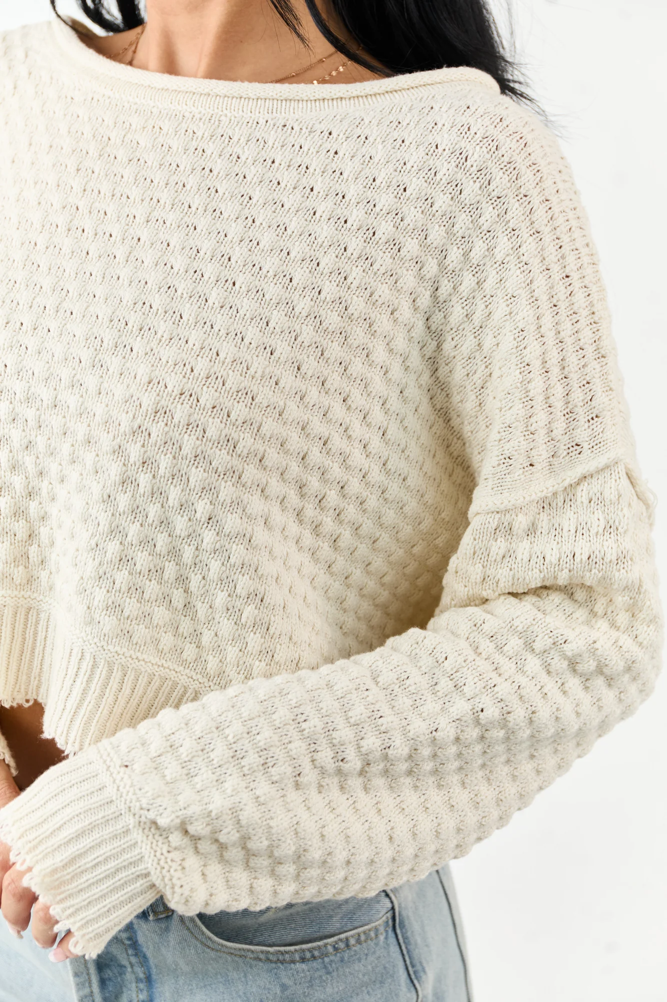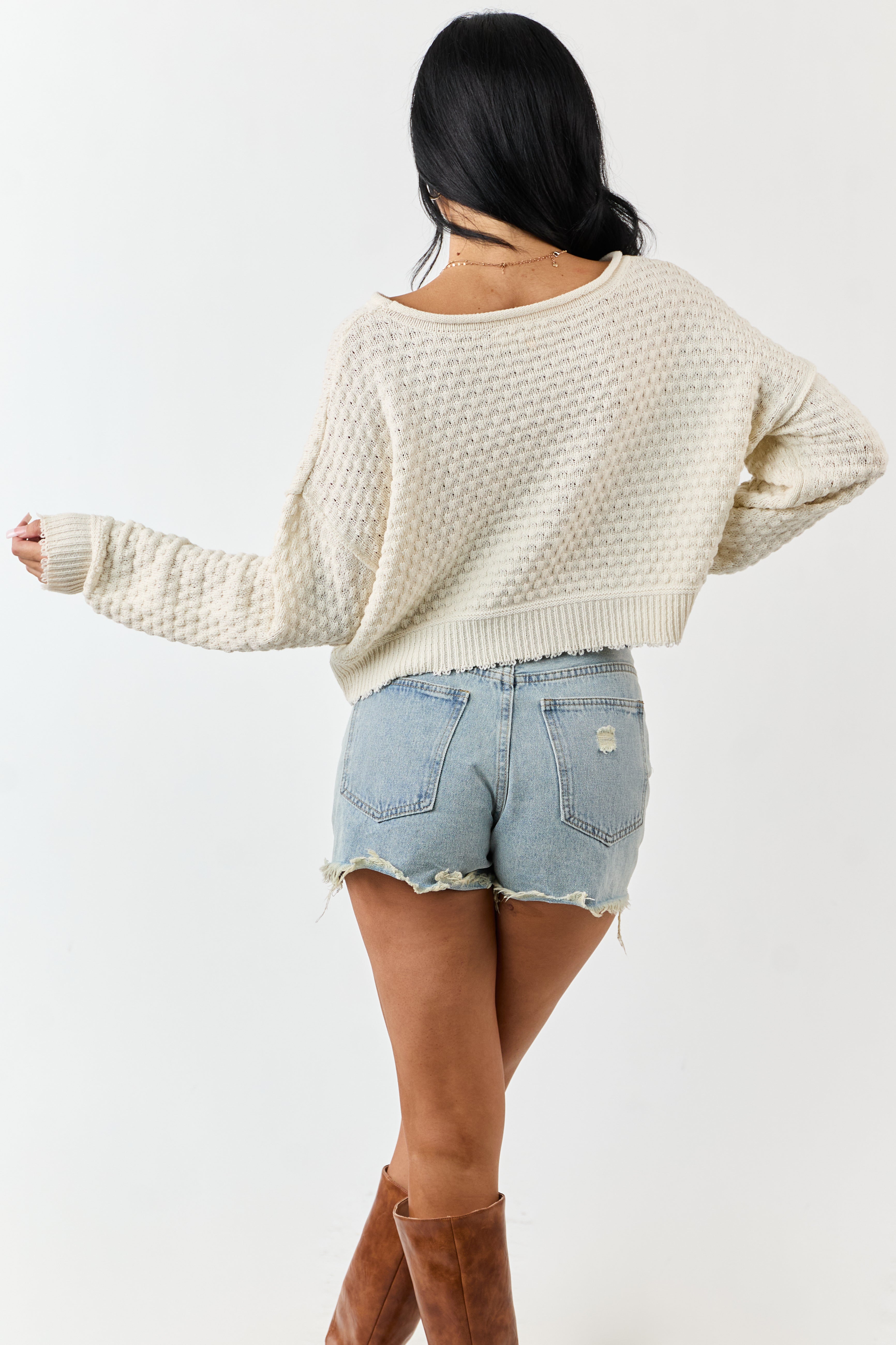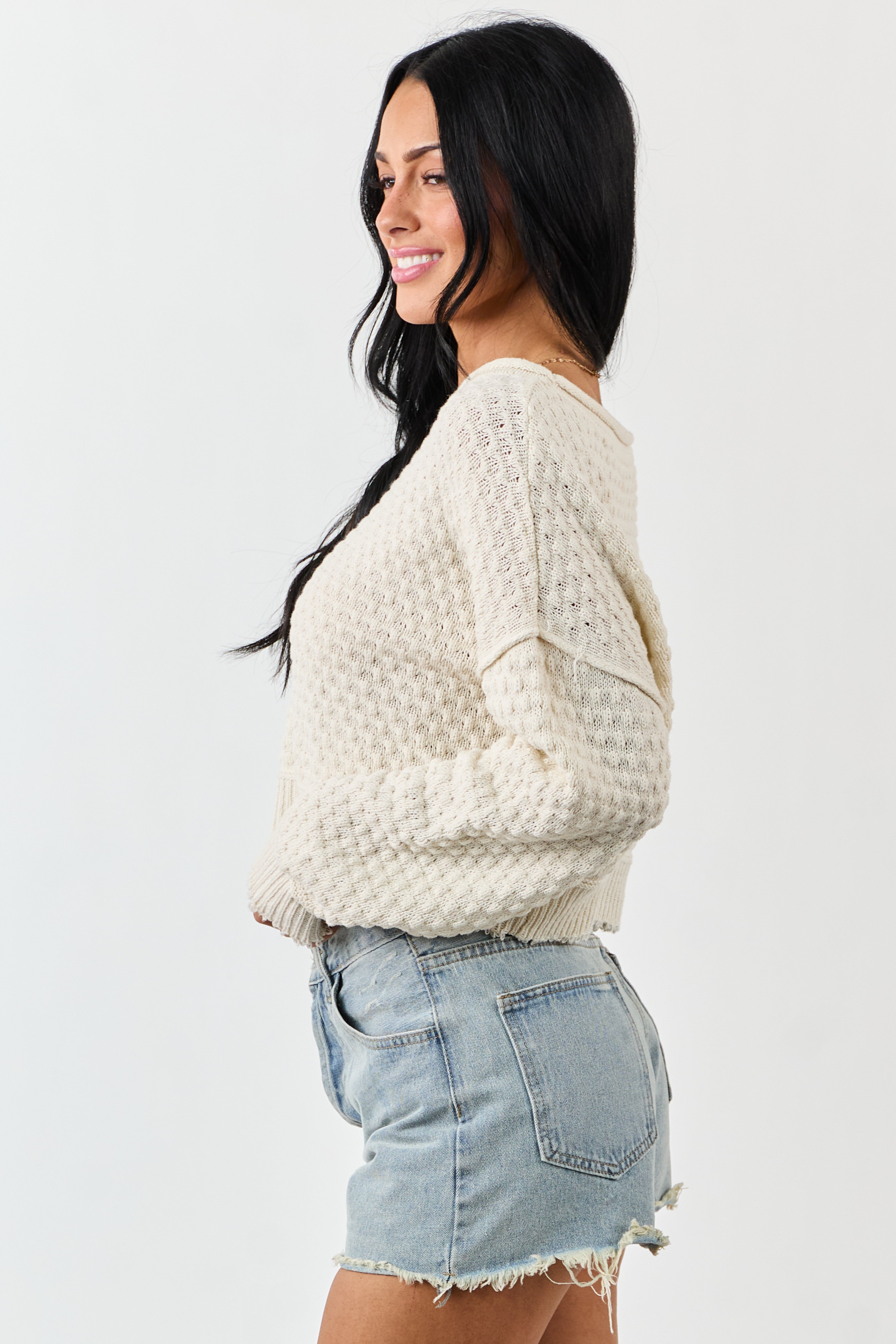 Experience ultimate comfort and style with our Cream Textured Knit Boxy Sweater. This soft and stretchy sweater features a unique bramble knit texture, rolled neckline, drop shoulders, and ribbed trim. The slightly frayed hem and semi-cropped design give it a trendy, lived-in look. Made from 60% Cotton and 40% Acrylic, this oversized sweater is perfect for casual outings or lounging. Available in sizes S, M, and L.