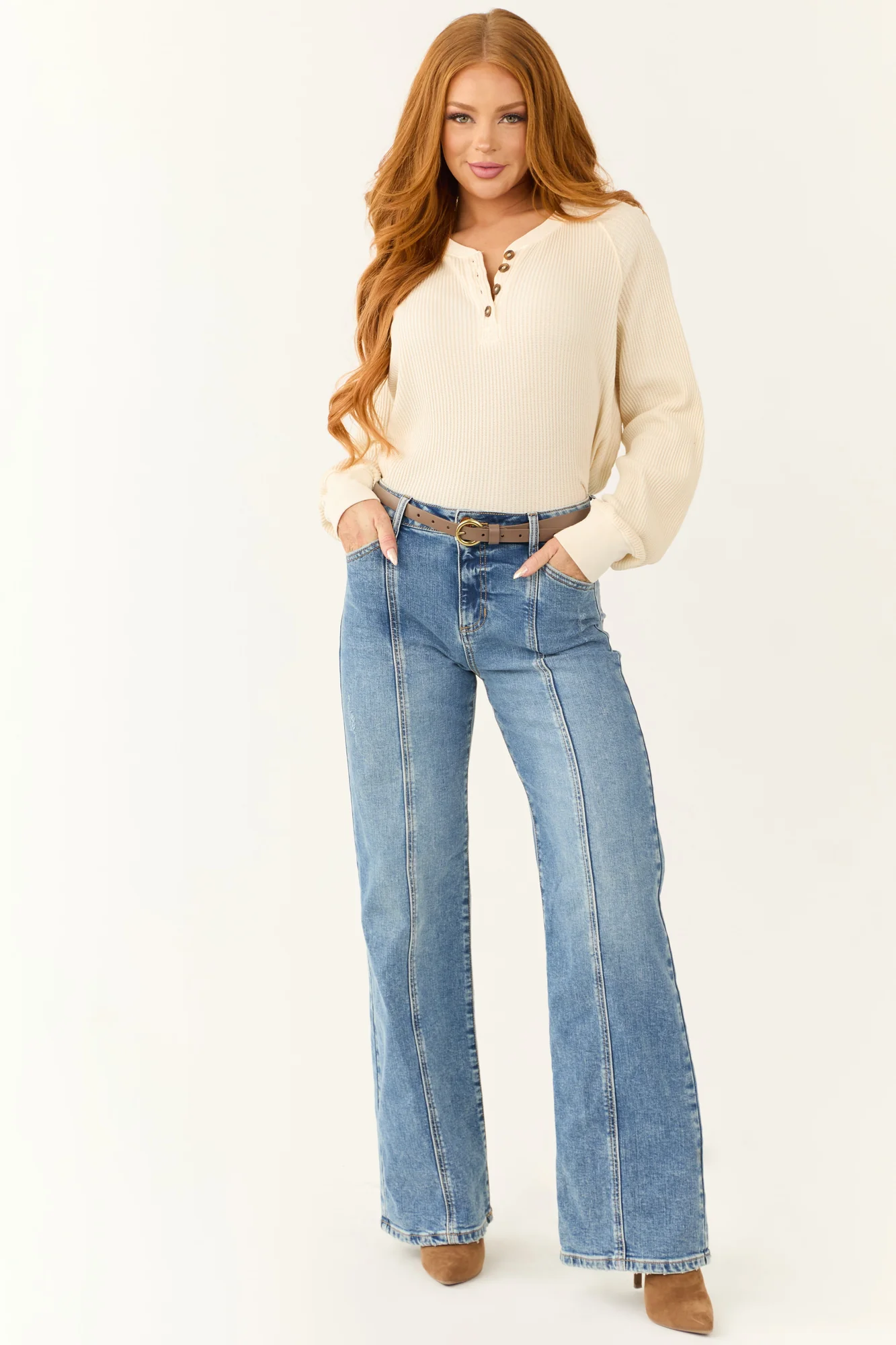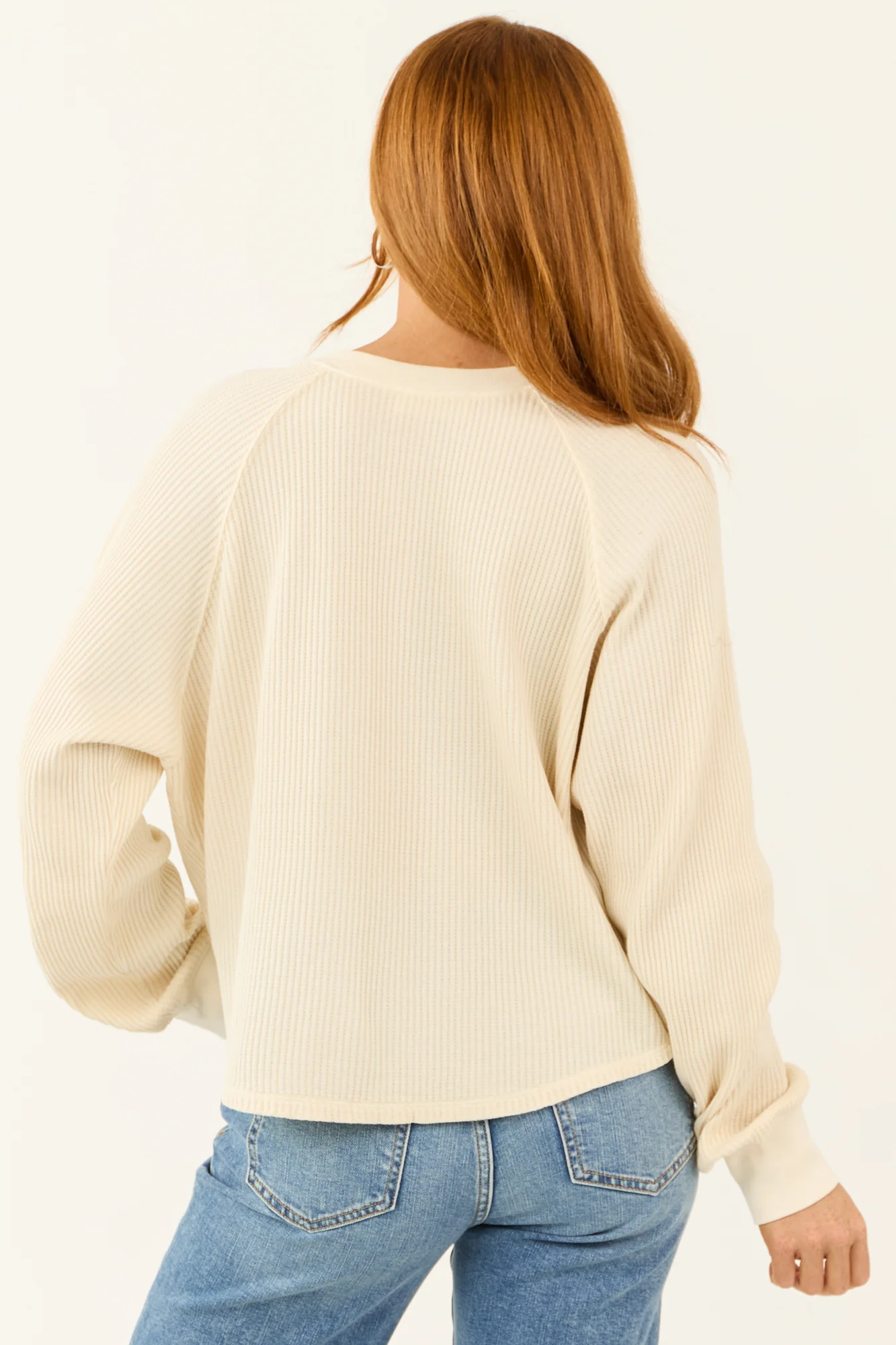 Elevate your wardrobe with our Cream Waffle Knit Button-Up Top. Designed for comfort, this oversized top features long raglan sleeves, ribbed banded trim, and a round hemline. Made from 100% Cotton for a cozy feel. Available in sizes S, M, and L. Perfect for casual or daytime wear during the fall season. Add this stylish piece to your collection today!