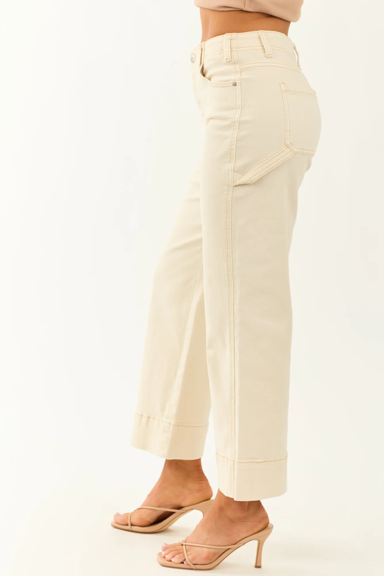 Achieve a chic and sophisticated look effortlessly with our Cream Wide Leg Stretchy Jeans. These high-rise jeans feature a tummy control waistband and cropped ankle length for added style. Made of semi-stretchy denim blend (93% Cotton, 5% Polyester, 2% Spandex), they offer both comfort and fashion. The five functional pockets, utility strap, and belt loops enhance the utility, while the zipper fly with button closure ensures a secure fit. Ideal for various occasions, these jeans are a wardrobe essential. Size 3 measurements: Waist (25″), Hips (35″), Inseam (27″).
