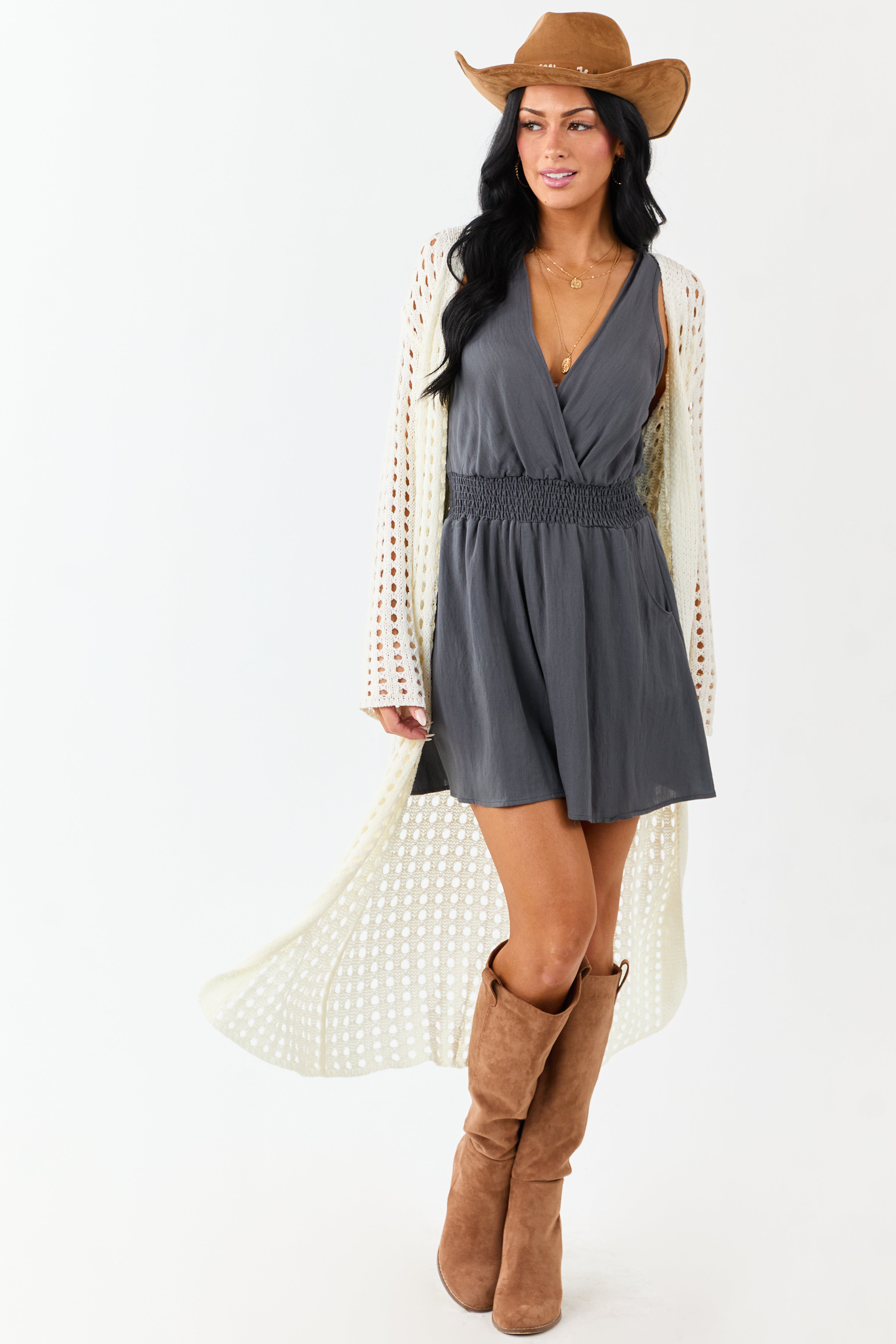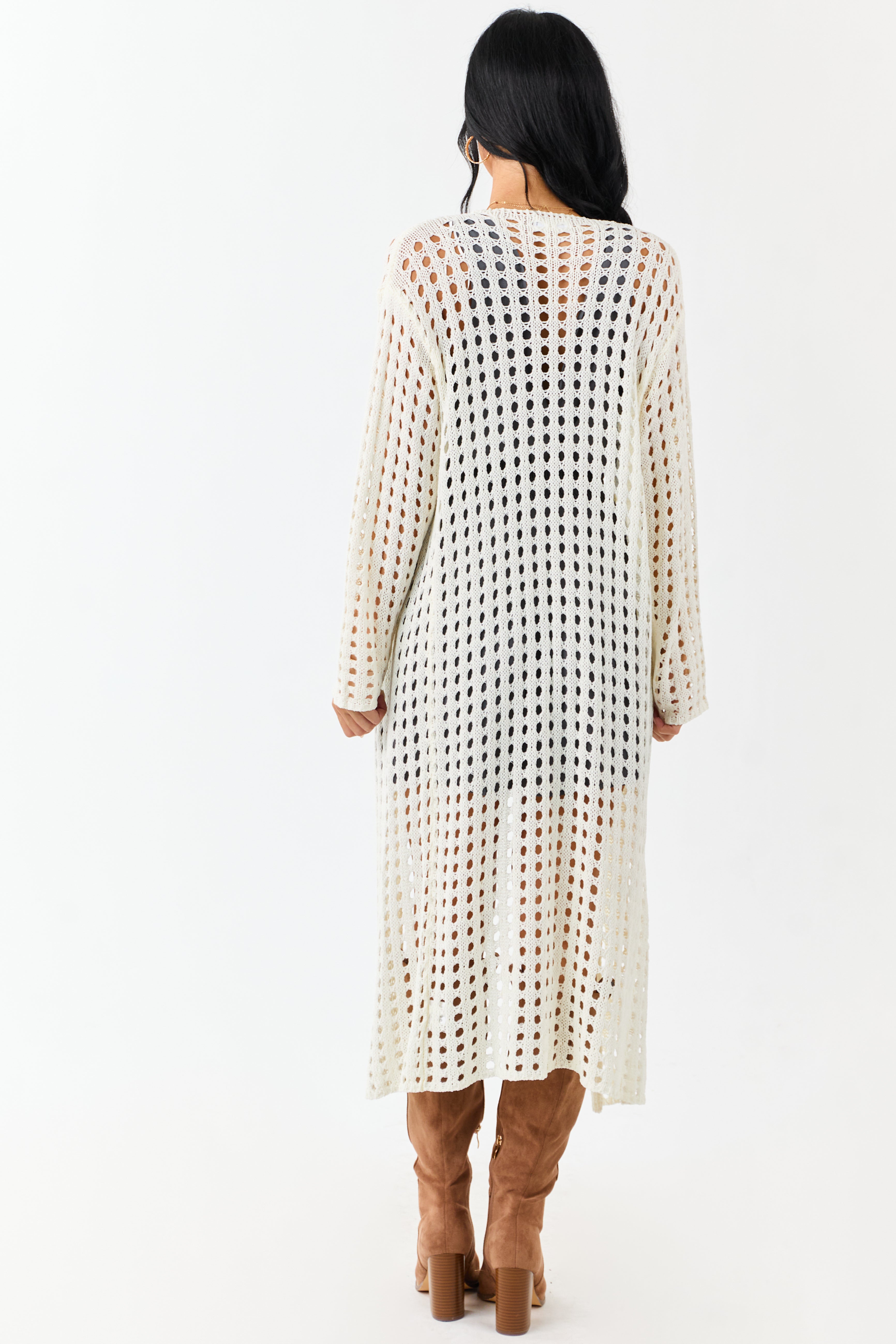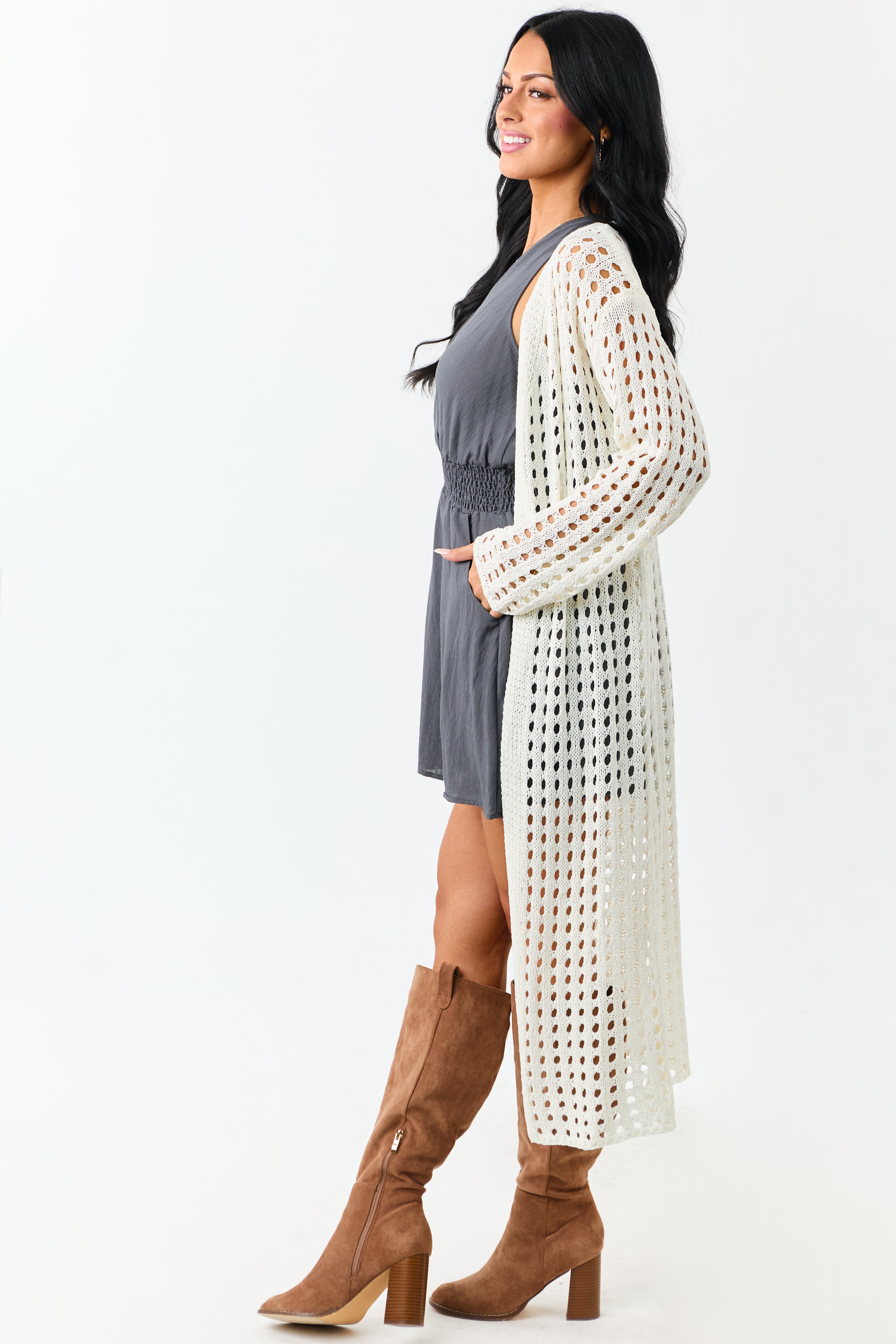 Stay chic and cozy with our Cream Wide Sleeve Knit Cardigan. Crafted from a blend of 75% Viscose and 25% Nylon, this duster cardigan features a breezy open knit design, stretchy fabric, ribbed trim, and drop shoulders for a relaxed fit. Perfect for layering over any outfit, this boho-inspired cardigan is a versatile addition to your wardrobe. Available in sizes S, M, and L with lengths ranging from 44″ to 46″. Model is wearing a size Small. Elevate your style with this must-have piece!